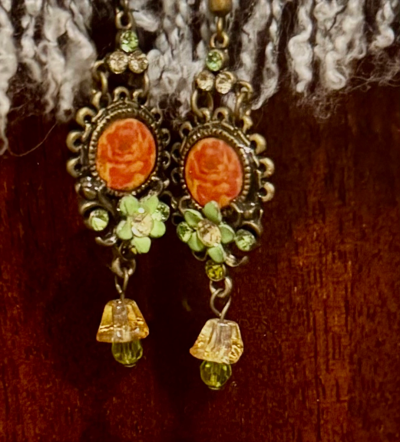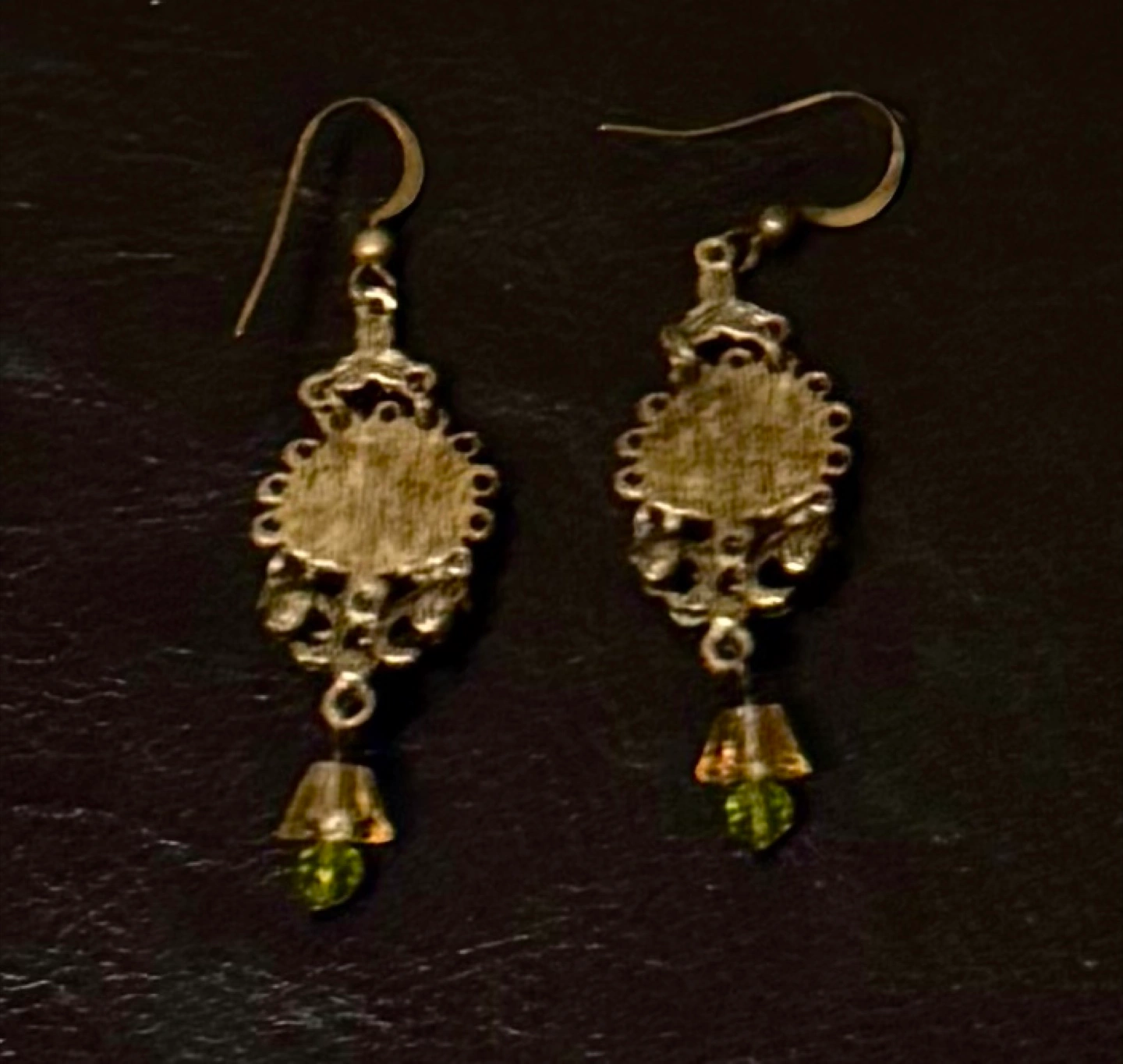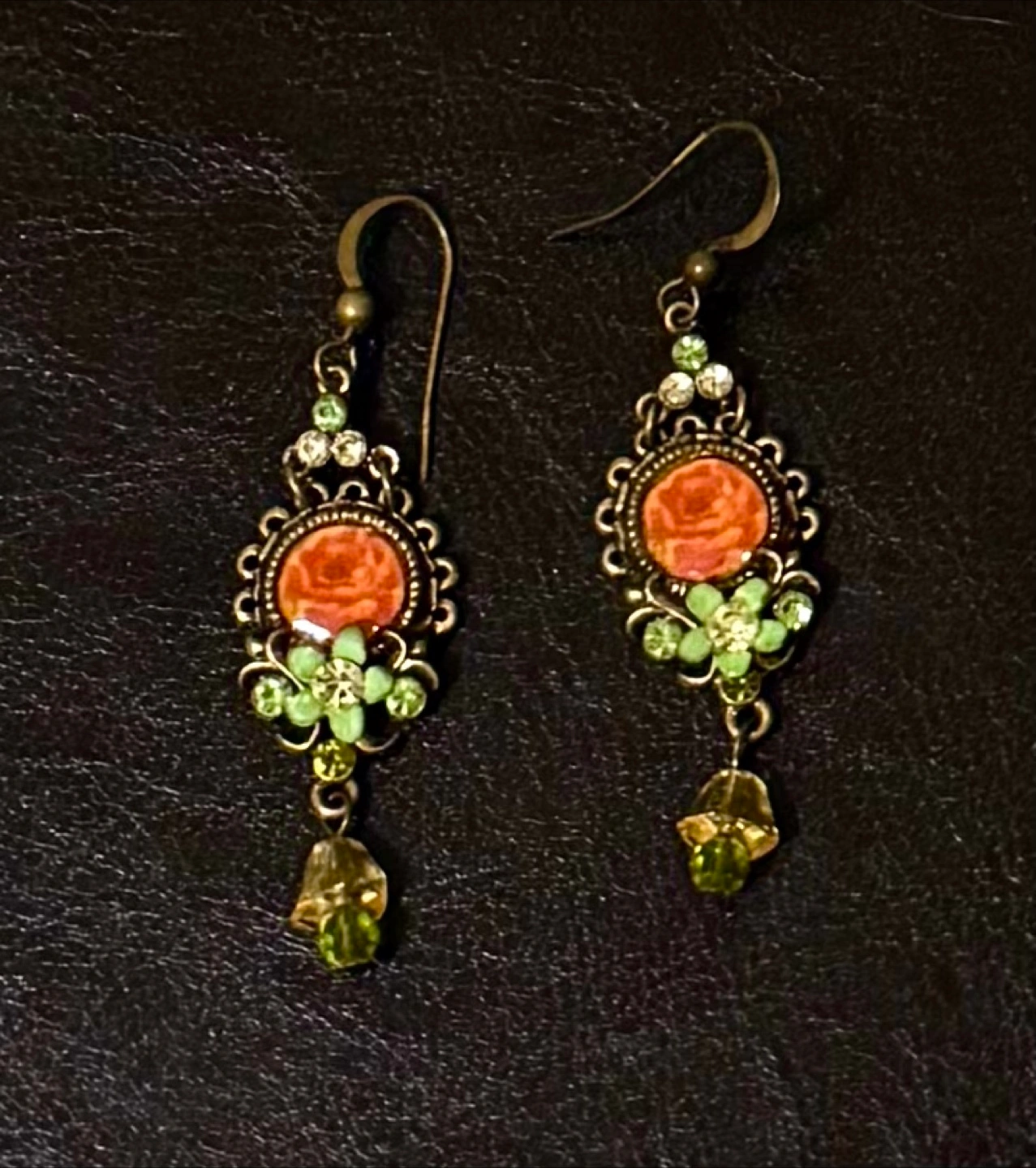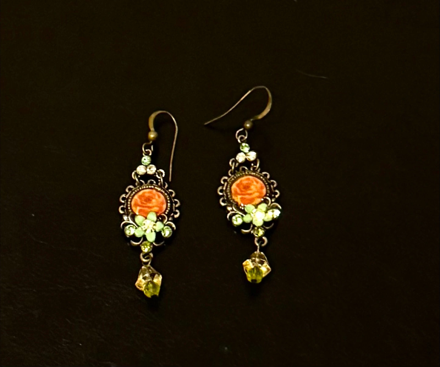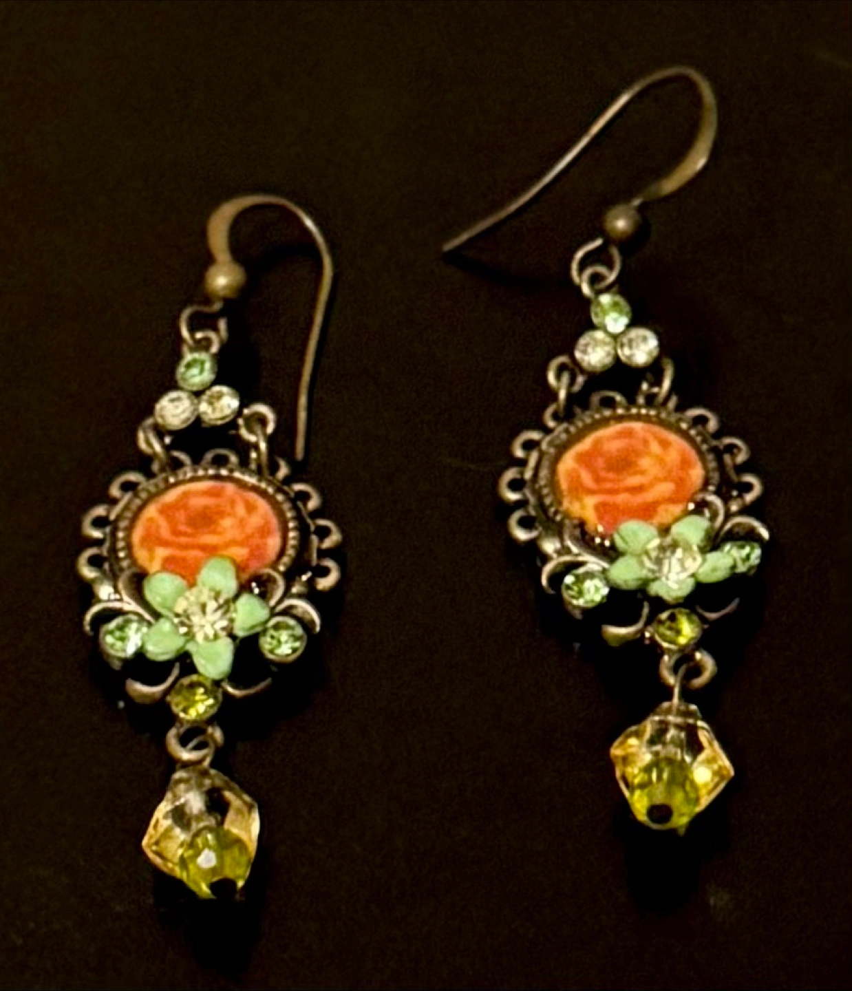 These exquisite vintage antique deco art drop earrings feature intricate floral designs with vibrant green and yellow accents,