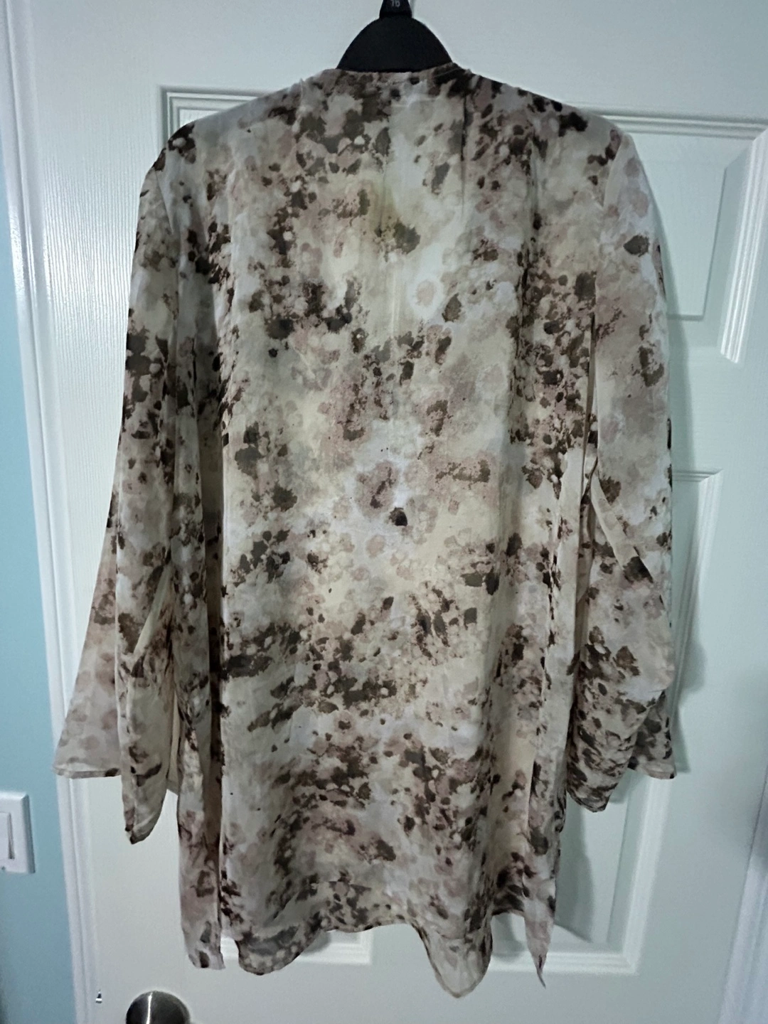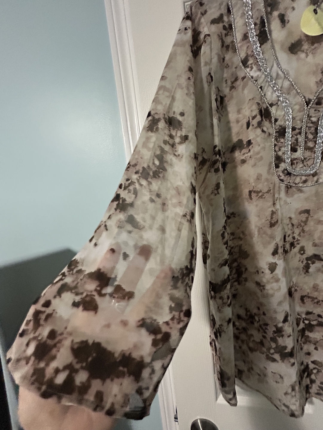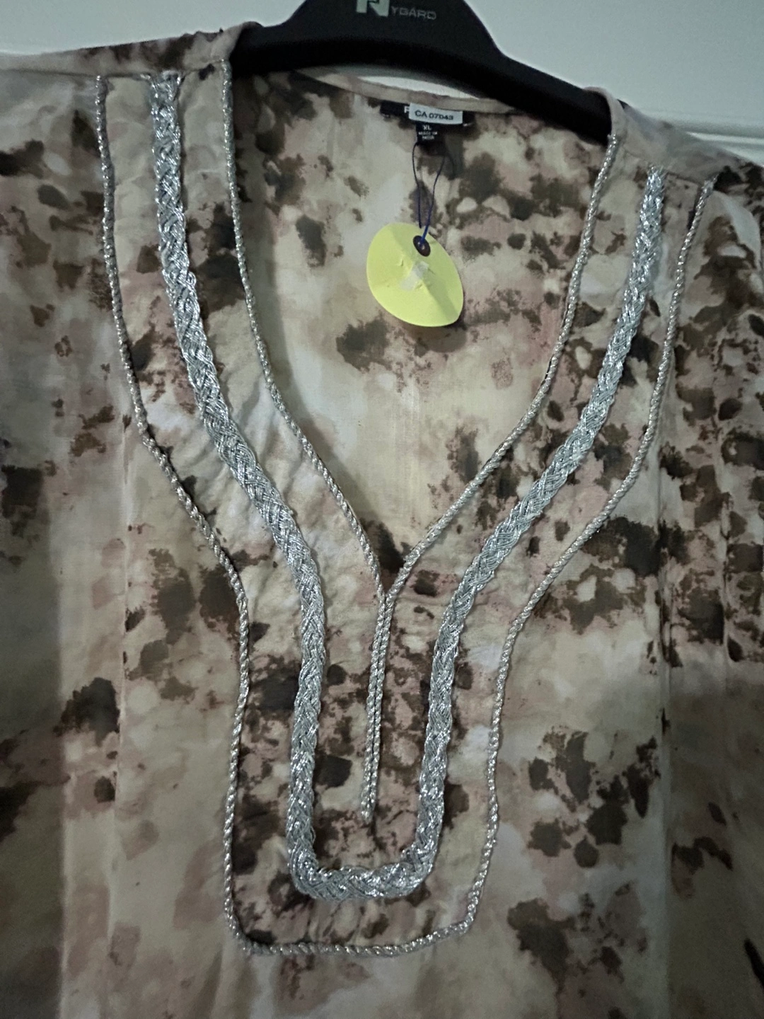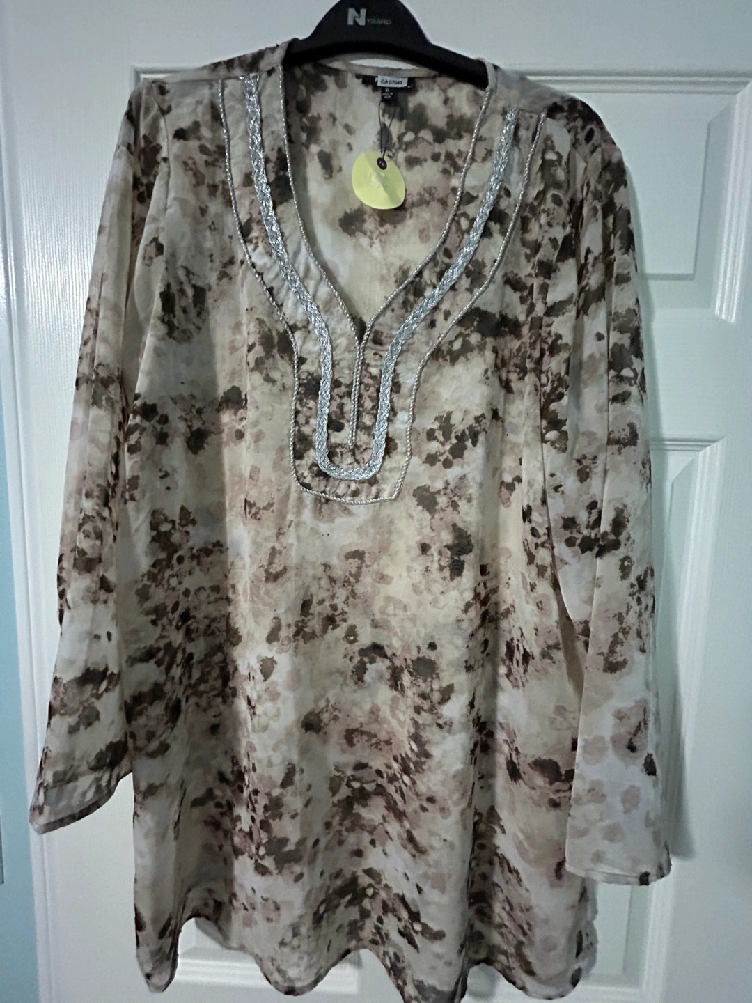 beautiful brown and beige pattern with silver detailing around the neckline. A chiffon like material with slits on the side. Great as a tunic or even a beach wear