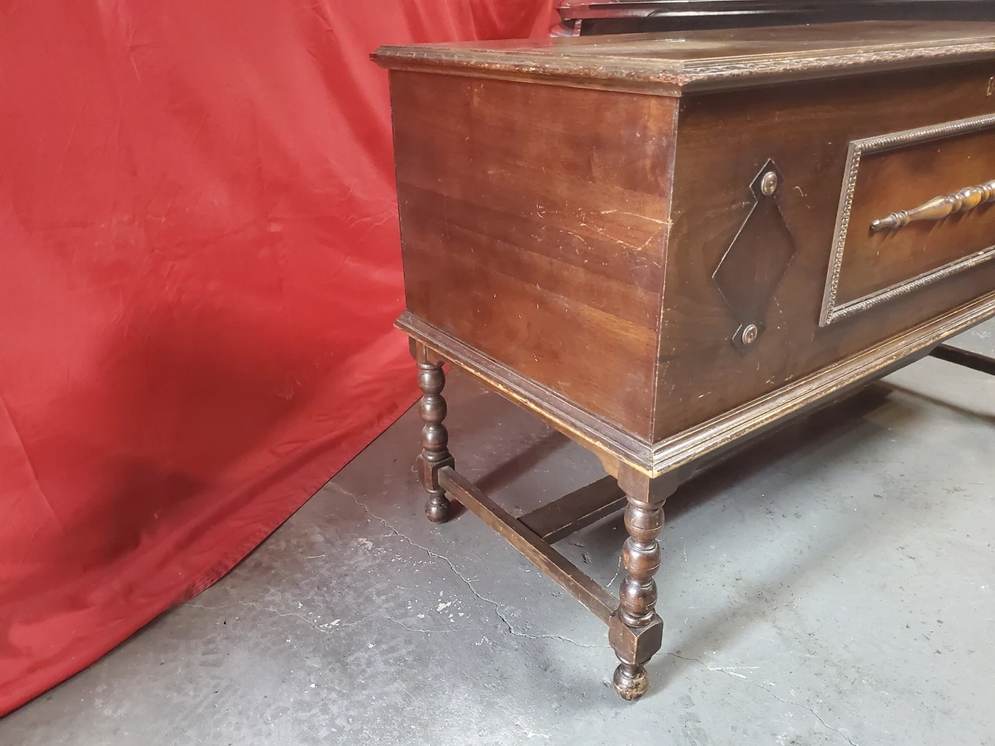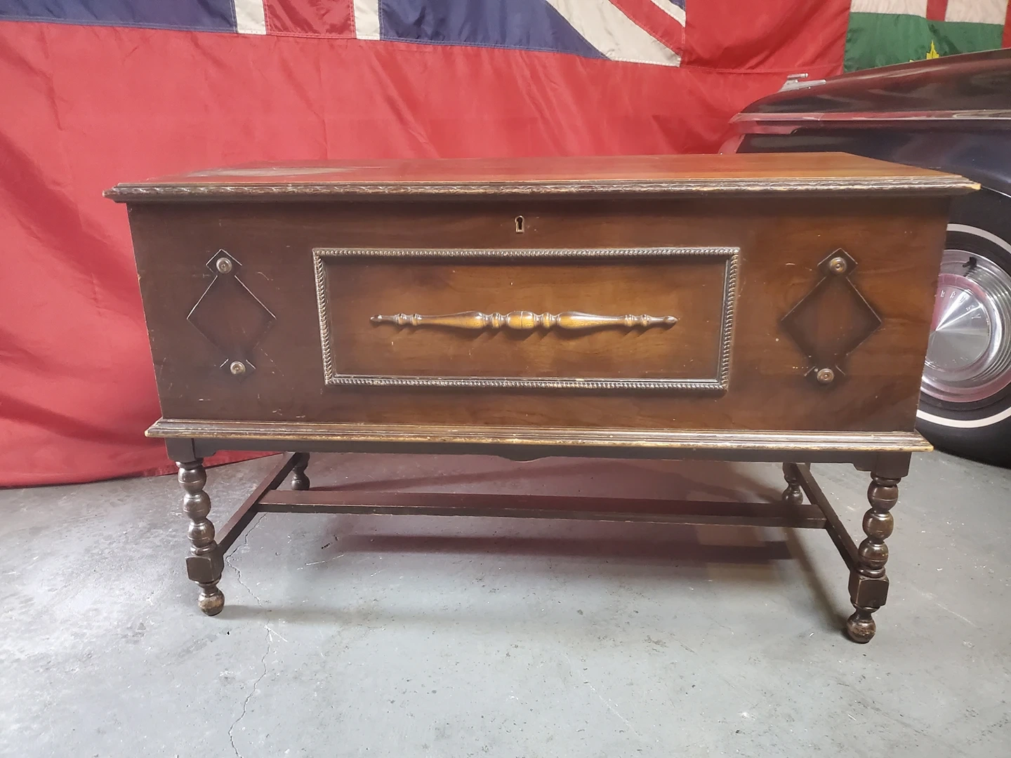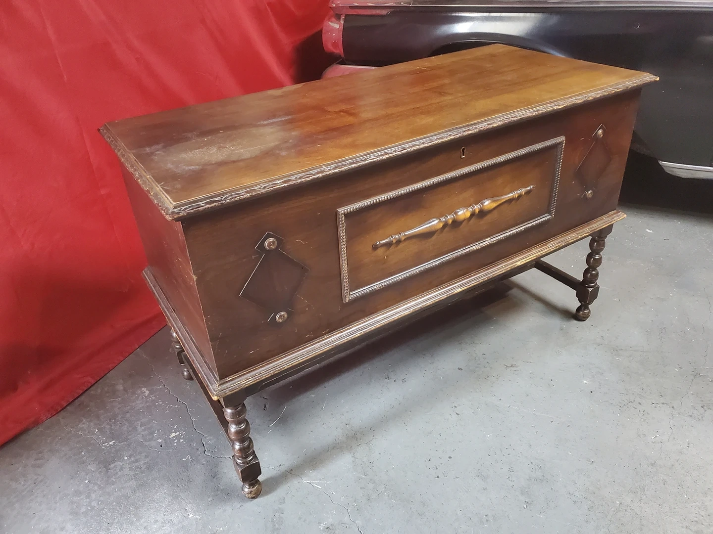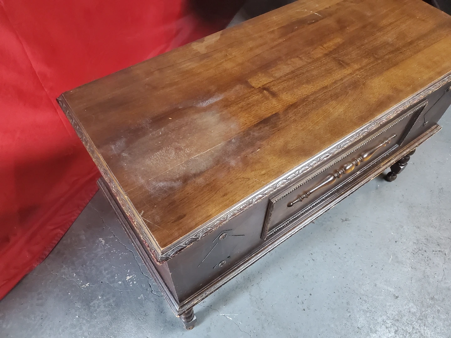 chest exterior has some top finish damage so it would probably need to be refinished. No key