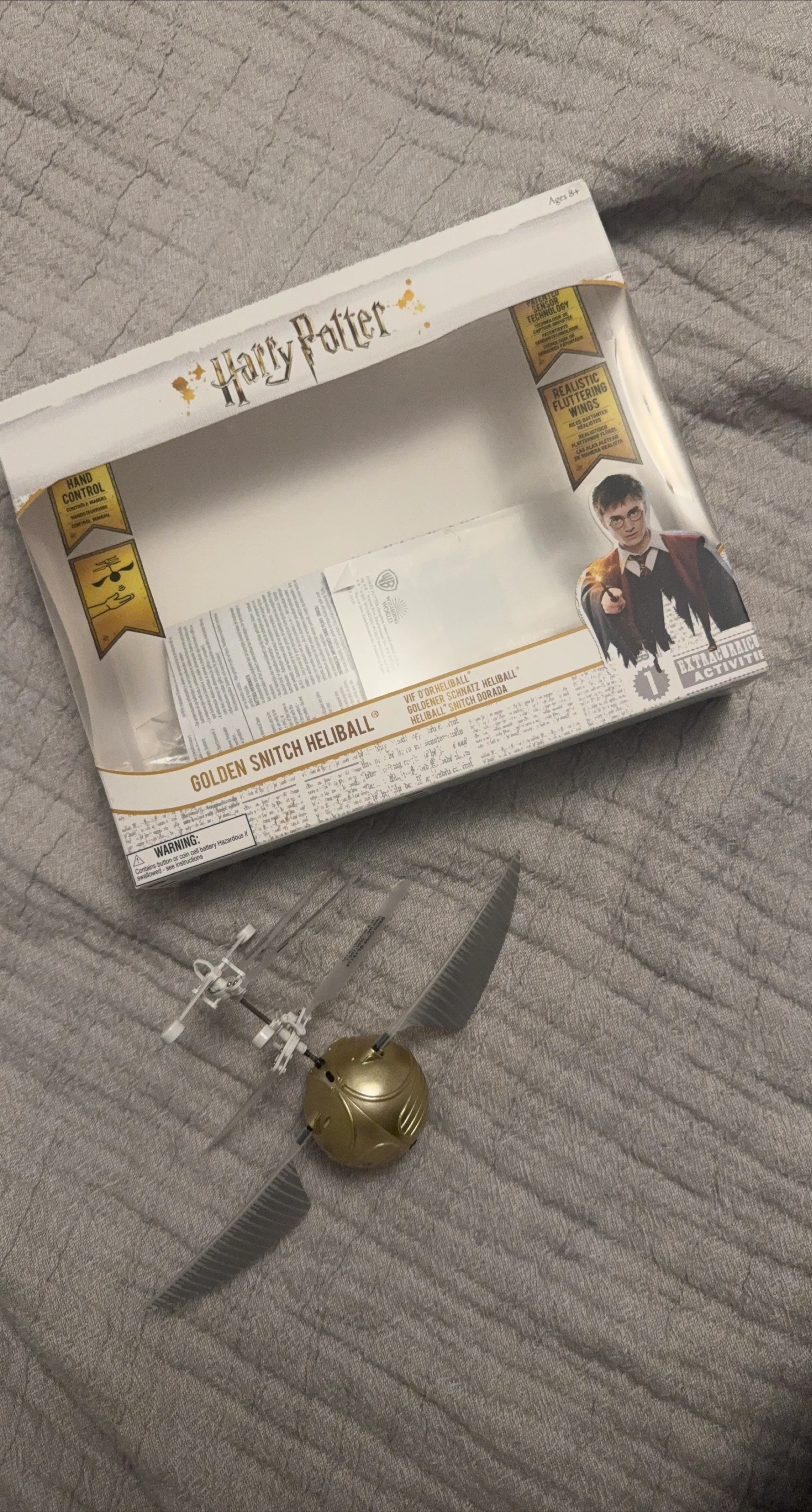 Selling a Harry Potter Golden Snitch Heliball! This cool toy features realistic fluttering wings and hand control. It's recommended for ages 8+. The box includes instructions and warnings about the button cell battery