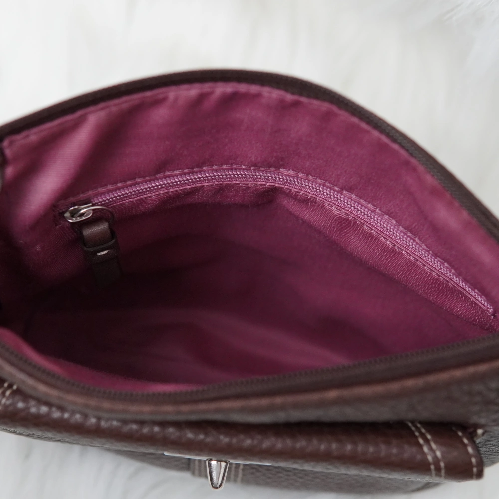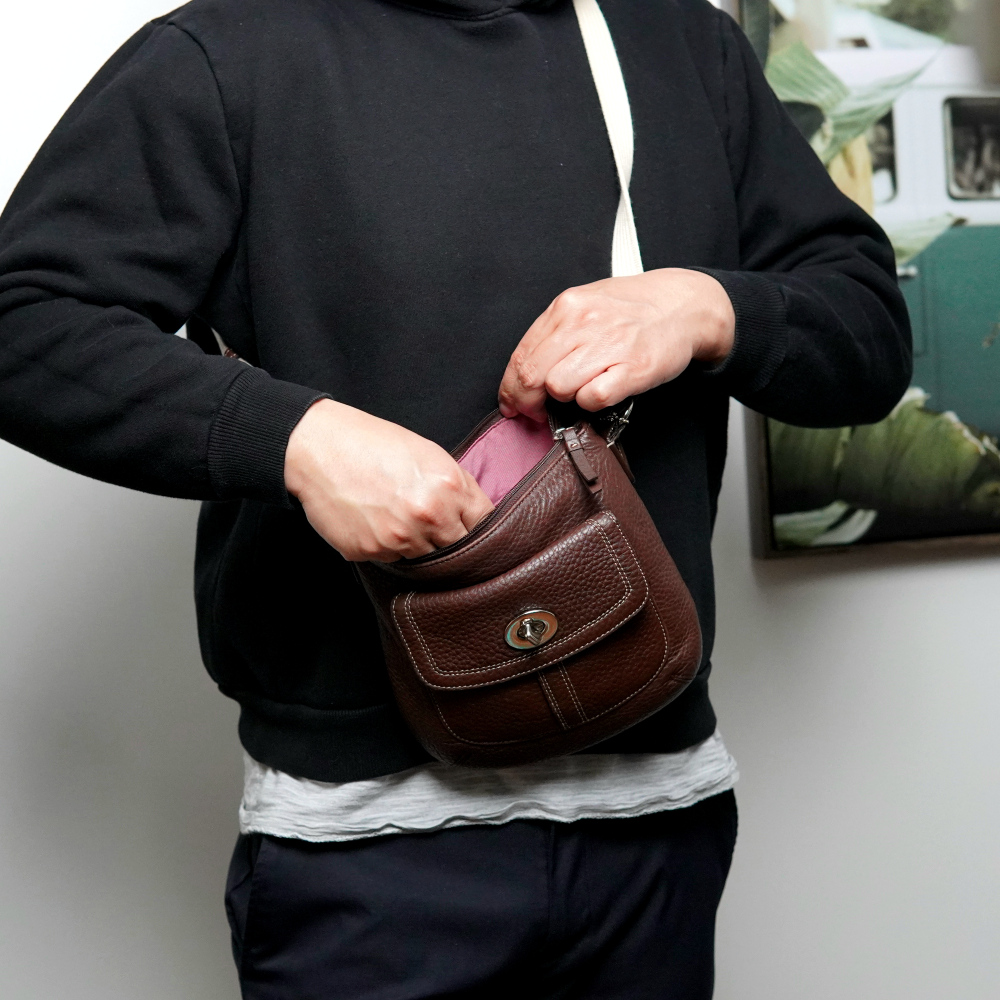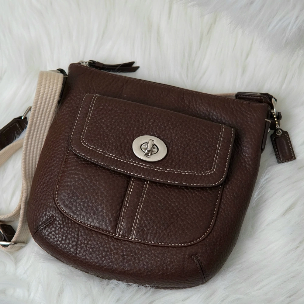 This is a lovely brown leather crossbody bag from Coach! It's in good condition and perfect for everyday use. The bag features a turn-lock closure and an adjustable strap. The interior is lined with a pink fabric and has a zippered pocket.