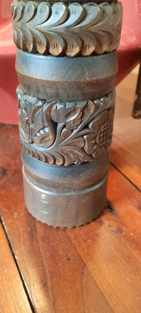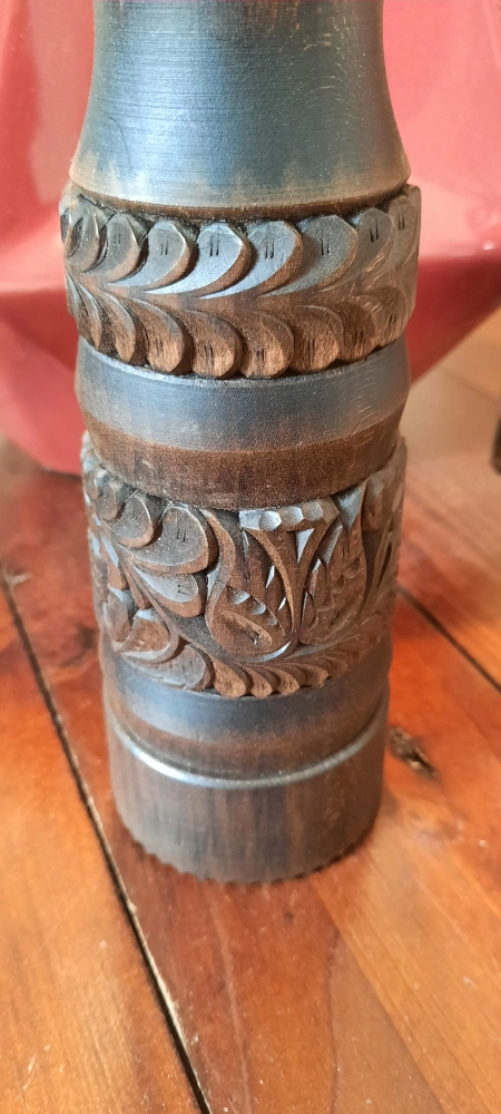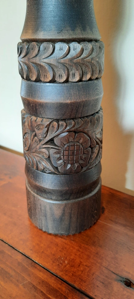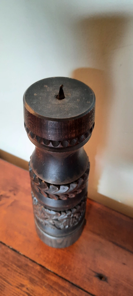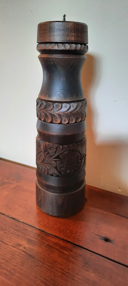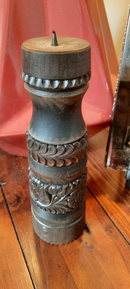 Selling a beautiful wooden candle holder with intricate carvings. It's in great condition and would add a touch of rustic charm to any room 13 inches tall