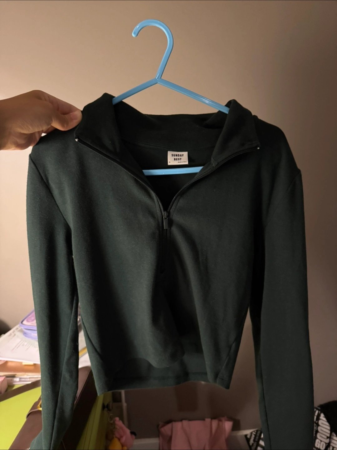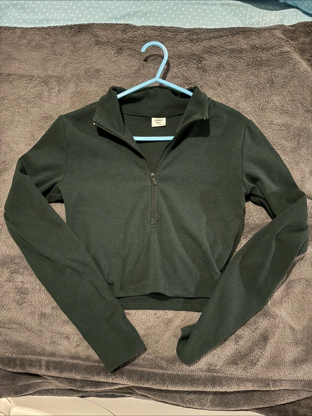 Selling a cute dark green cropped zip up from Sunday Best! It's in great condition and perfect for layering. Size xs. Never worn