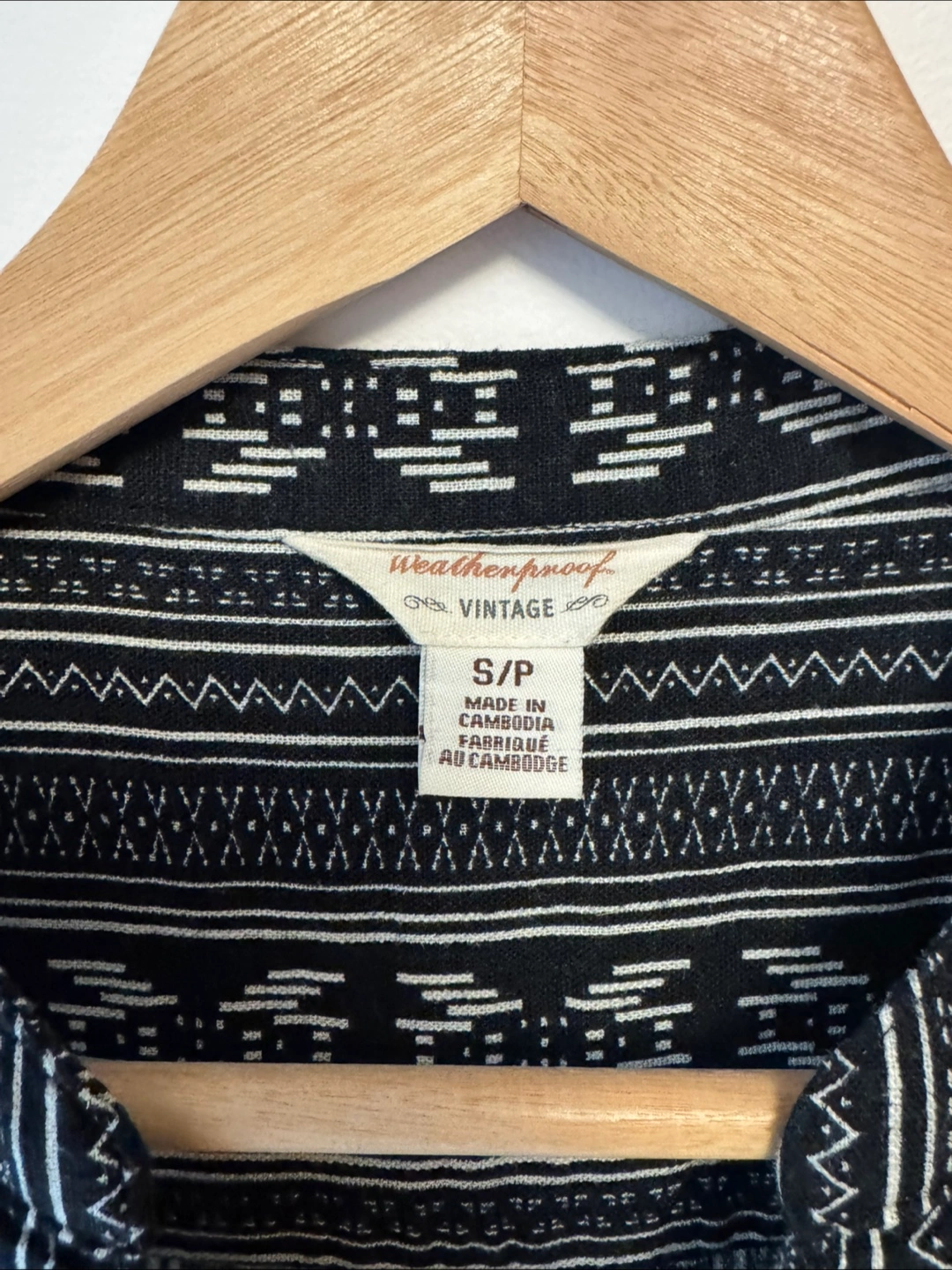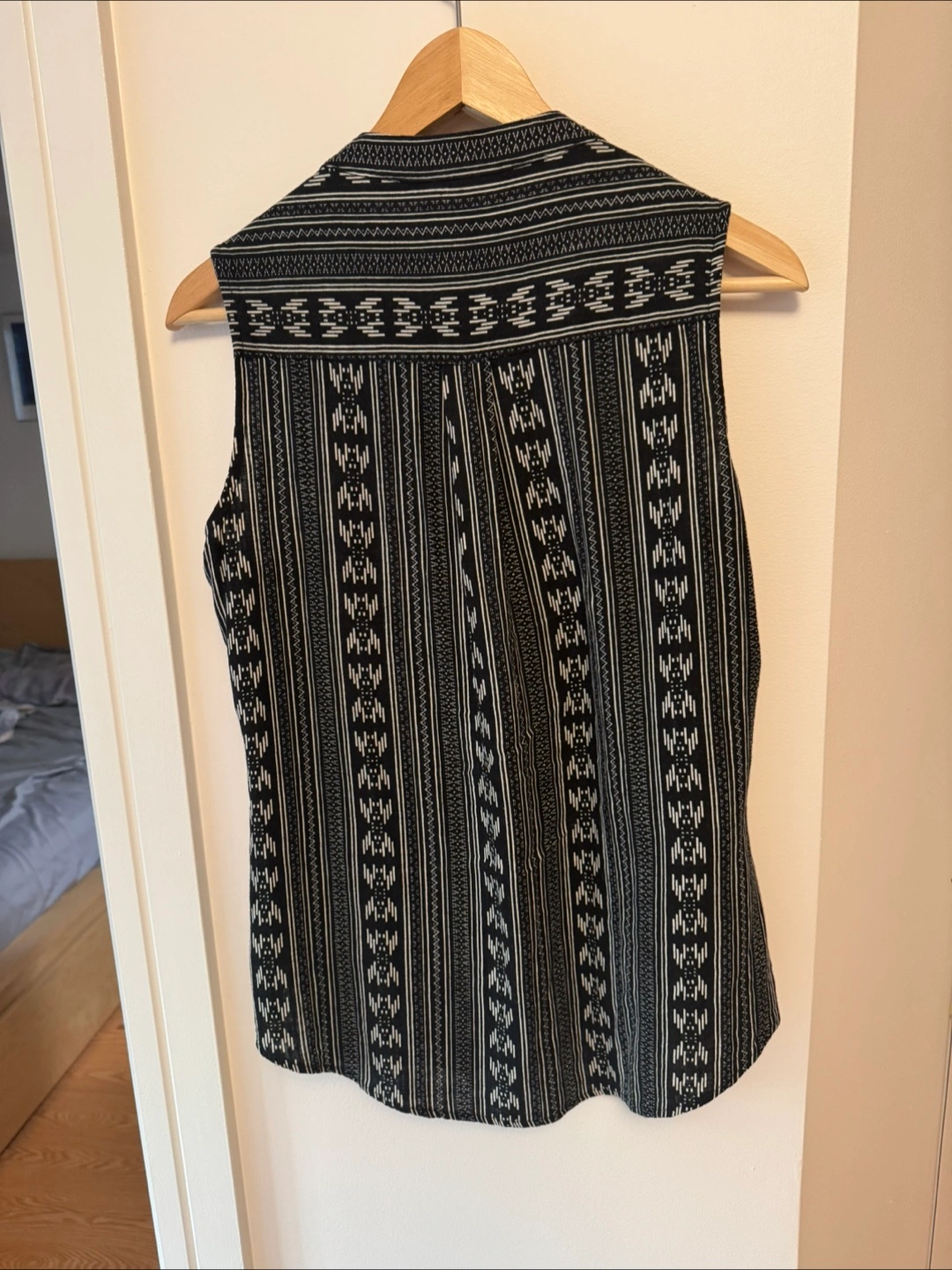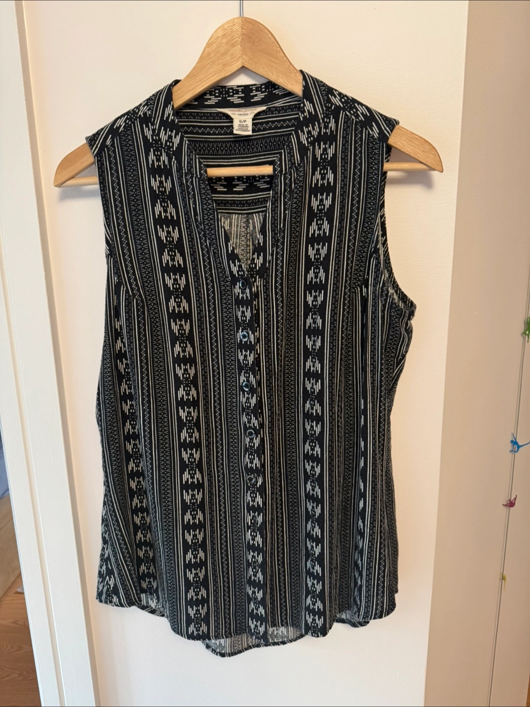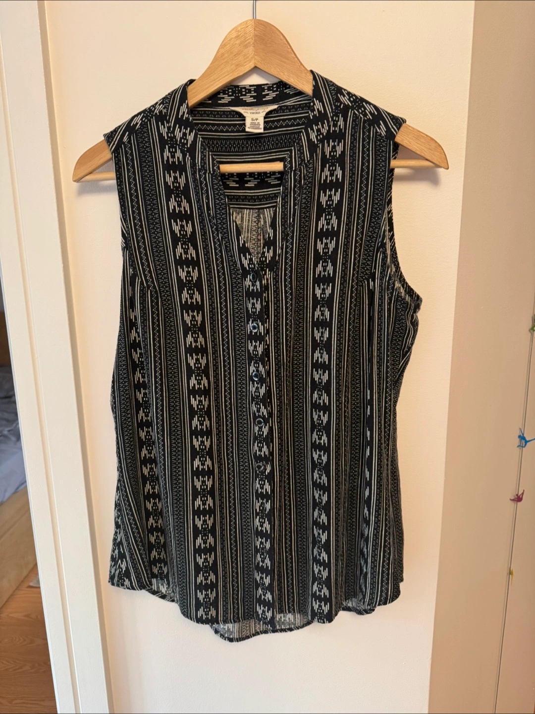 This is a Weatherproof Vintage sleeveless blouse in size small. It features a unique black and white pattern. Perfect for a casual or dressed-up look!