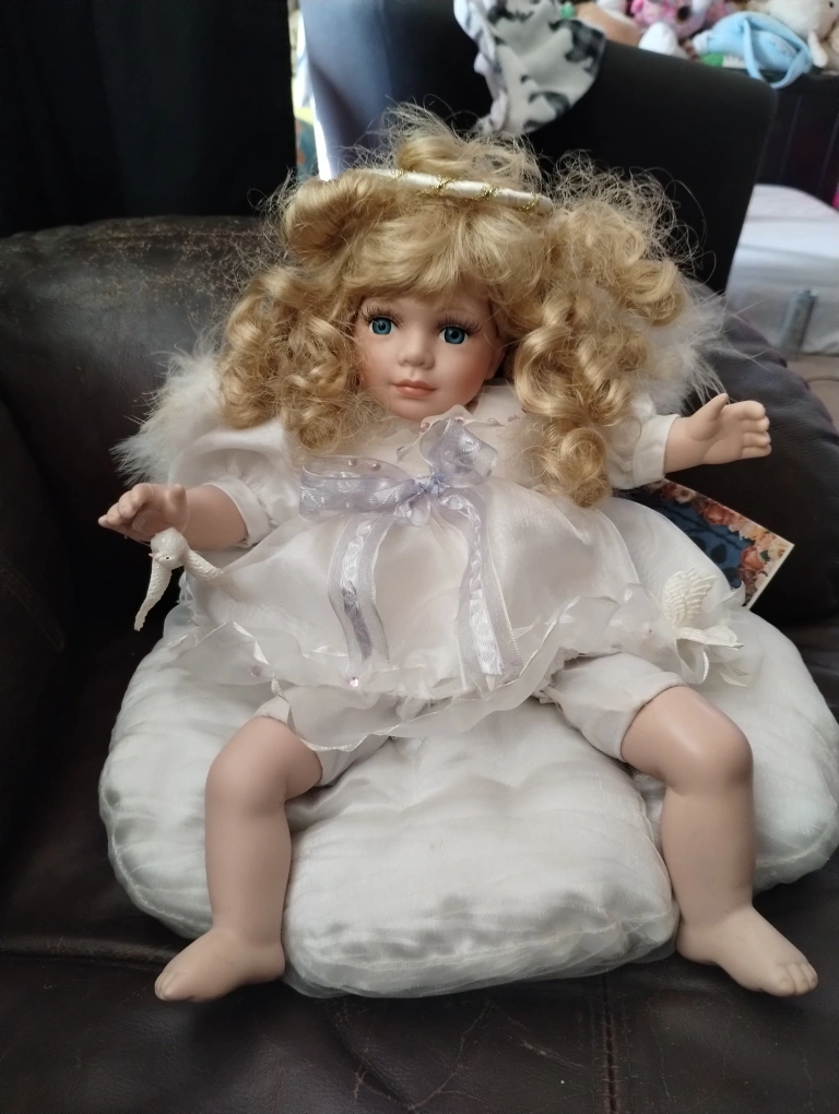 This is a beautiful porcelain angel doll by the Rebecca collection, music and knob in the back still work perfectly and the doll is in near mint condition, perfect for any collector