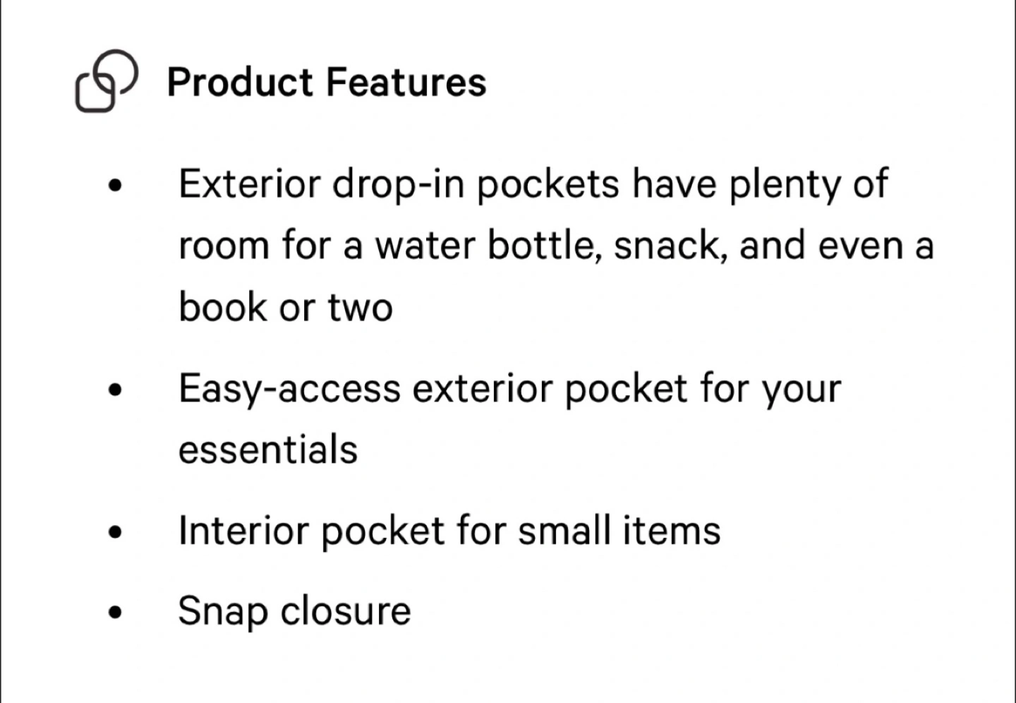 • Exterior drop-in pockets have plenty of room for a water bottle, snack, and even a book or two