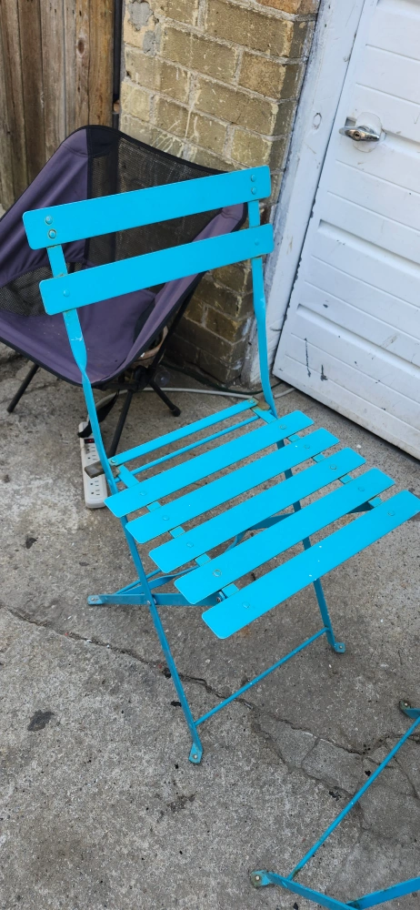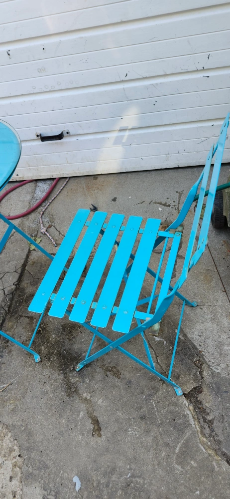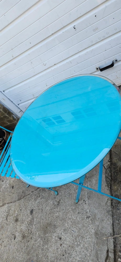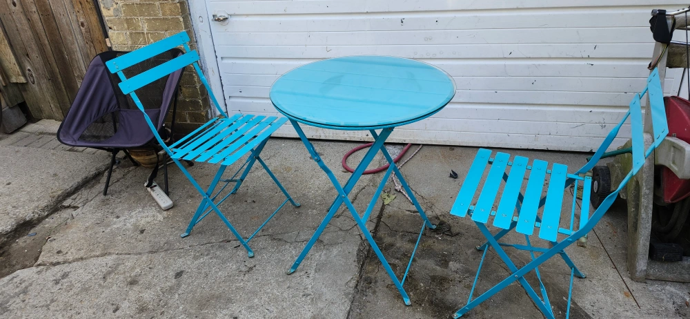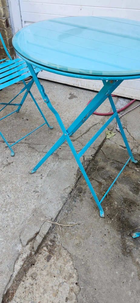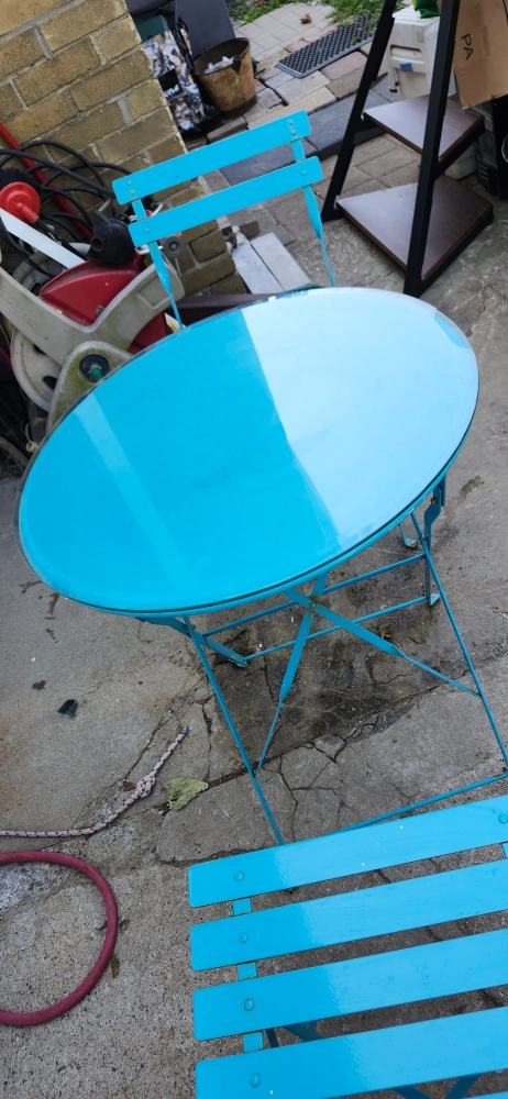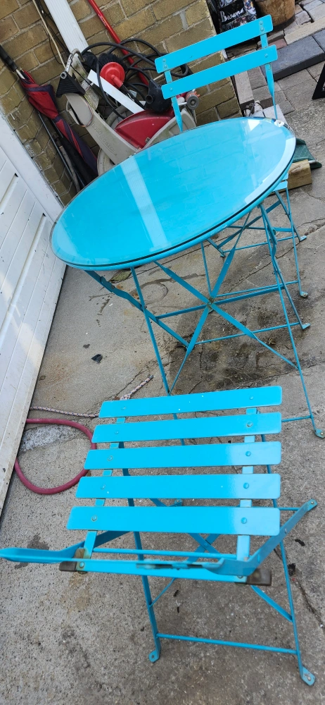 USED CUTE Blue bistro set, perfect for a small balcony or patio! Includes a round table and two folding chairs. Great for enjoying a coffee or a meal outdoors. The set is in good condition and ready for a new home!.. price firm final cash only pickup no delivery. Meet up on 801 O'Connor drive outside TD Canada Trust bank the door. Att. Price not negotiable.