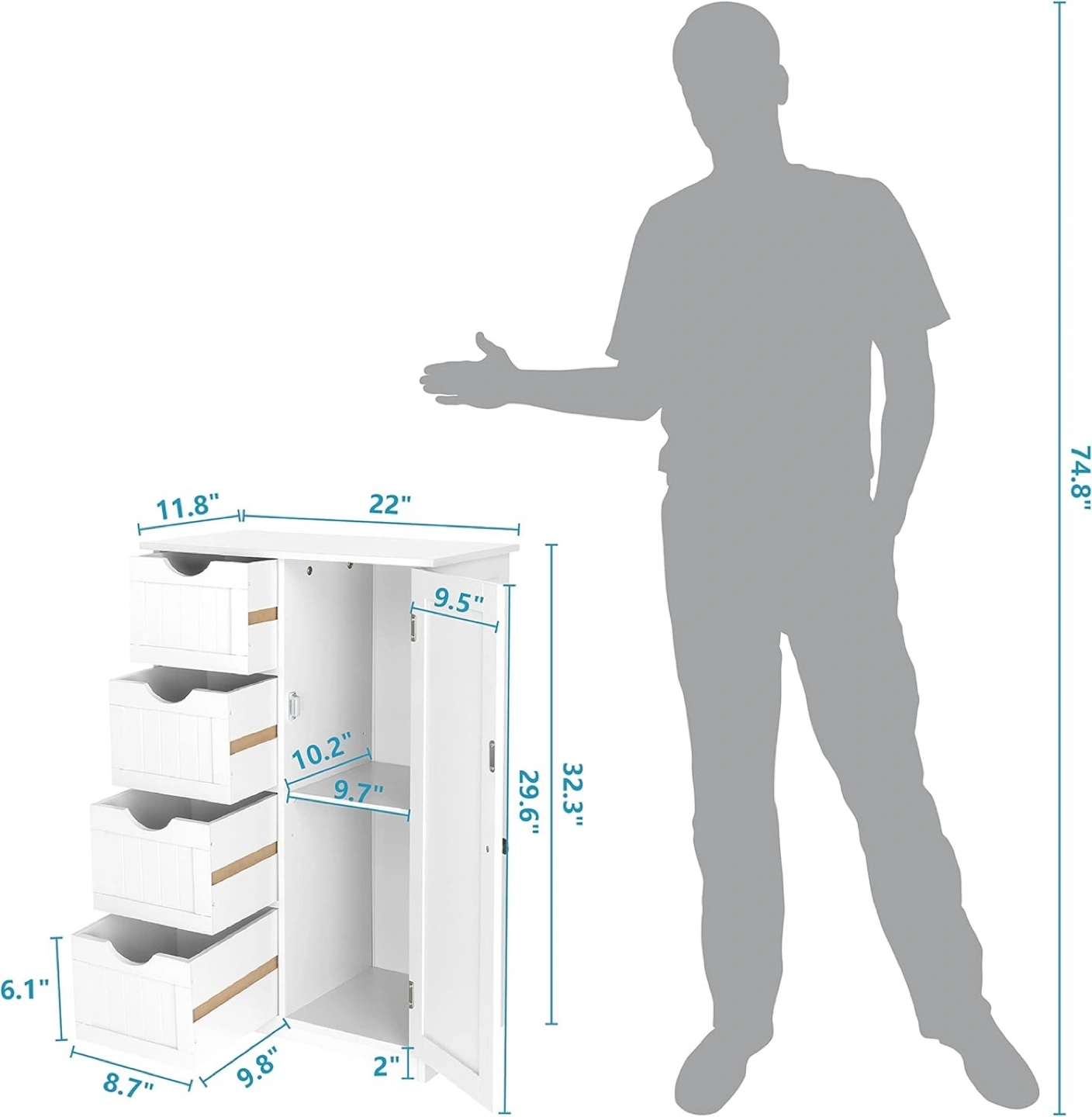 75Small in size 11.8"D x 22" W x 32.3"H, big in functionality. This storage cabinet maximizes space utilization, making it perfect for tight corners, small rooms, or anywhere you need extra storage. This storage cabinet features 4 drawers and 1 door with an adjustable shelf, which offers ample room for your essentials, keeping your space neat and organized. The adjustable shelf behind the door allows you to adapt the cabinet's storage to your needs. Store items of various sizes with ease and efficiency. Crafted from P2 MDF material, this cabinet offers both durability and style, ensuring it remains a functional piece in your space. This small cabinet is designed for hassle-free assembly, allowing you to enjoy its benefits without a lengthy setup process. Pick up in Mississauga near the intersection of Highways 401 and 403