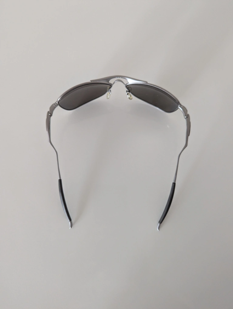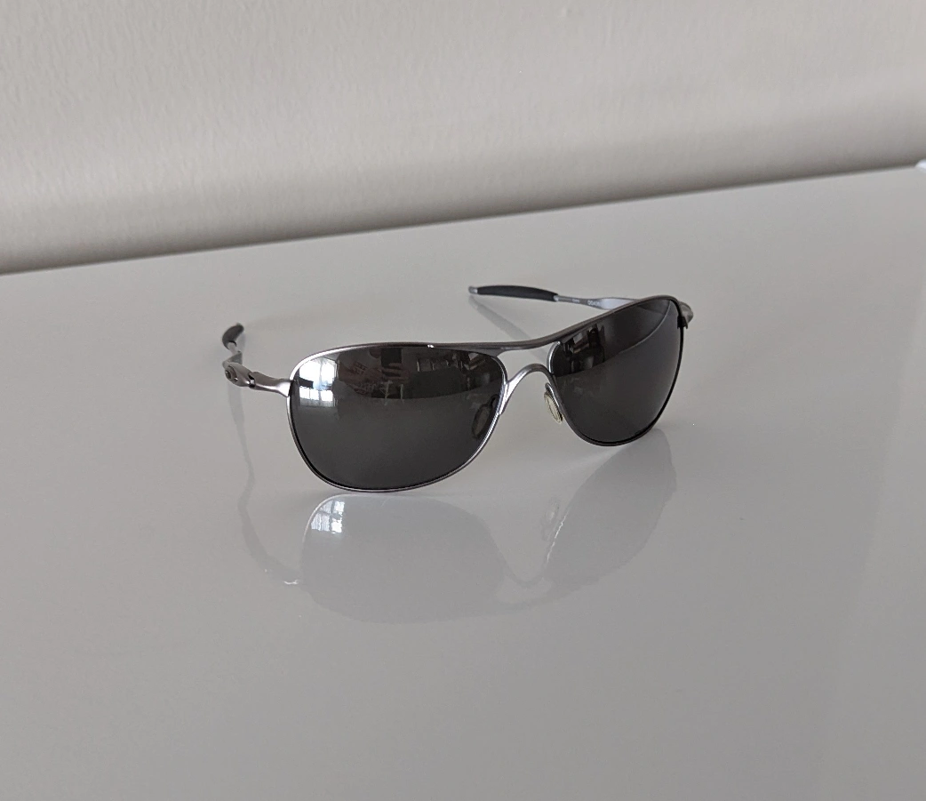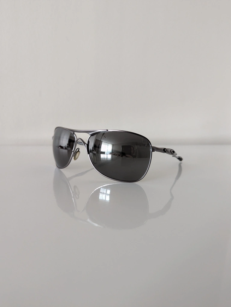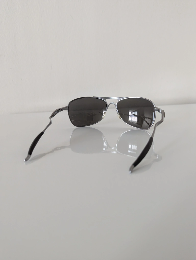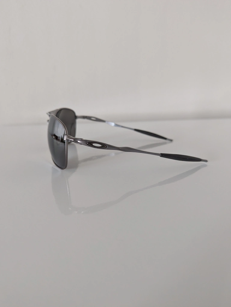 Selling a pair of authentic Oakley sunglasses with a sleek black metal frame and polarized dark lenses.