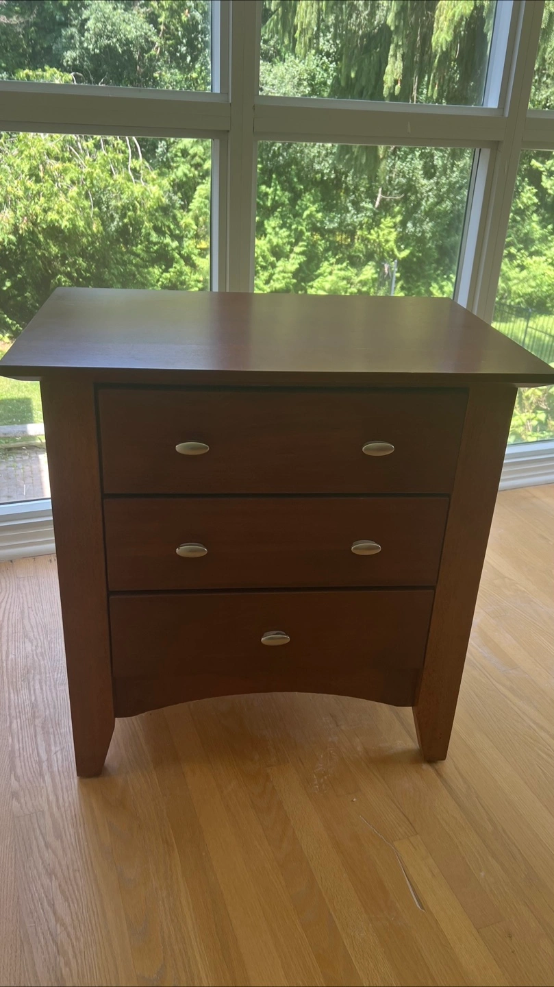 Here's a lovely brown wooden nightstand with three drawers! It would look great next to any bed