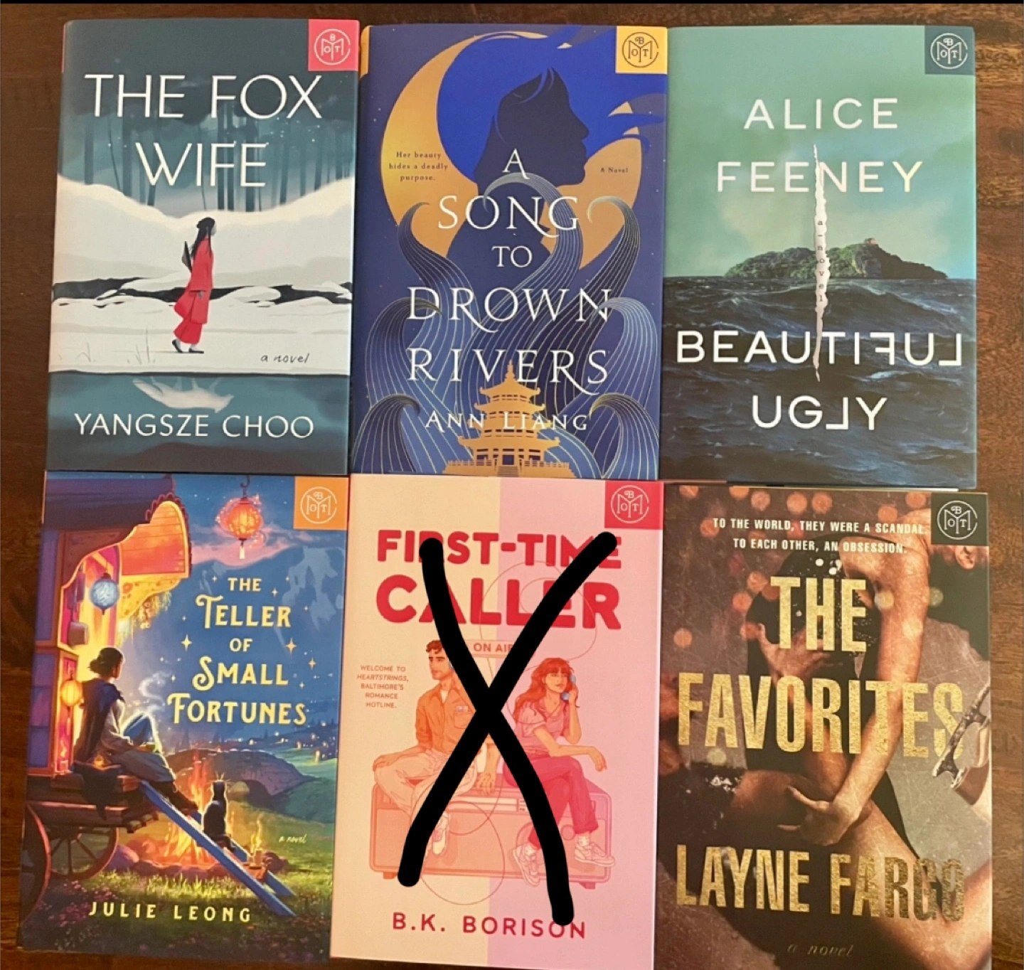 $5 each! Brand new books! includes bestselling titles like 'The Fox Wife' by Yangsze Choo, 'A Song to Drown Rivers' by Ann Liang, 'Beautiful Ugly' by Alice Feeney, 'The Teller of Small Fortunes' by Julie Leong, and 'The Favorites' by Layne Fargo