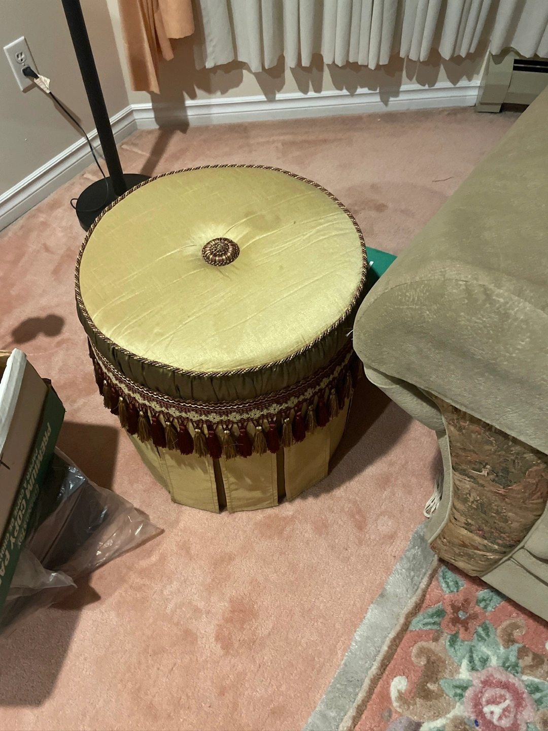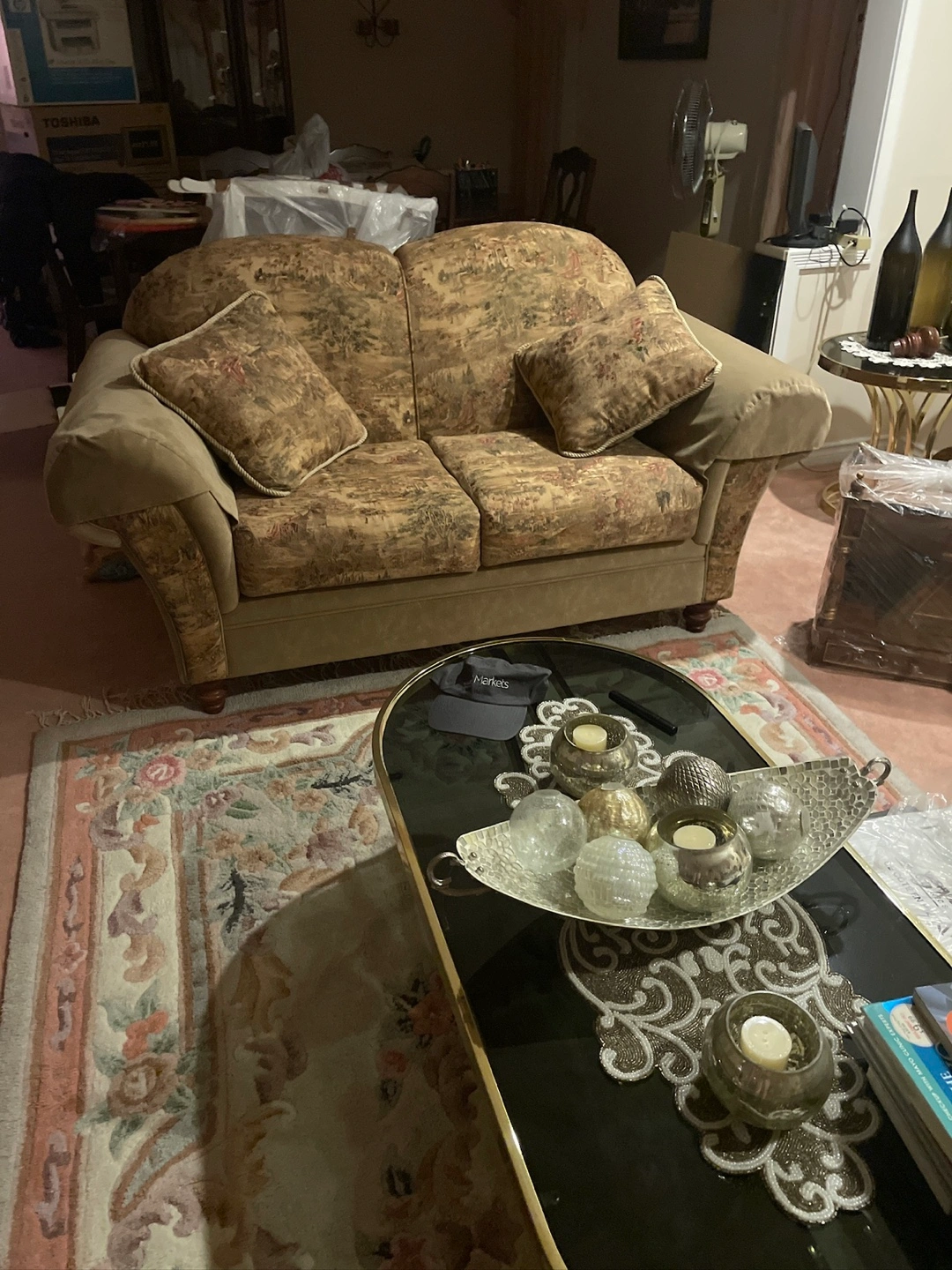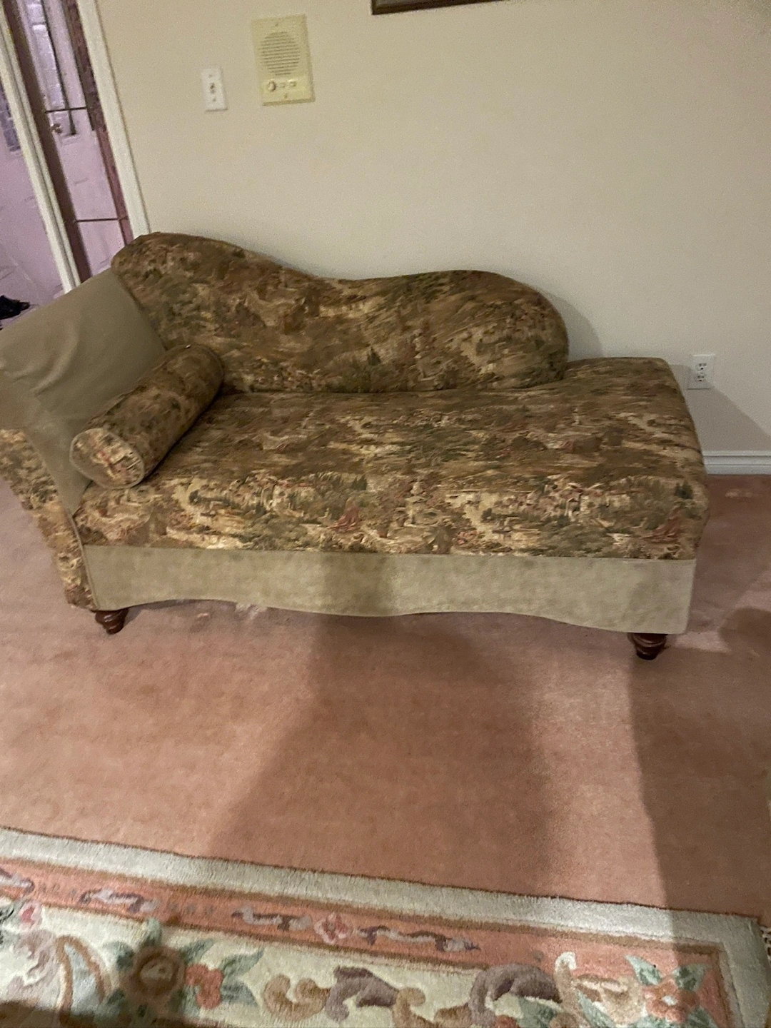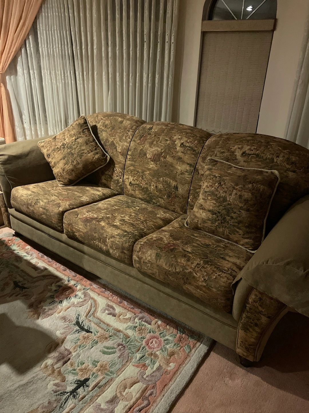 Selling a complete living room set! Includes a sofa (opens into a bed), loveseat, chaise lounge, and ottoman. The set has a unique patterned design. Perfect for furnishing your living space with a coordinated and stylish look. Sofa opens into a bed as well.