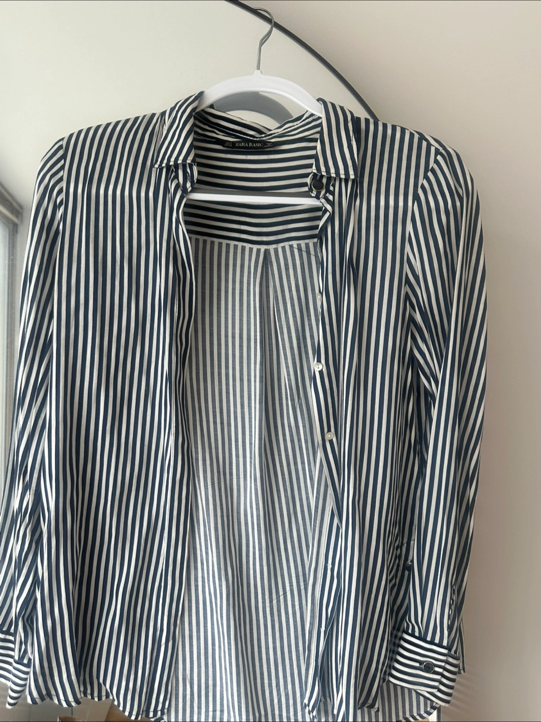 I'm selling a Zara Basic striped button-up shirt in size S. It features a classic striped pattern and button-up design. Perfect for a casual or dressed-up look!