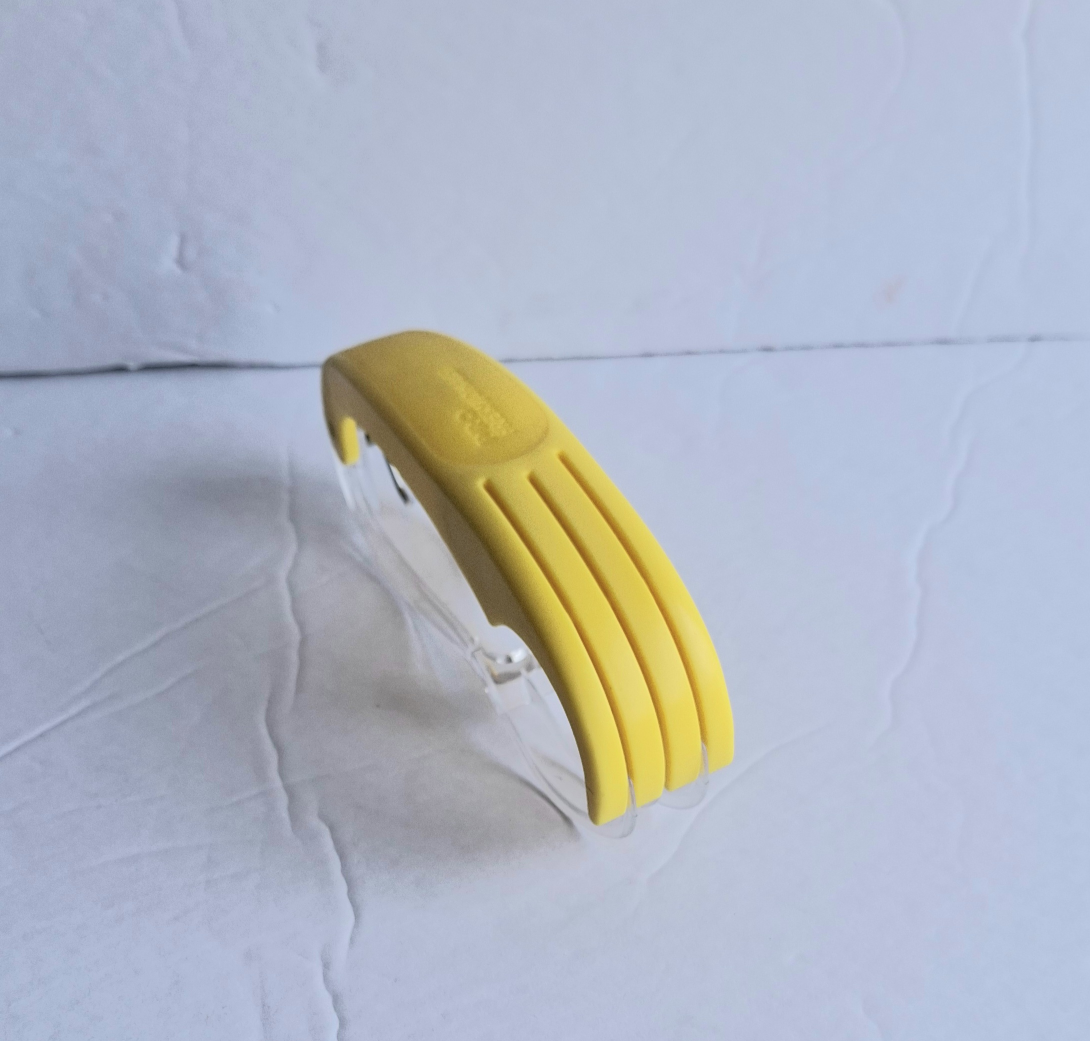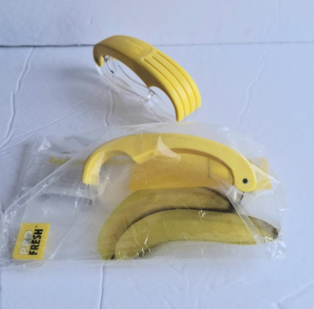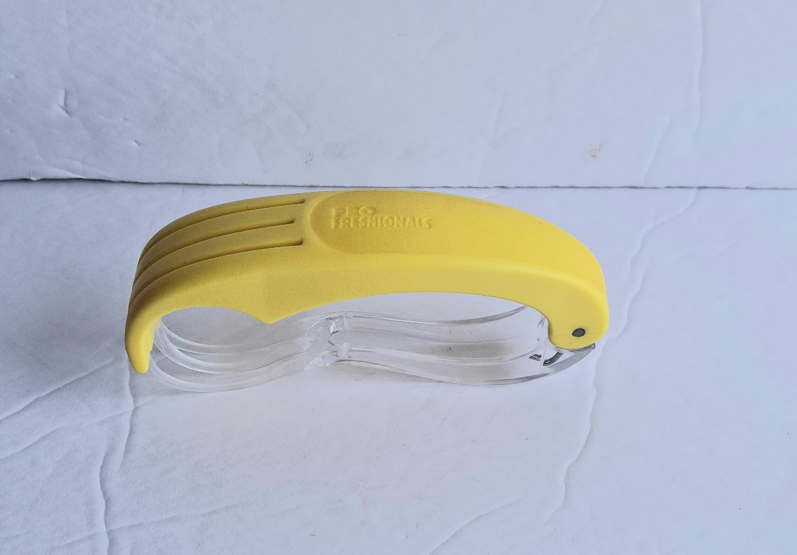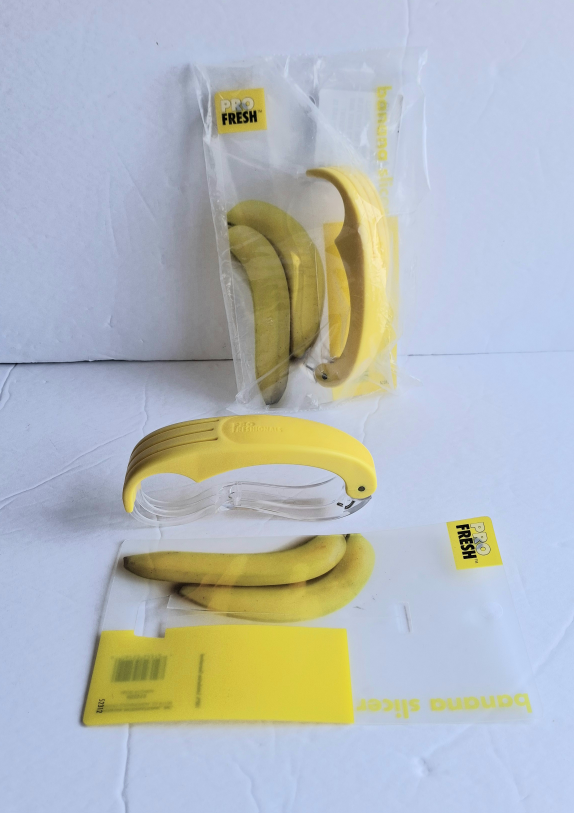 This is a Plastic Pro Fresh banana slicer in yellow. It's a handy tool for quickly slicing bananas! It's in great condition and comes in its original packaging. I have 10 of them all packed.