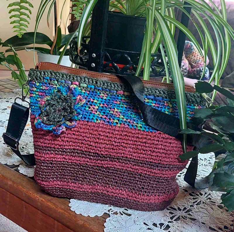 Selling a unique handmade crocheted bag! This one of a kind purse features a colourful design with a mix of pink, blue, and green tones. It has a crossbody strap and a zippered closure. Perfect for adding a pop of colour to your outfit!