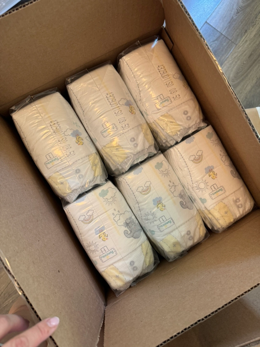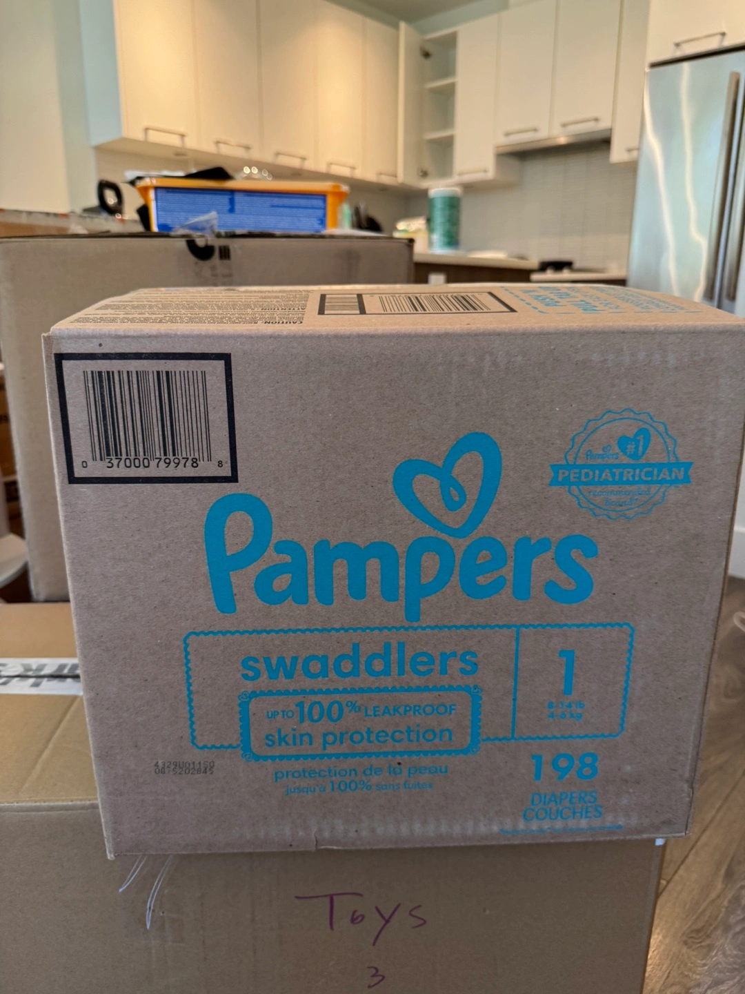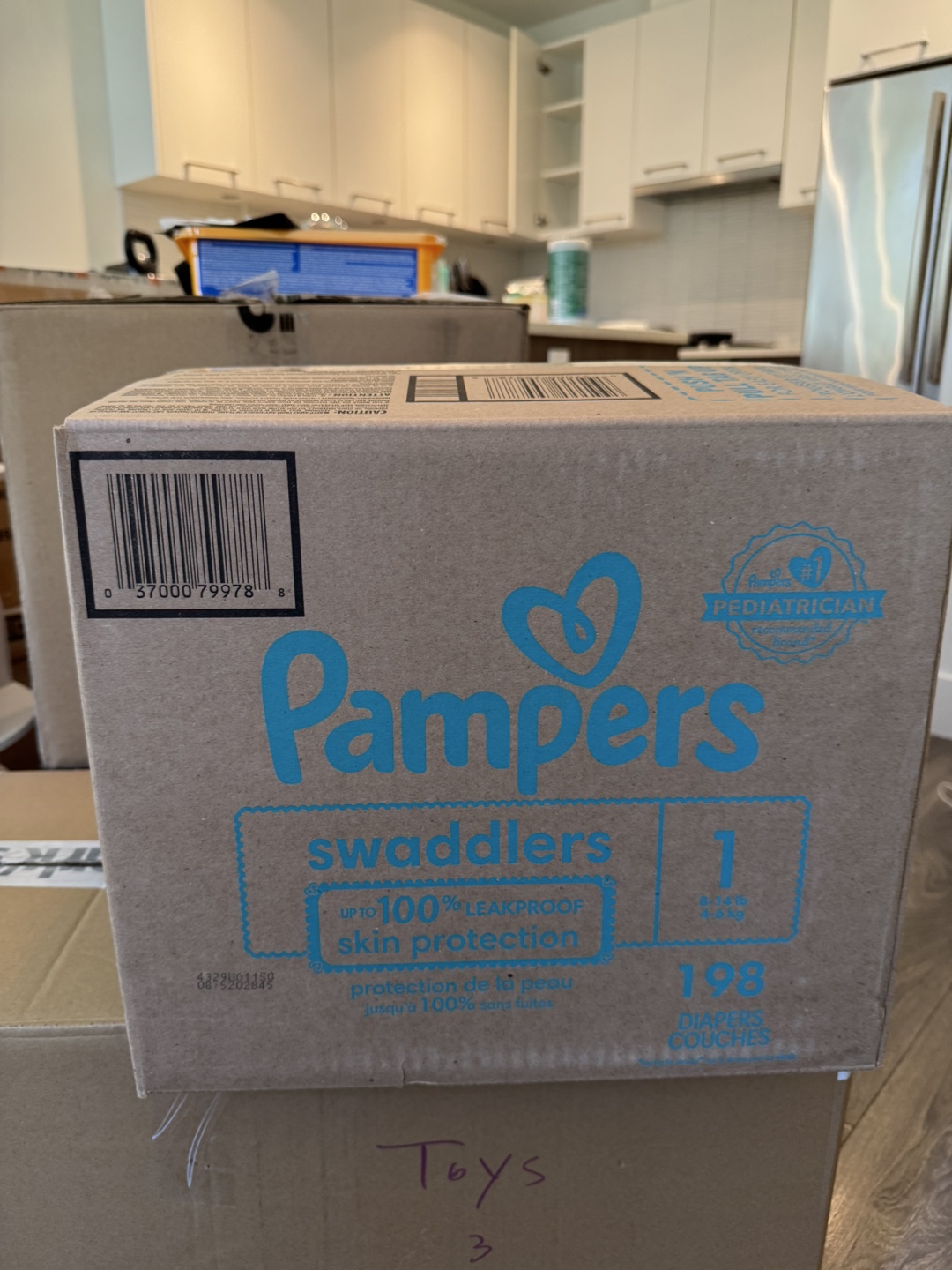 Selling a box of Pampers Swaddlers diapers, size 1. The box contains 198 diapers. They offer up to 100% leakproof skin protection