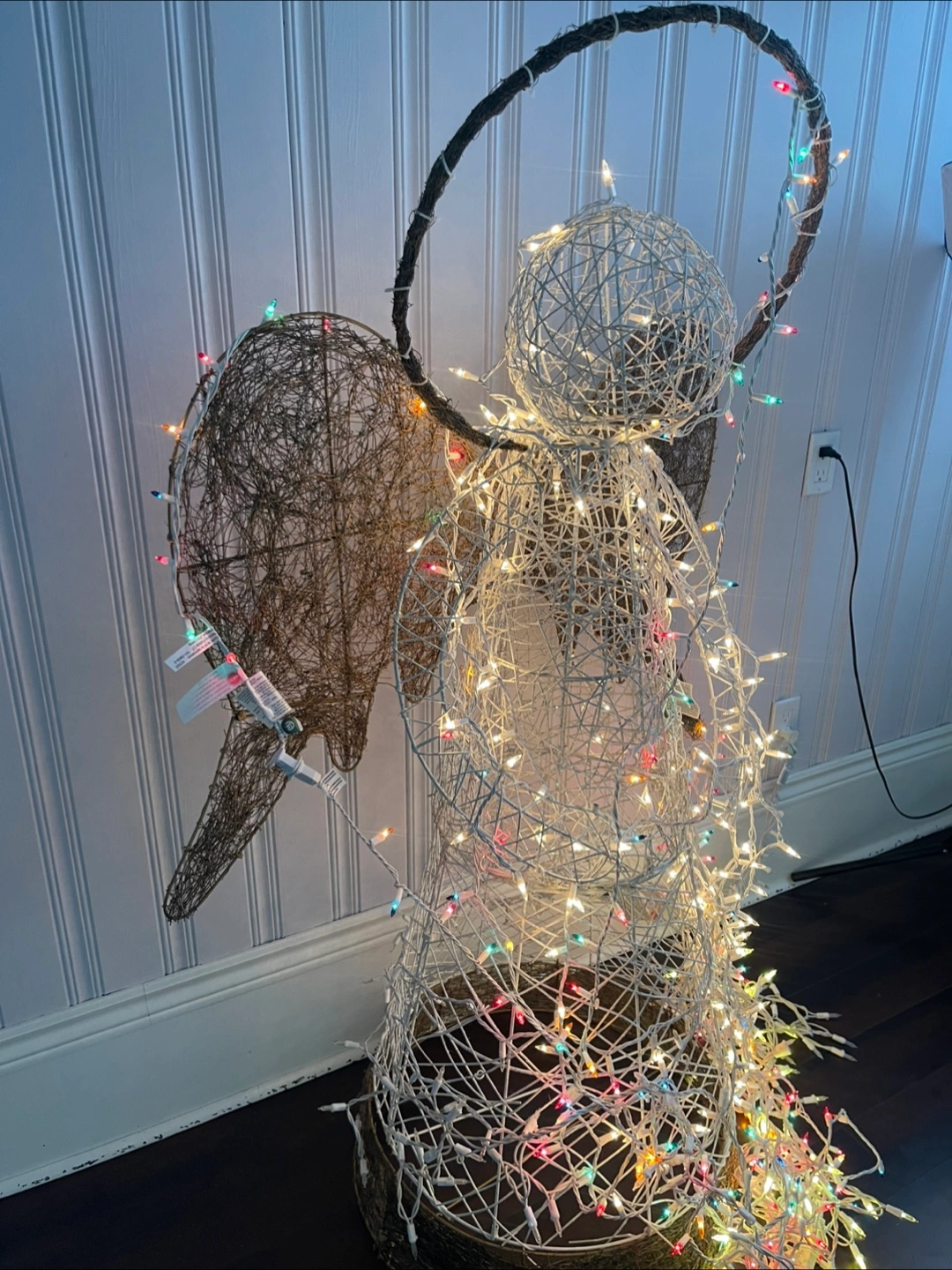 Selling a cute angel Christmas decoration! It's wrapped in string lights that give off a warm glow. Perfect for adding a festive touch to your home this holiday season