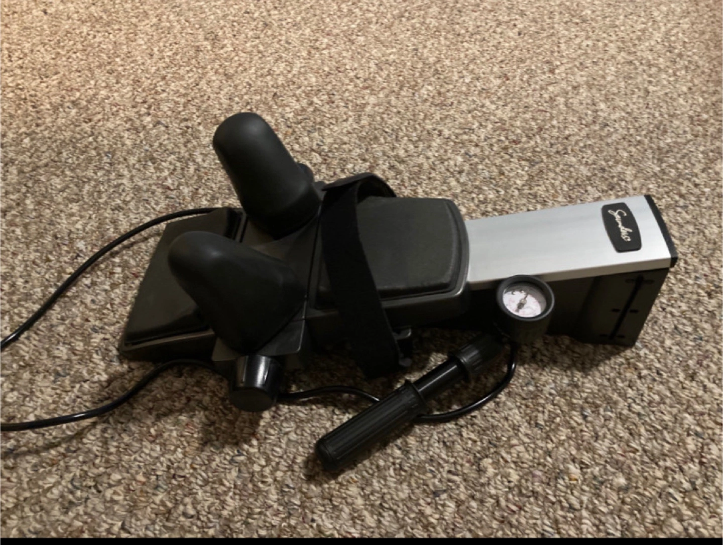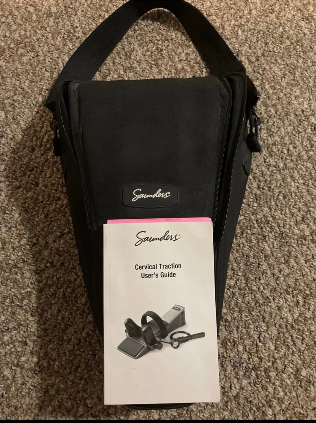 Get relief from neck pain with this Saunders cervical traction device. This device is designed to gently stretch your neck muscles, providing therapeutic relief from pain and stiffness. It is in excellent condition and comes with a carrying case and user's guide for easy setup and use.