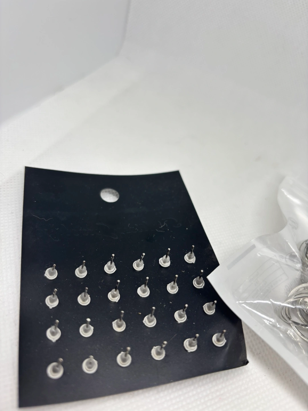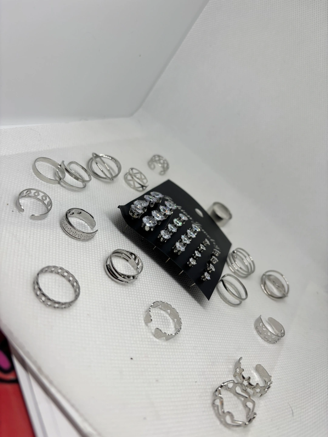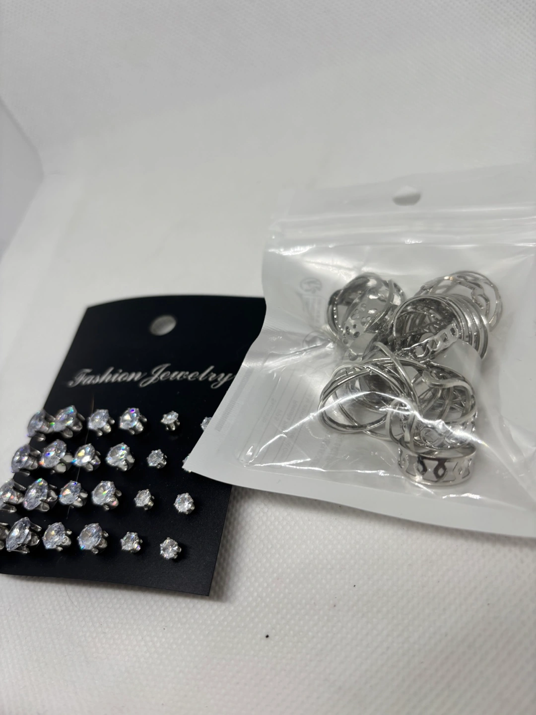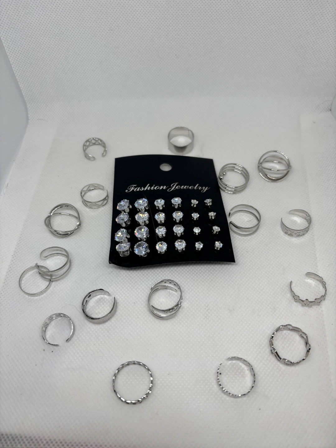 Selling a fashion jewelry set that includes earrings and rings. The set features a variety of silver-toned rings and stud earrings, some adorned with small crystals. Perfect for adding a touch of sparkle to your everyday look!