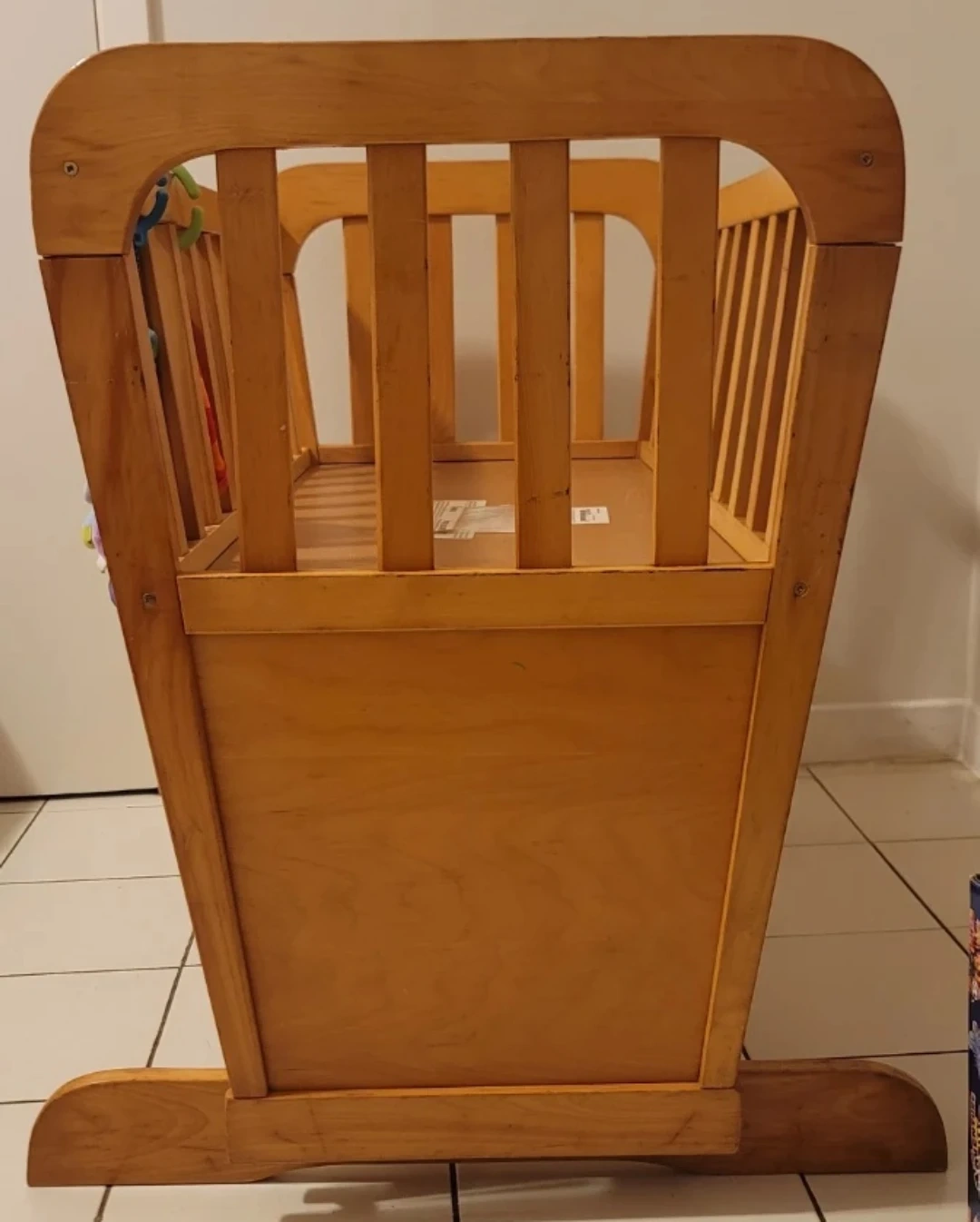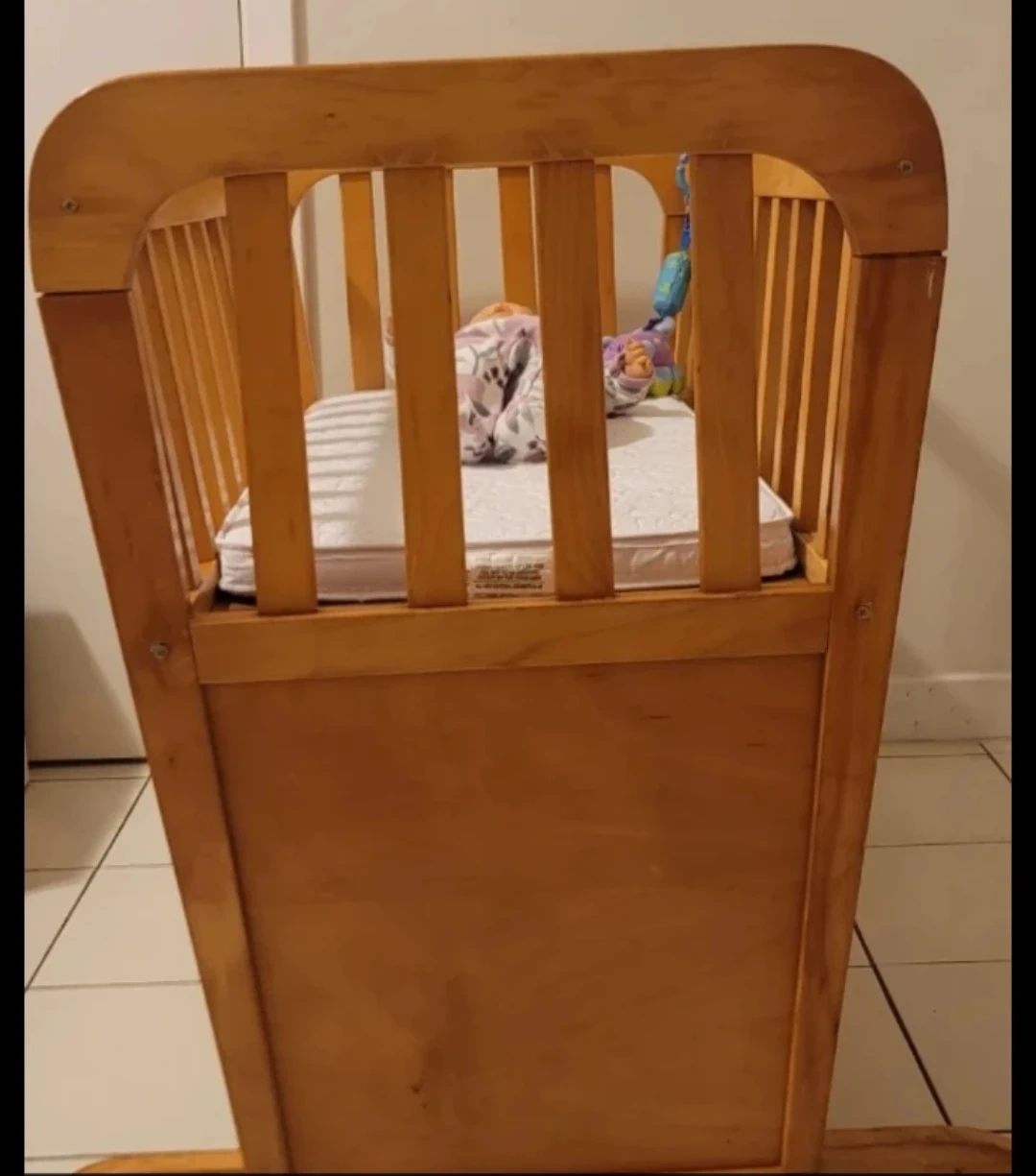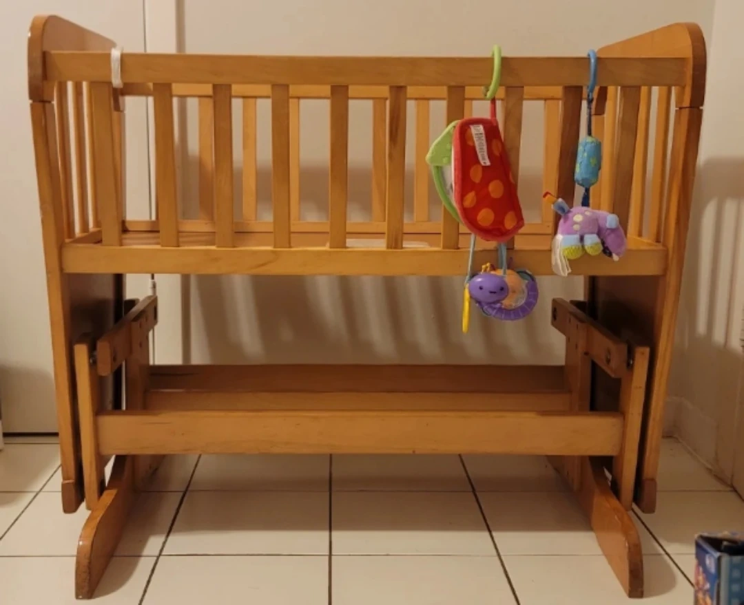 Selling a gently used wooden baby crib. It comes with a mattress. This crib is perfect for your little one's nursery. It's sturdy and in good condition. A great option for a safe and comfortable sleep space for your baby.