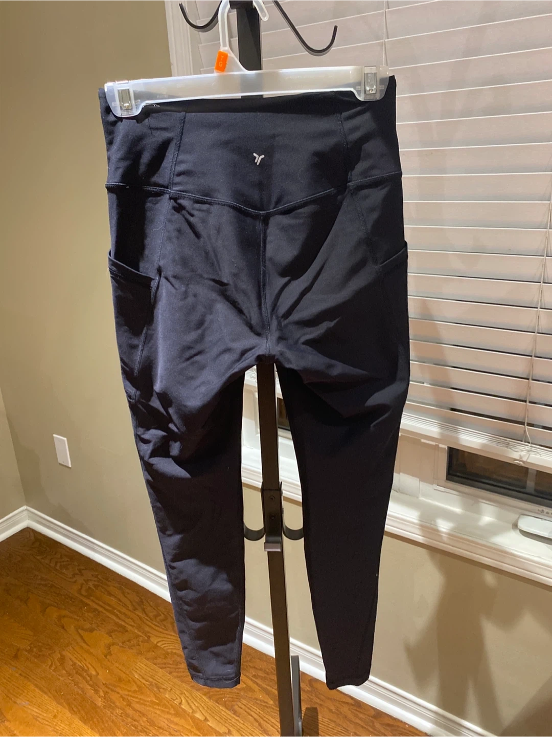 These are Old Navy black cropped leggings with side pockets. They're made from PowerSoft fabric for comfort and flexibility. Perfect for everyday wear or your next workout!