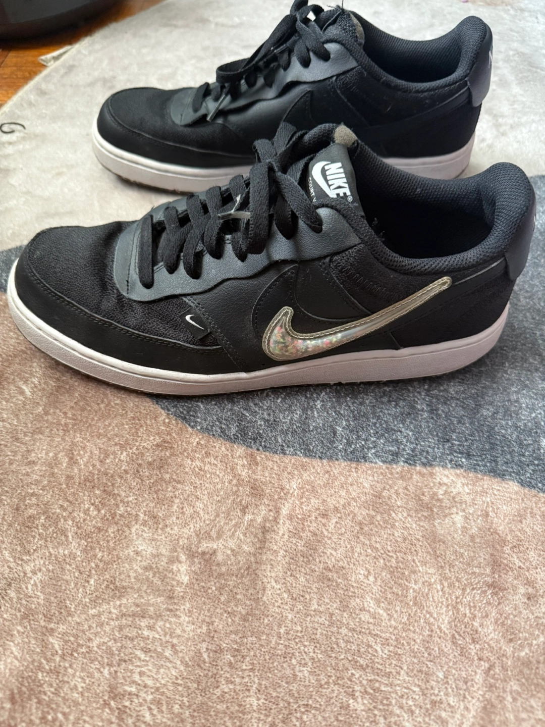Nike Court Vision Low Next Nature sneakers in black, size US 10.5. These are in good condition and are a really cool nature and sustainability focused shoe. Ready for a new home! The style code is DJ1974-001.