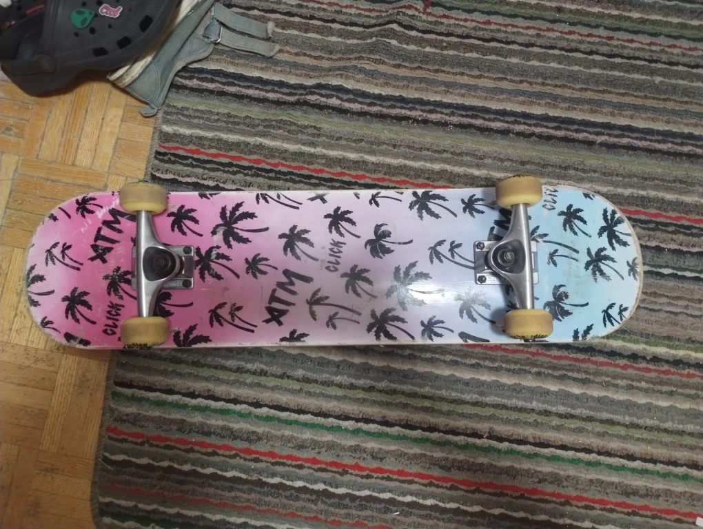 Selling a Click ATM skateboard. The wheels match and the bearings are decent. almost brand new grip tape and a newer set of darkStar trucks