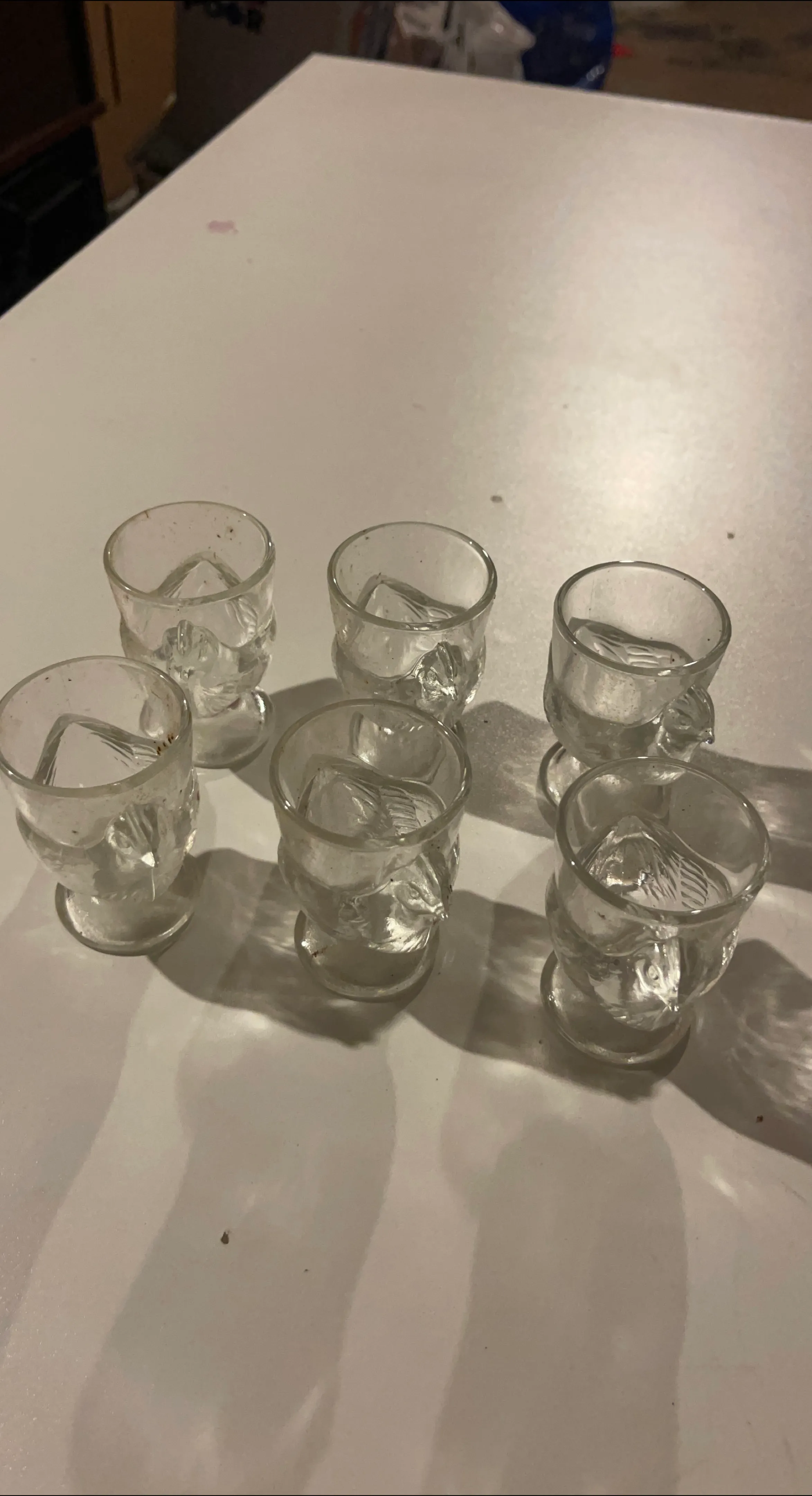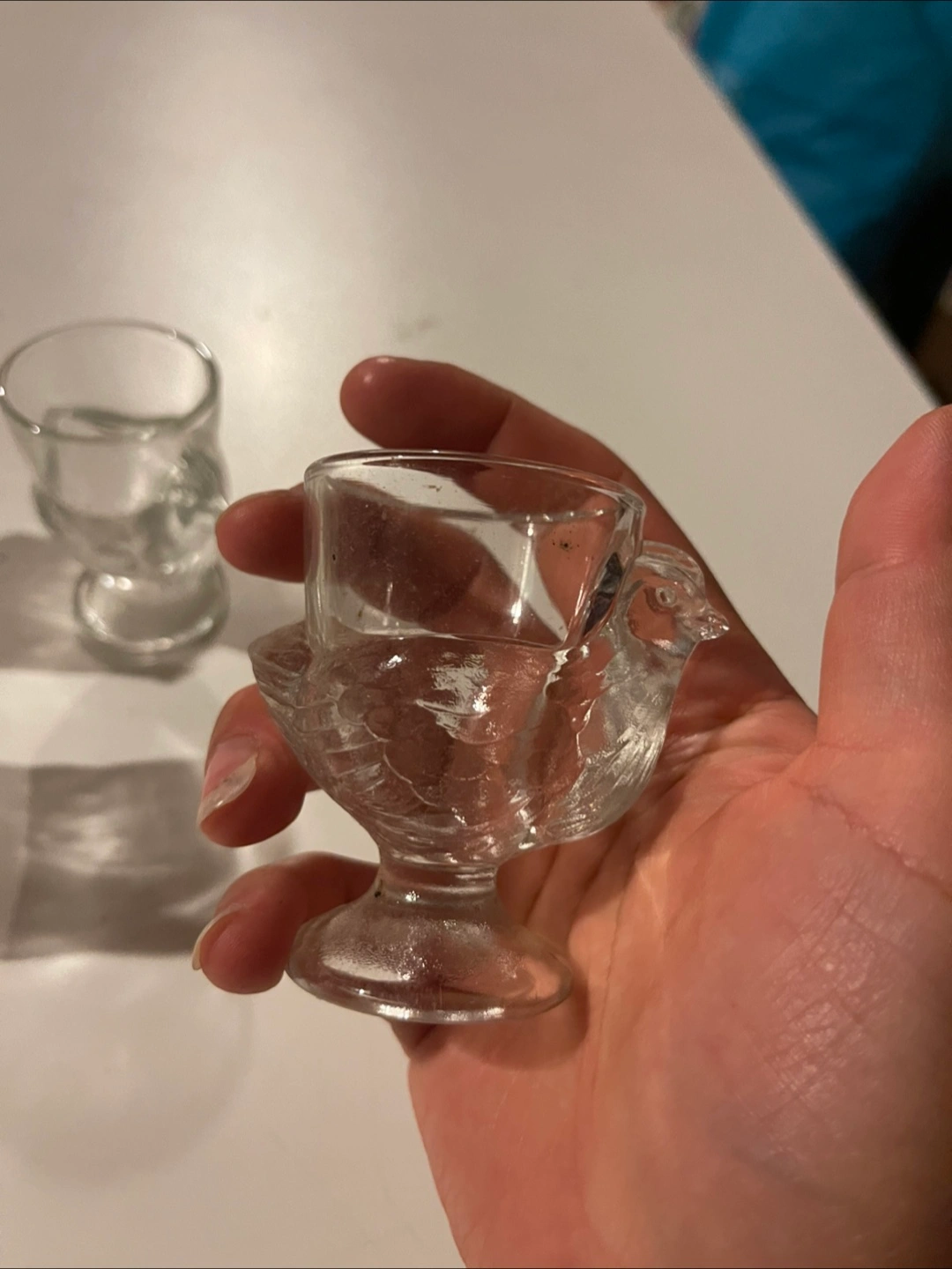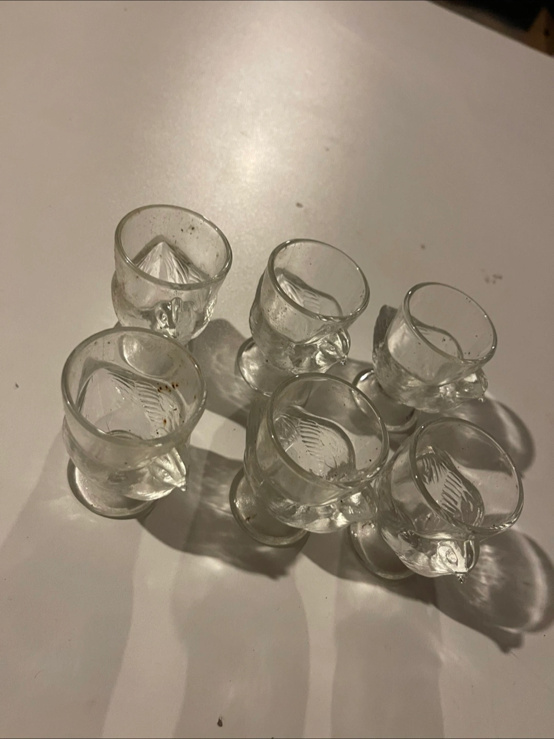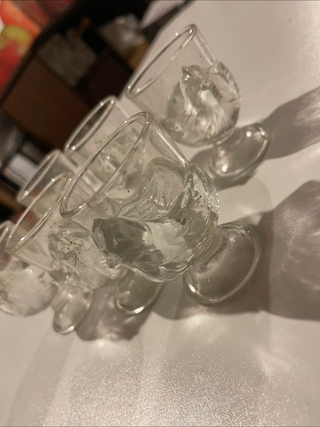Selling a set of six adorable clear glass egg cups, each shaped like a little chicken! 6 Coquetiers Poule.