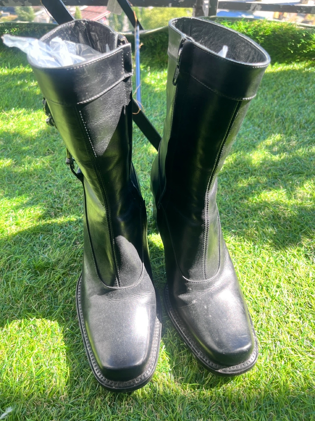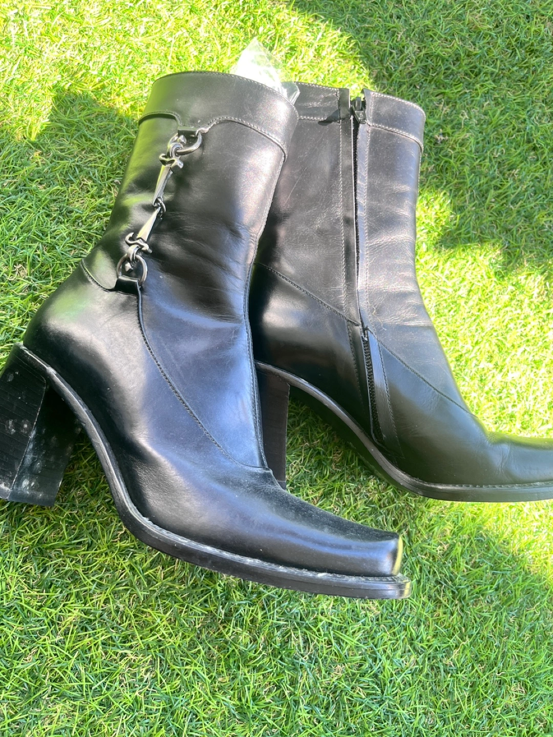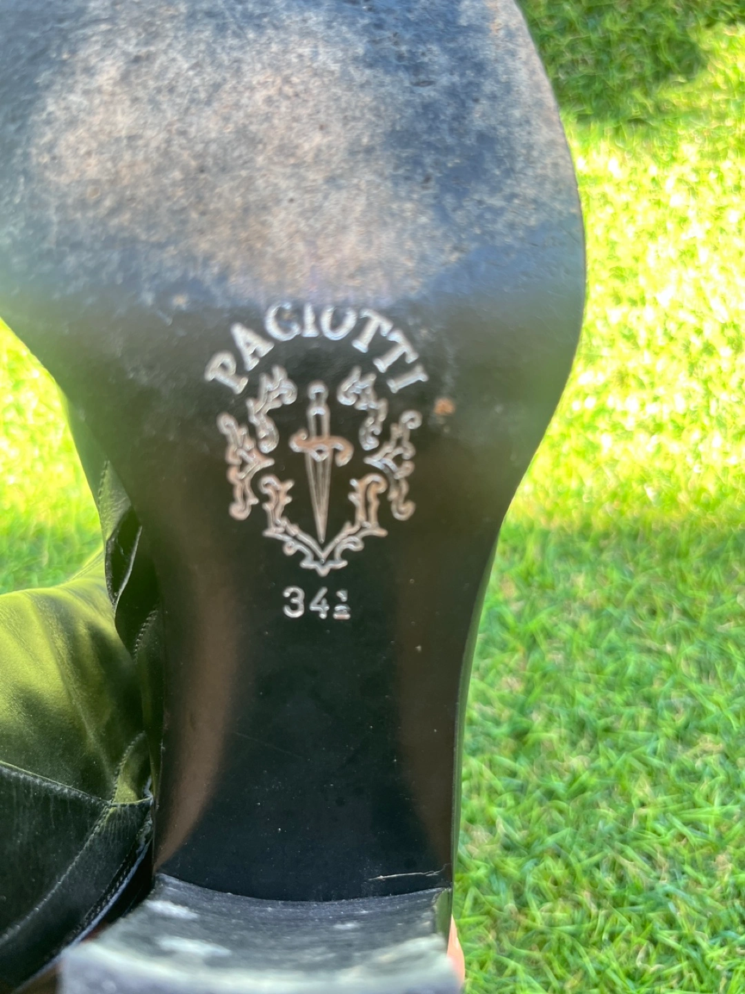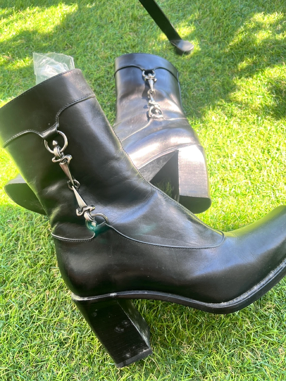 Selling a pair of Paciotti ankle boots in black leather. They are a size 34.5. These boots have a unique design with a block heel and decorative chain detail. They are in good condition and ready for a new home