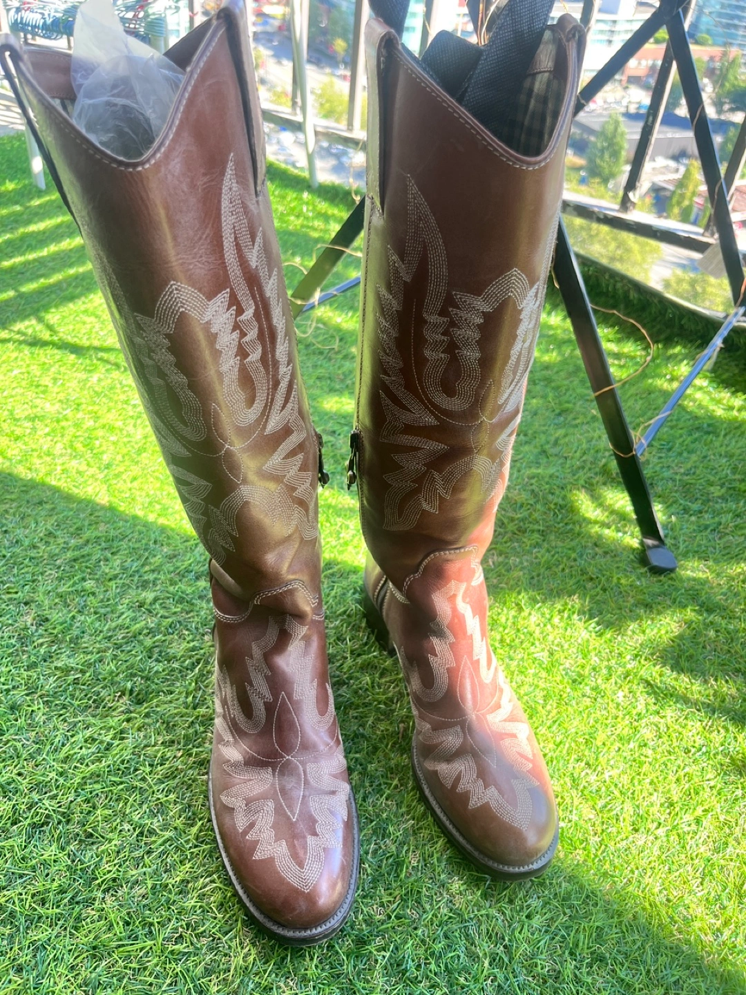 Selling a pair of Donald Pliner women's cowboy boots in a lovely brown leather! They're a size 8 and have a stylish western design with decorative stitching. Perfect for adding a touch of flair to your wardrobe!