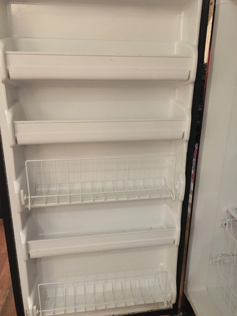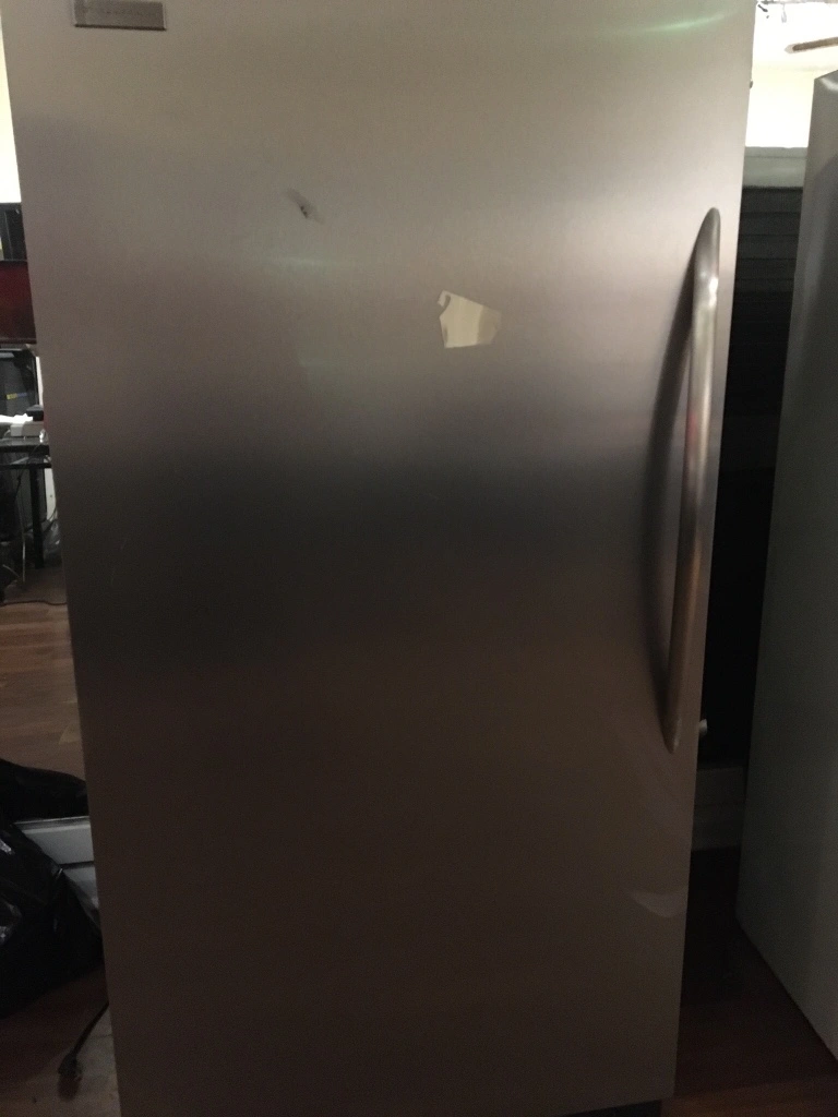 Selling a Frigidaire refrigerator with a stainless steel finish in front, and black sides. It's in good working condition and ready for a new home. The fridge includes interior shelving and door storage compartments. The depth is approximately 2 ft. Width 1 ft 32 inches. High 5ft.