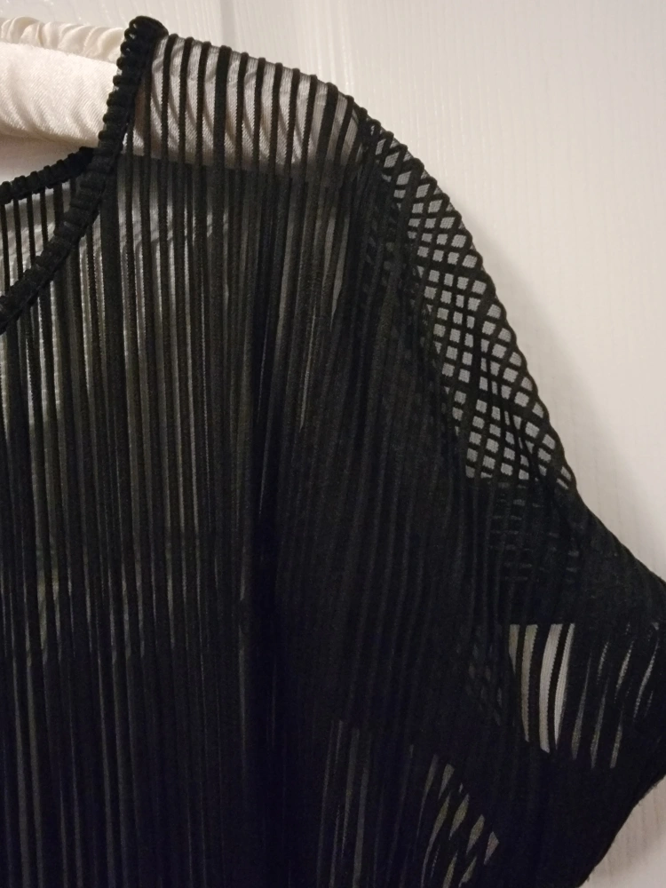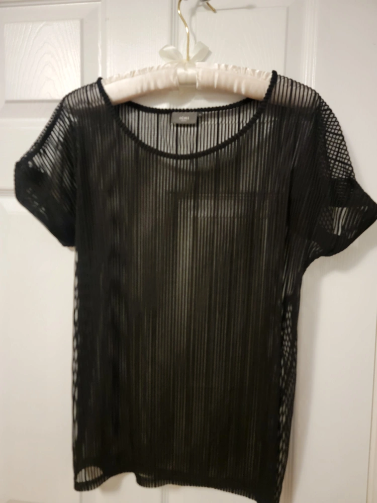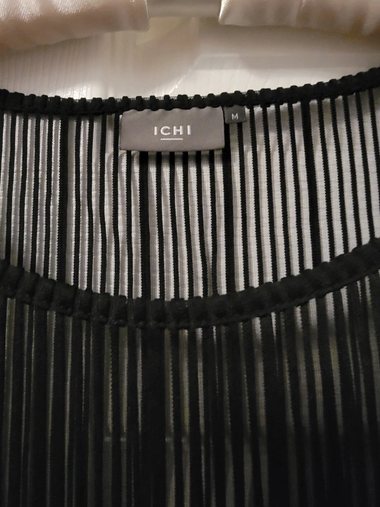 Here's a stylish black striped top from ICHI in size M! It features a unique design with vertical stripes and a sheer, lightweight fabric. Perfect for adding a touch of elegance to your wardrobe