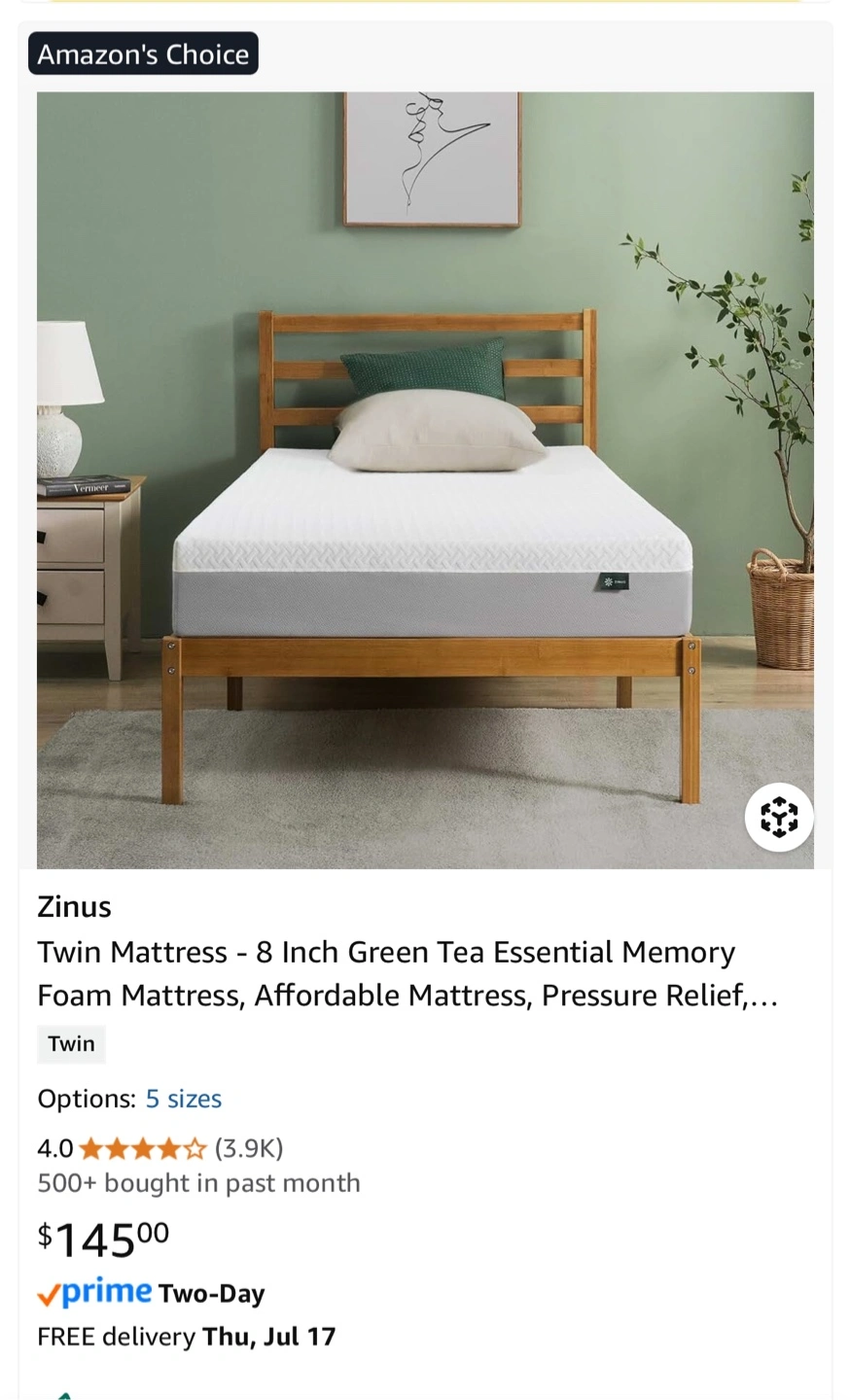 Selling Zinus Twin Mattress, 8-inch green tea essential memory foam mattress. This mattress offers pressure relief and is an affordable option for a comfy sleep! This is brand new, never used! Selling because it doesn’t fit on the bed frame I intended to use it on. $120