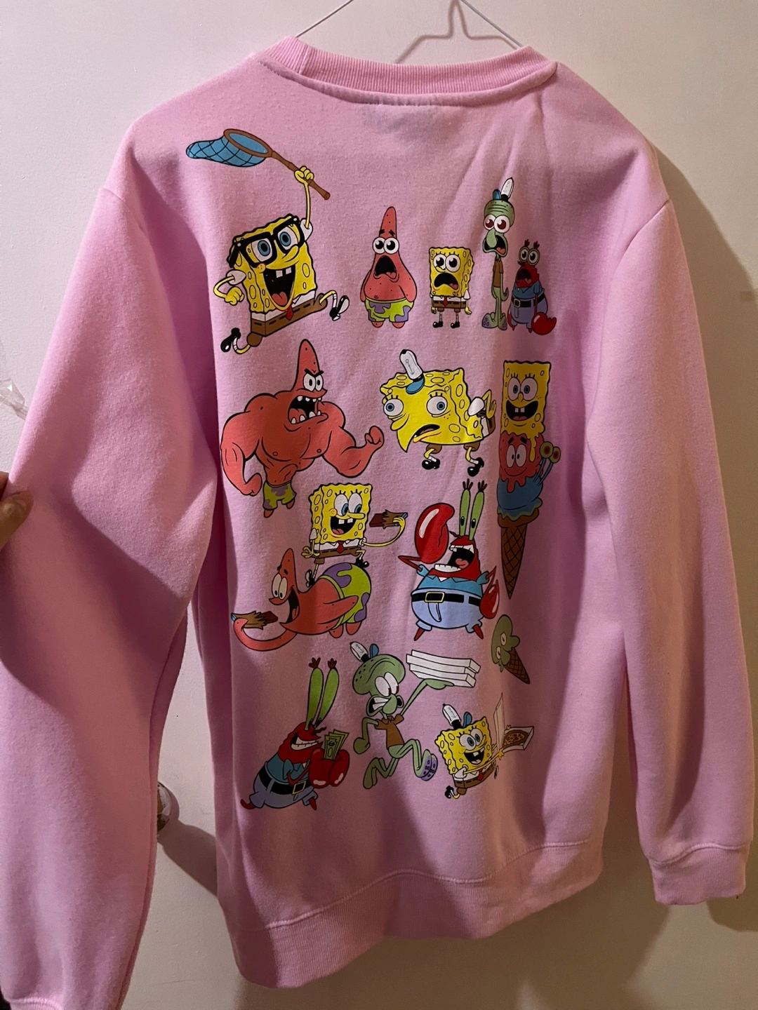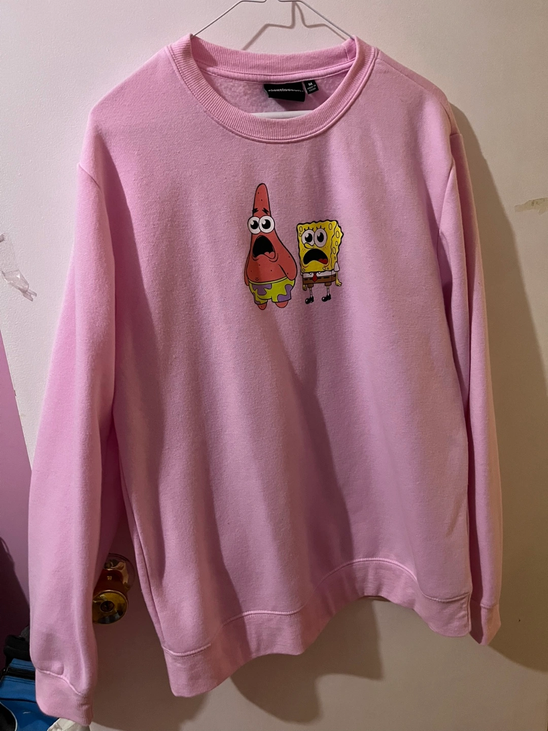 Super cute pink crewneck sweatshirt featuring Spongebob and Patrick! It's a size medium and made of 60% cotton and 40% polyester. Perfect for any Spongebob fan!