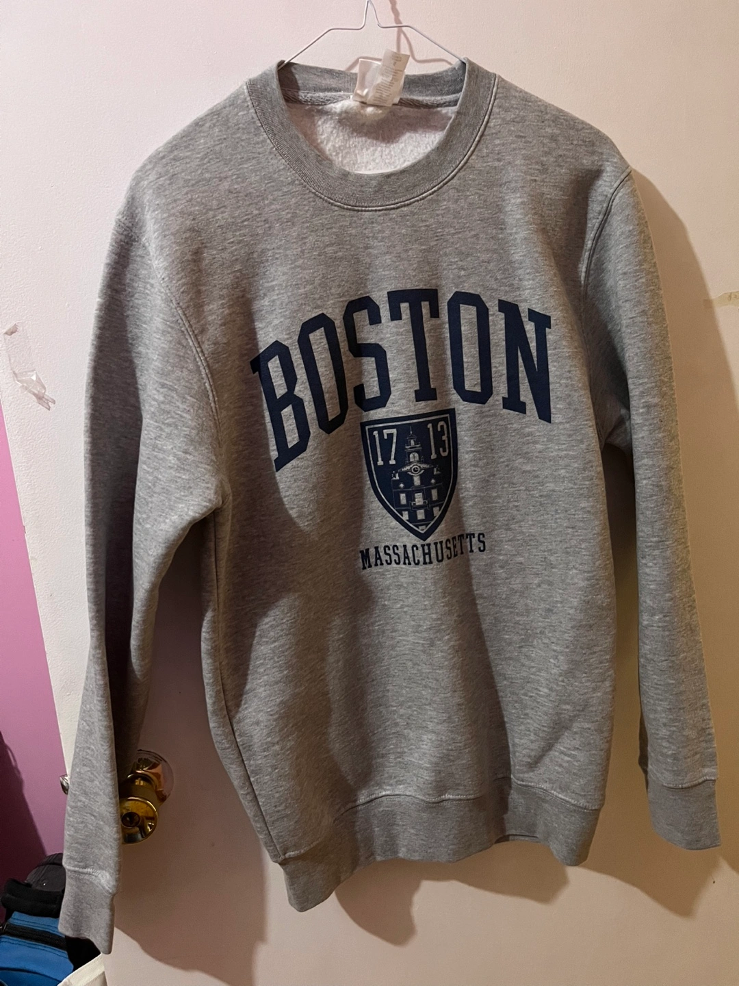 Selling a comfy grey Boston Massachusetts sweatshirt in size small! It's made from a blend of 70% cotton, 20% polyester, and 10% recycled polyester. The sweatshirt is in great condition because I wore it one time only.