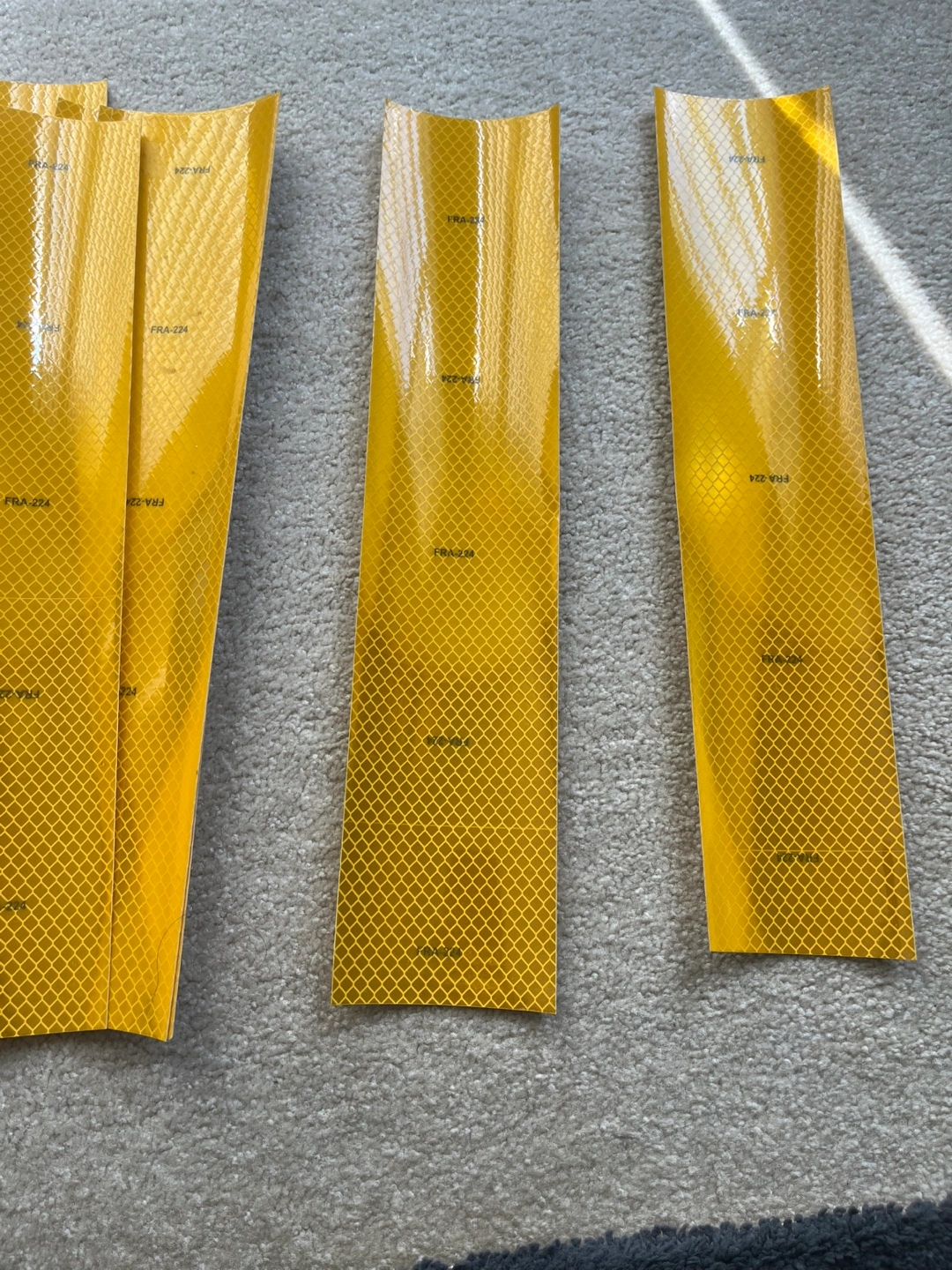 Selling some yellow reflective strips, marked with FRA-224. They're about 19 inches long and ready to add some visibility to your projects. All 8 for $10