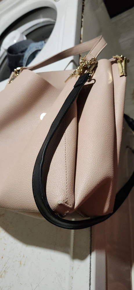 Selling a cute beige shoulder bag! It has a black strap and a front pocket with a gold clasp. Perfect for everyday use! inside seam.is ripped needs sewing .on edges