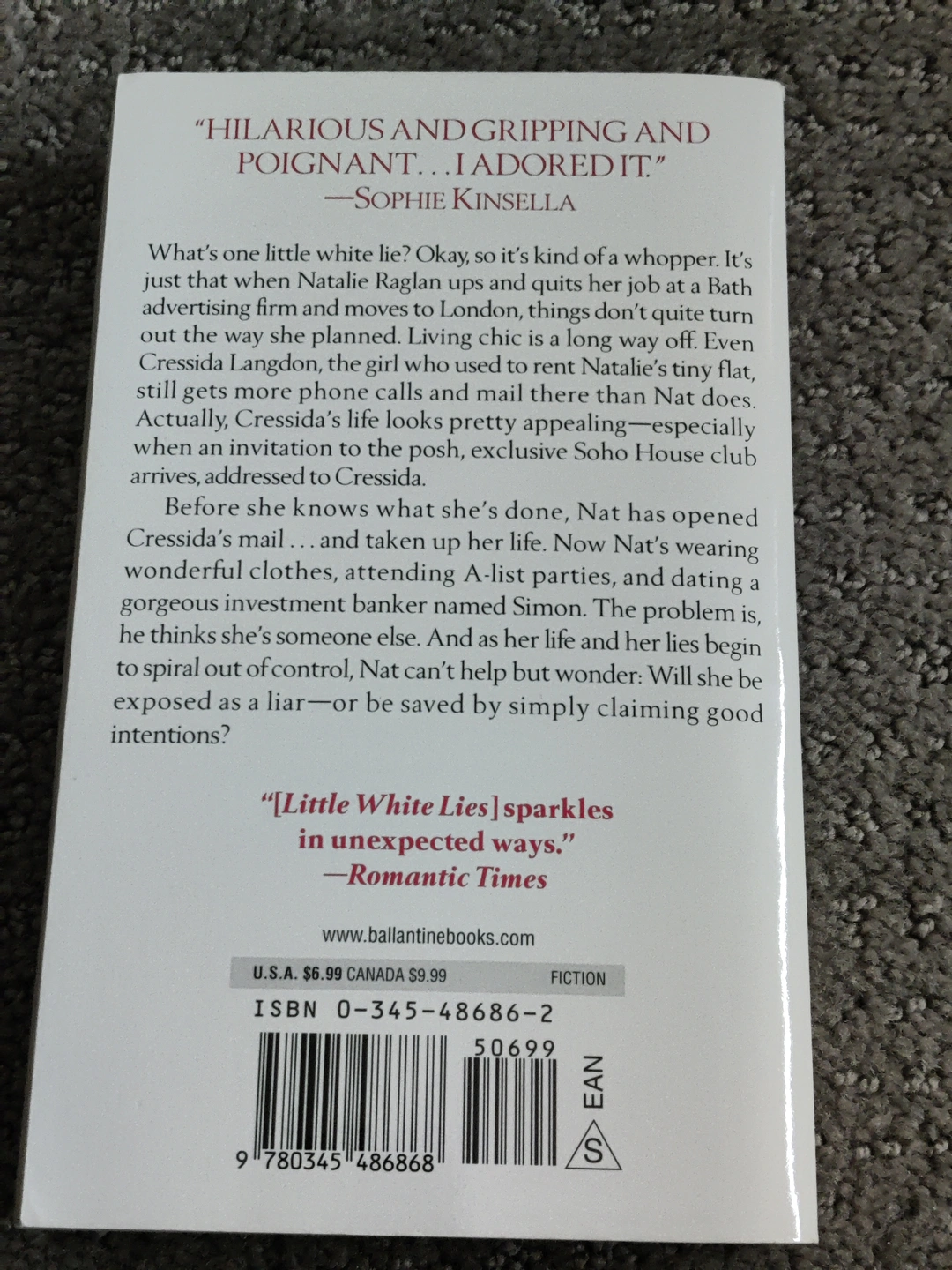 174I am selling a book Little White Lies: A Novel of Love and Good Intentions in used, great condition. Author: Gemma Townley Pages: 299 Type: Paperback Genre: Chick Lit, Romance, Adult Fiction, Contemporary Romance, Humor, Love Comes from a pet and smoke-free environment. Pickup in Mount Pleasant (NW Calgary)