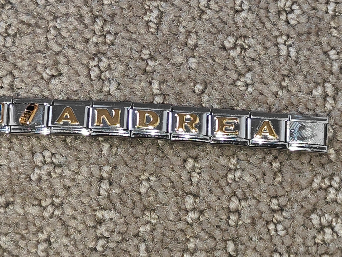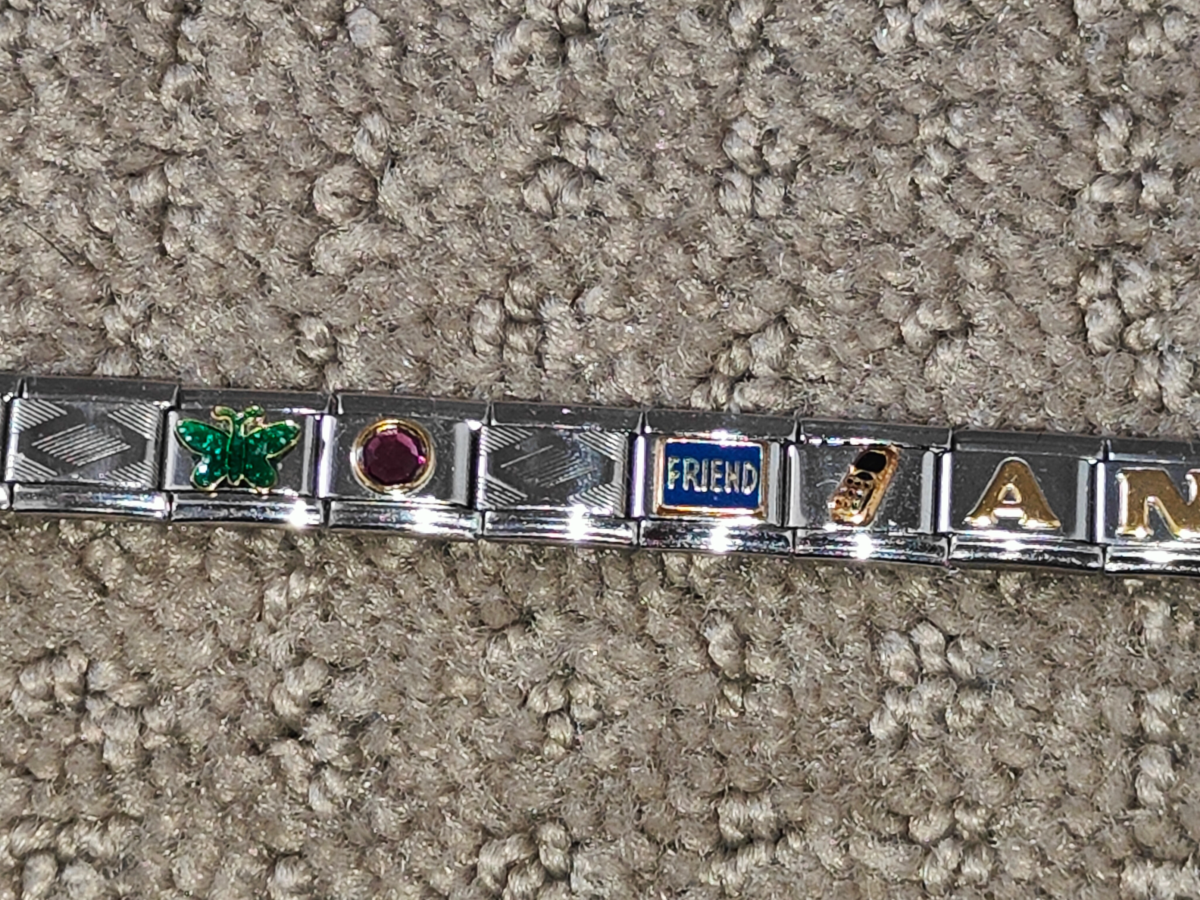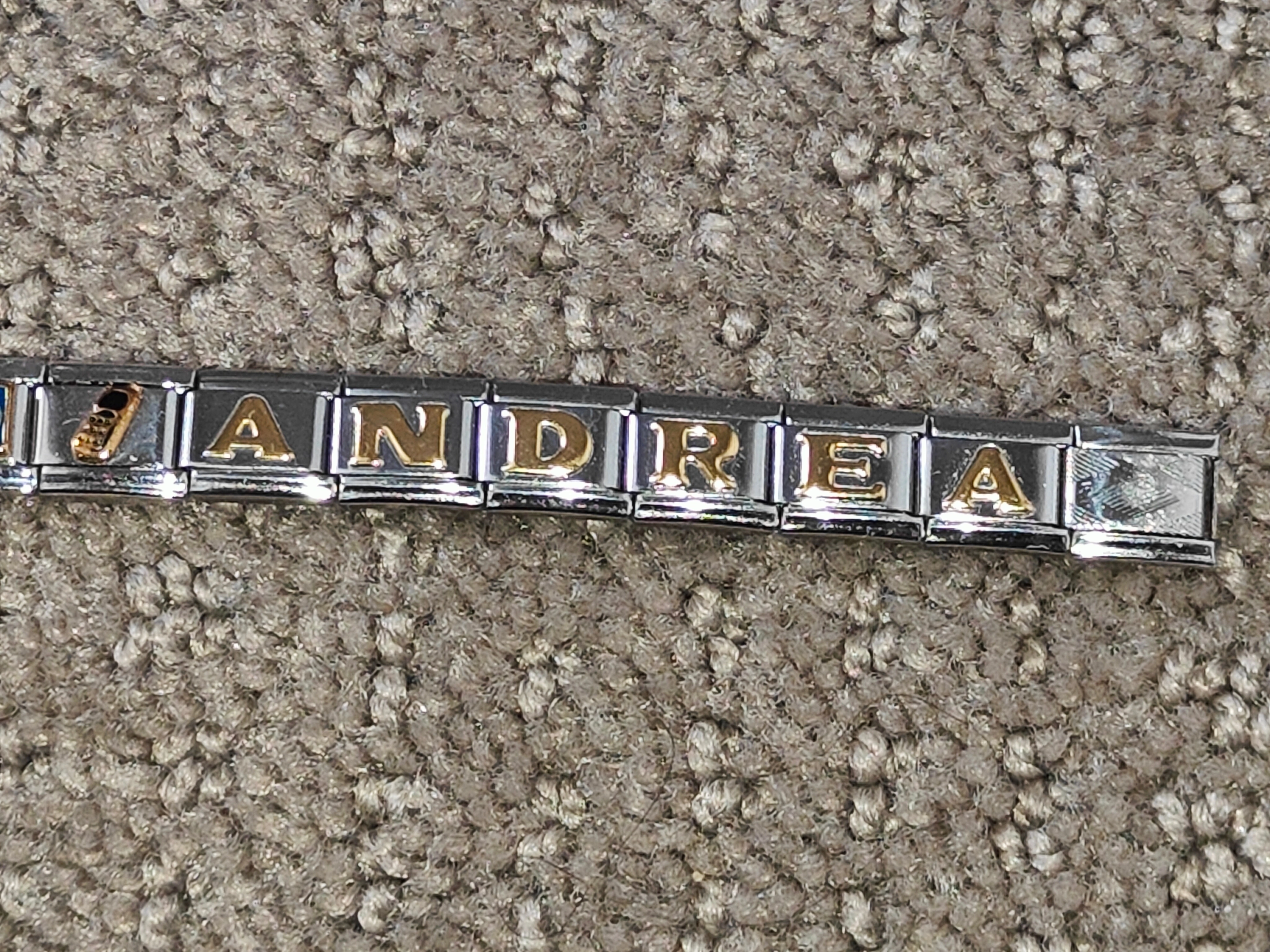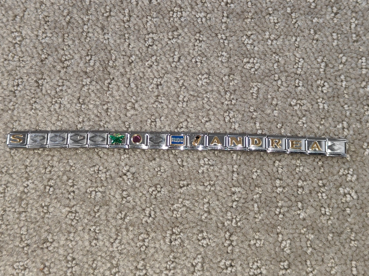 174NOTE: Please see dimensions below for the length of the bracelet. I am selling a Friendship Jewelery Bracelets that is made from Stainless Steel in used, excellent condition. The bracelet has some stretch to place over the wrist. Zoppini Stainless Steel and Cool Links. Contains jewelry charms including a green butterfly, Friend badge, mobile cell phone, purple amethyst stone, and the name Andrea. Includes the gift box with the name Andrea on the box. Dimensions: * 17 Links * Unstretched Length: 7-1/8" * Stretched Length: 9-1/4" * Width: 8mm Comes from a pet and smoke-free environment. Pickup in Mount Pleasant (NW Calgary)