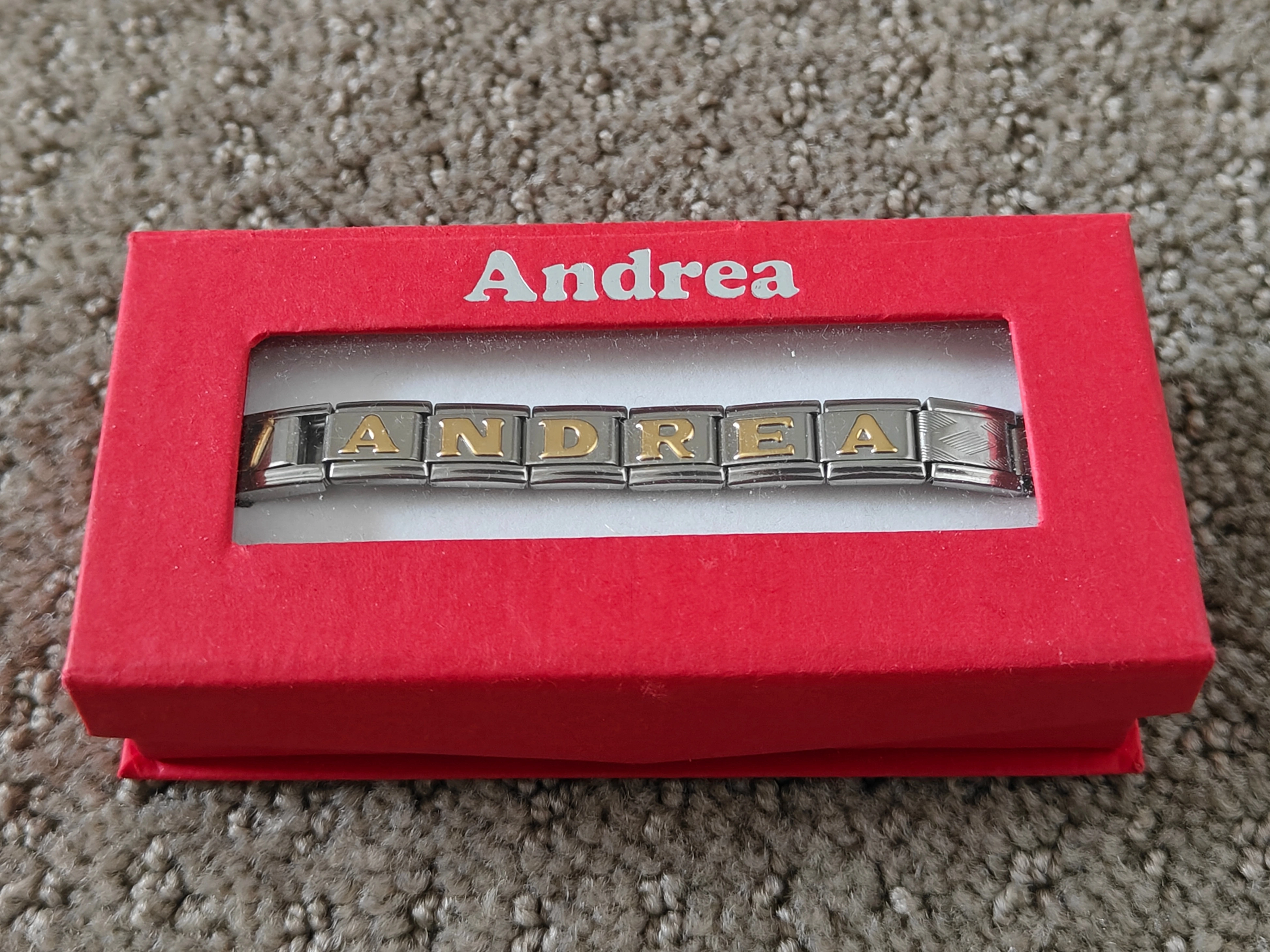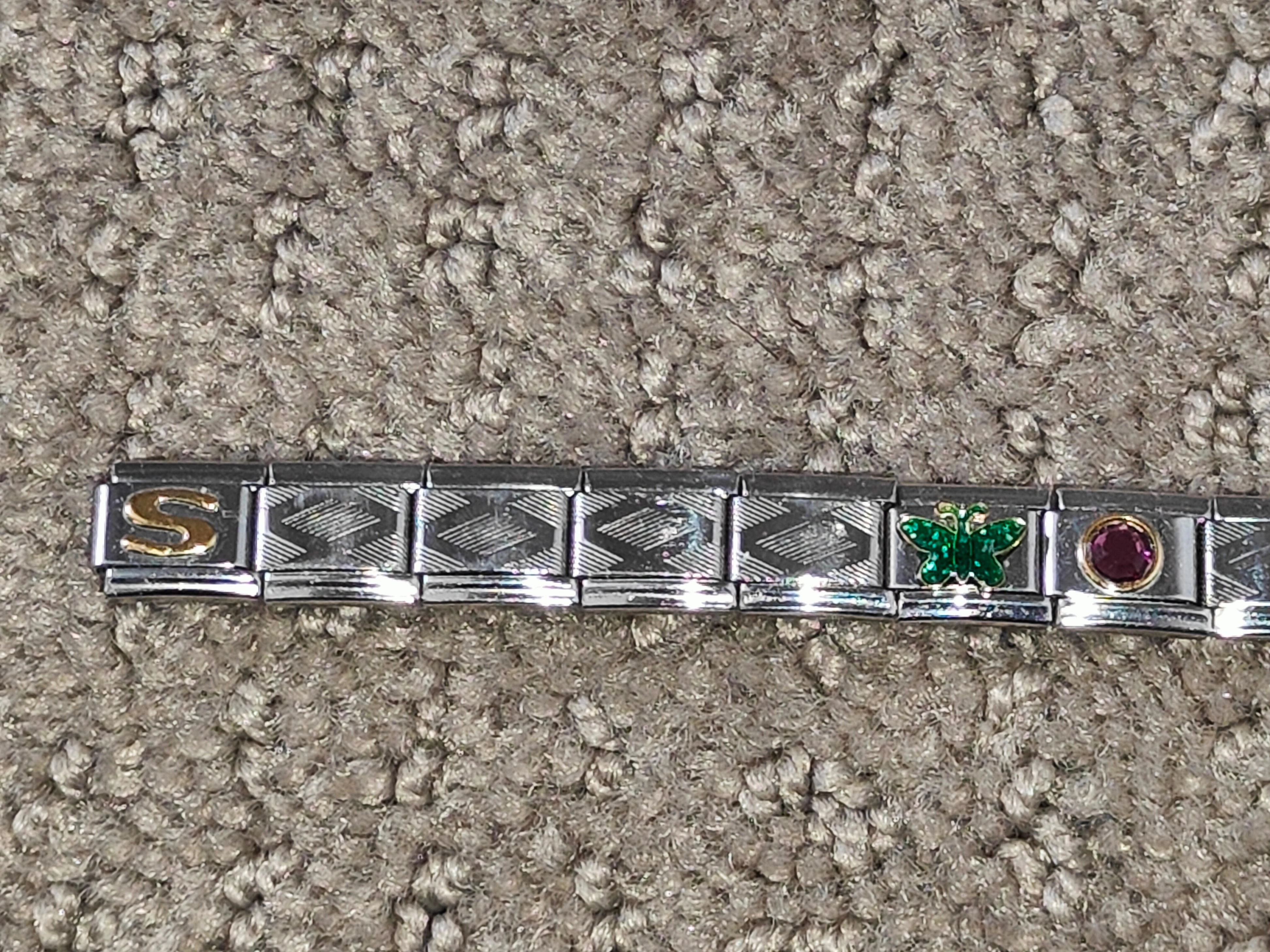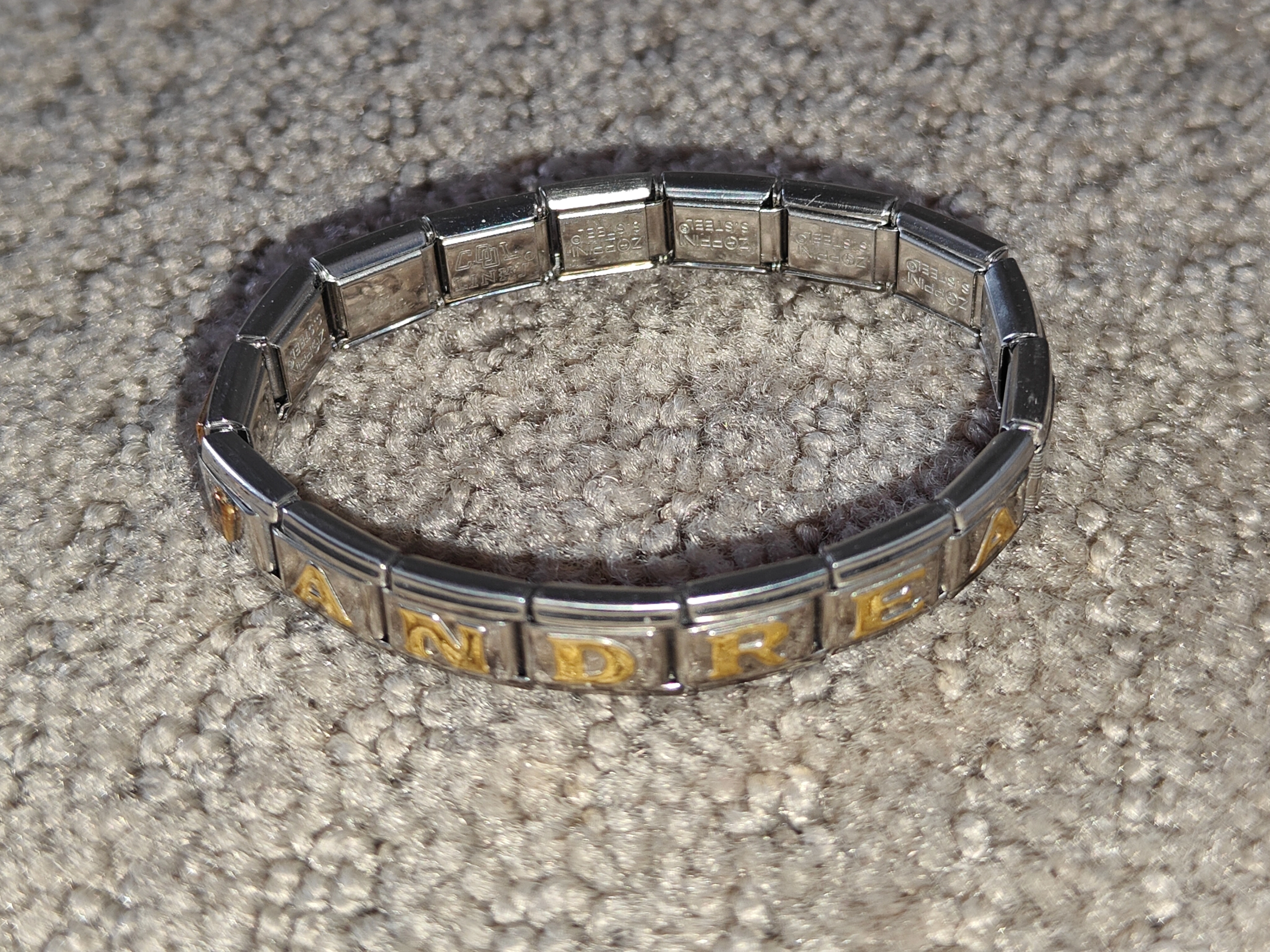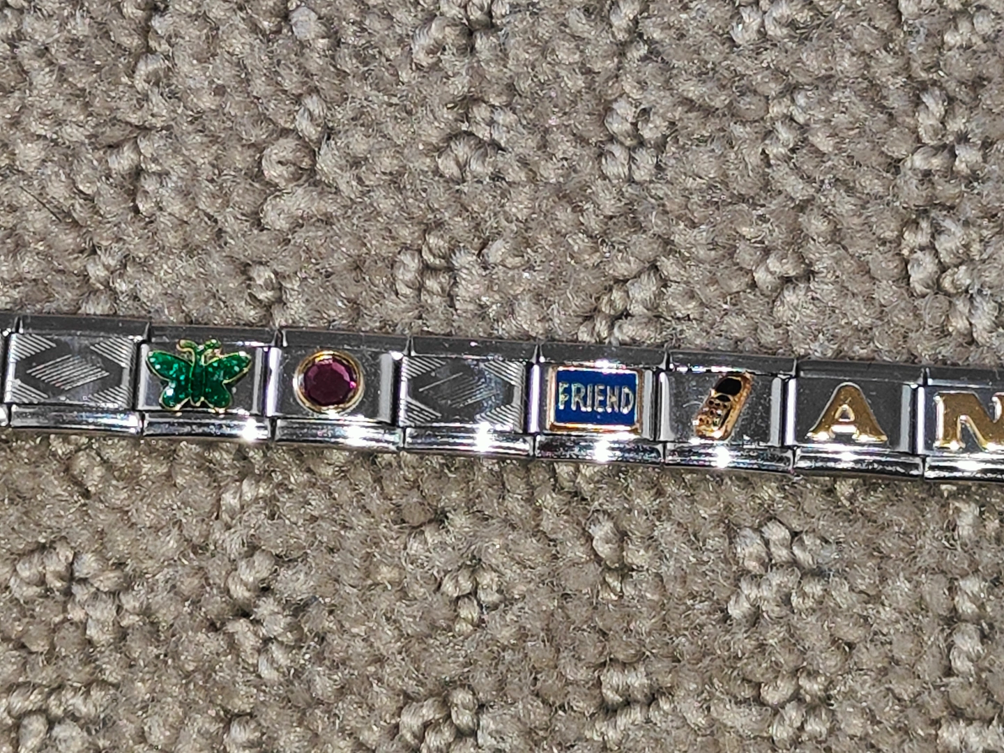 174NOTE: Please see dimensions below for the length of the bracelet. I am selling a Friendship Jewelery Bracelets that is made from Stainless Steel in used, excellent condition. The bracelet has some stretch to place over the wrist. Zoppini Stainless Steel and Cool Links. Contains jewelry charms including a green butterfly, Friend badge, mobile cell phone, purple amethyst stone, and the name Andrea. Includes the gift box with the name Andrea on the box. Dimensions: * 17 Links * Unstretched Length: 7-1/8" * Stretched Length: 9-1/4" * Width: 8mm Comes from a pet and smoke-free environment. Pickup in Mount Pleasant (NW Calgary)