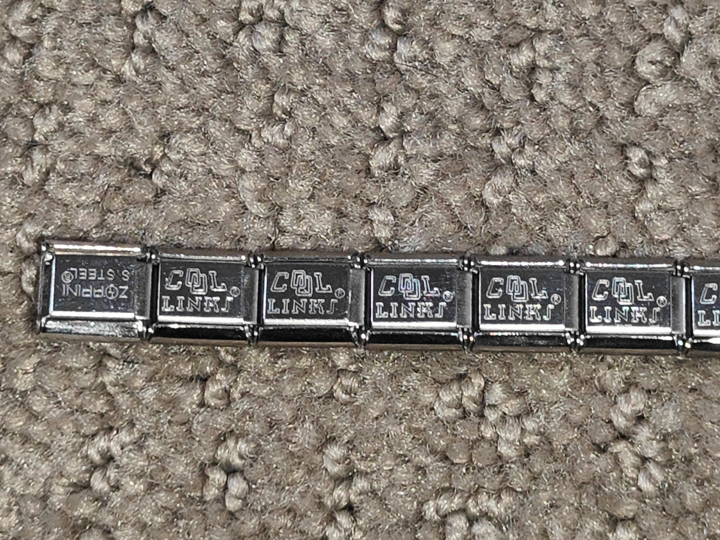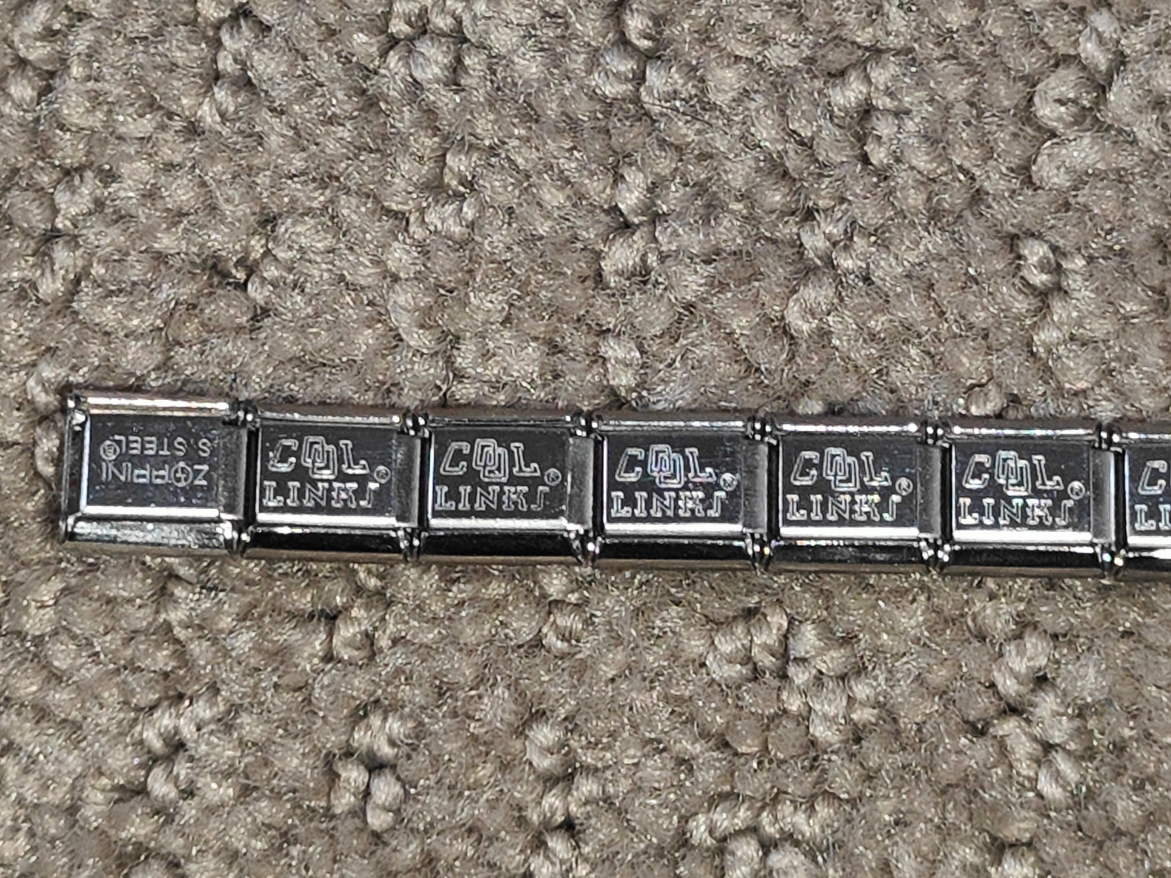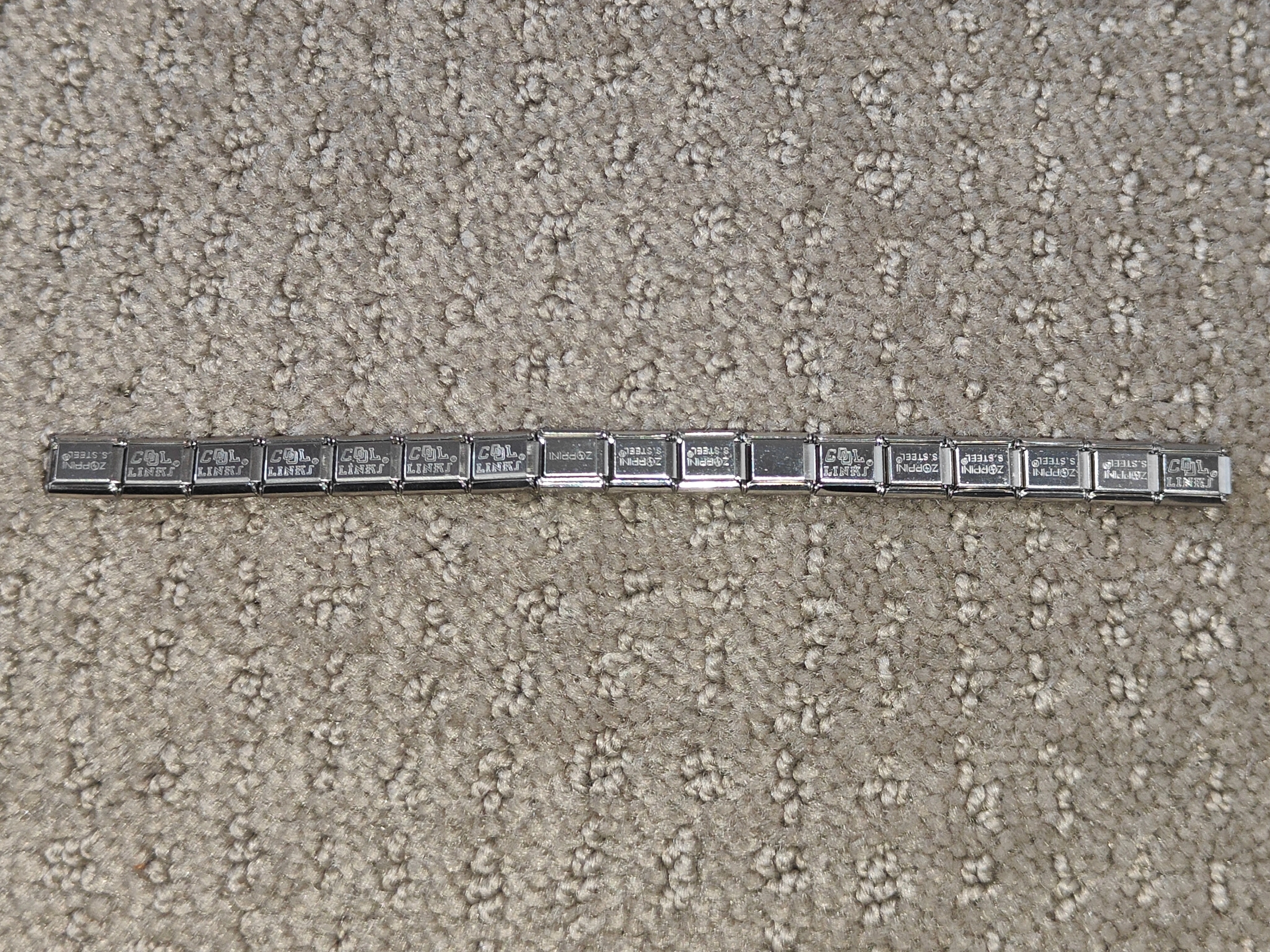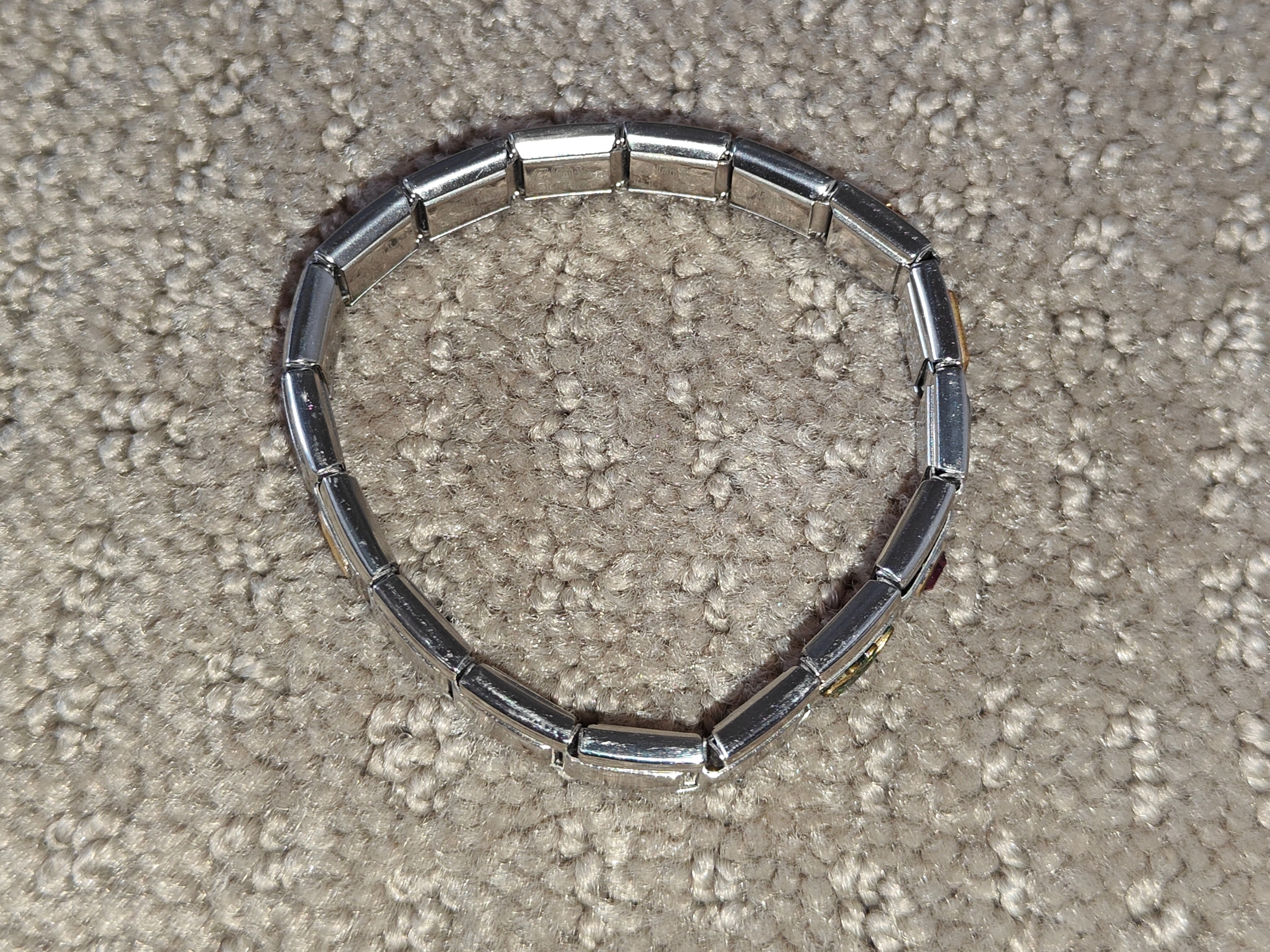 174NOTE: Please see dimensions below for the length of the bracelet. I am selling a Friendship Jewelery Bracelets that is made from Stainless Steel in used, excellent condition. The bracelet has some stretch to place over the wrist. Zoppini Stainless Steel and Cool Links. Contains jewelry charms including a green butterfly, Friend badge, mobile cell phone, purple amethyst stone, and the name Andrea. Includes the gift box with the name Andrea on the box. Dimensions: * 17 Links * Unstretched Length: 7-1/8" * Stretched Length: 9-1/4" * Width: 8mm Comes from a pet and smoke-free environment. Pickup in Mount Pleasant (NW Calgary)
