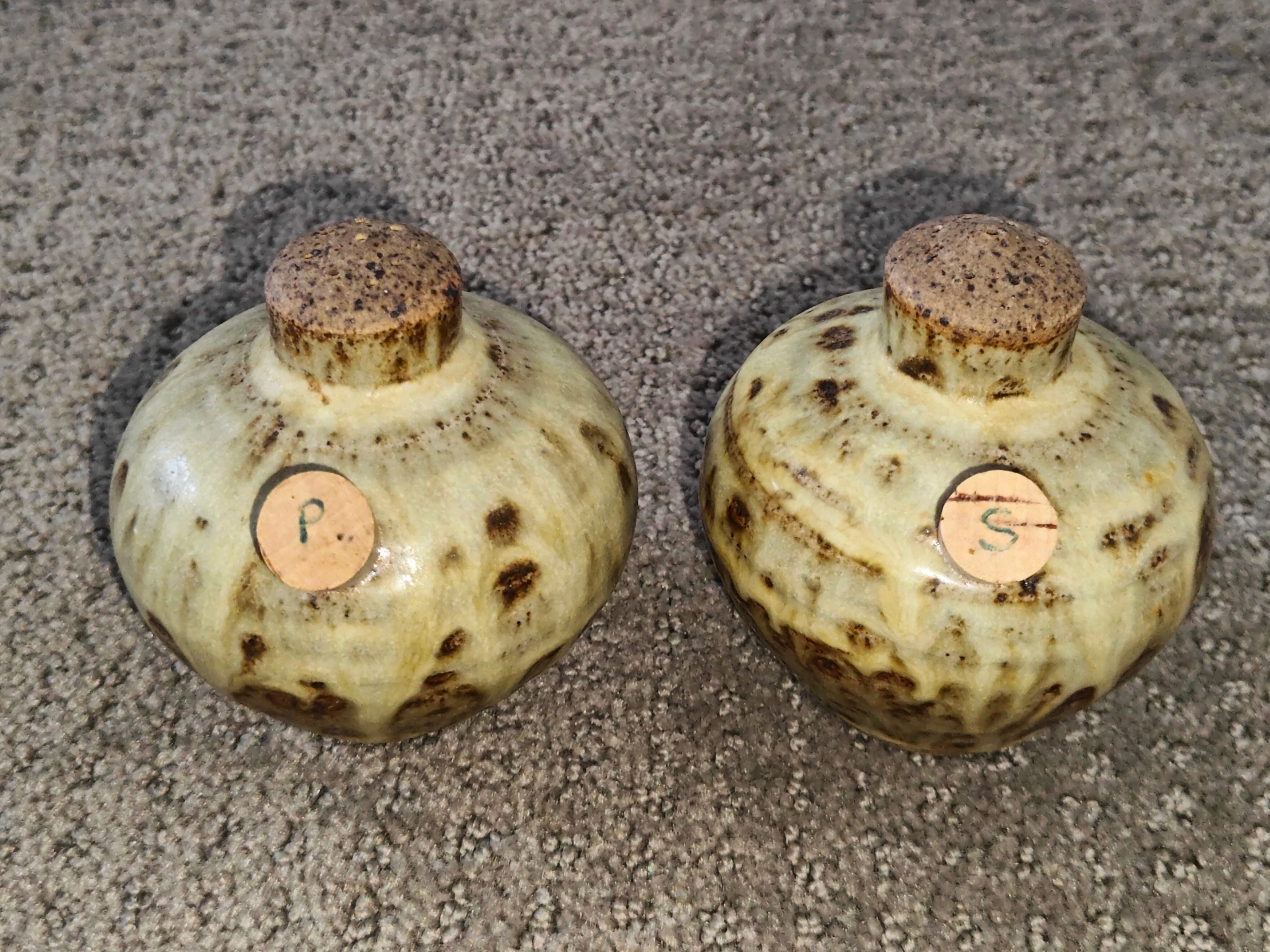174I am selling an Artisan Pottery Salt & Pepper Shakers - Rustic Glaze in used, excellent condition. No chips or cracks. Discover this exquisite set of artisan-made ceramic salt and pepper shakers. Each piece is hand-thrown and boasts a unique, textured glaze with warm brown and cream tones, reminiscent of natural stone. Signed by the artist on the bottom, these are not just functional, but also beautiful pieces of art for your home. The set includes cork stoppers for easy refilling, with clear 'S' and 'P' markings. A wonderful find for those who appreciate handcrafted items, unique pottery, unique home decor, anyone looking for distinctive kitchenware. Condition: Impeccable, with no chips or cracks whatsoever. Ready for immediate use or display. Dimensions: * Height: 3" * Base Diameter: 1-3/4" * Top Diameter: 1-1/8" * Widest Diameter: 3" Comes from a pet and smoke-free environment. Pickup in Mount Pleasant (NW Calgary)