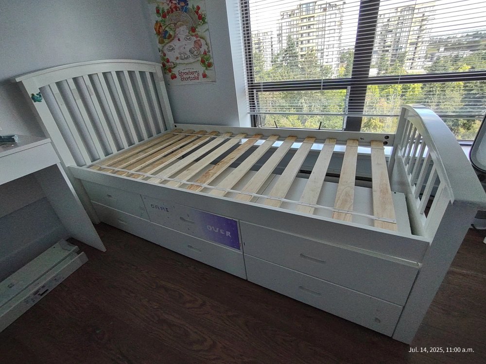 I am selling a white single bed frame that features six built-in storage drawers underneath. The drawers slide out easily, providing additional storage space and helping to keep things organized. This bed frame is perfect for small place.