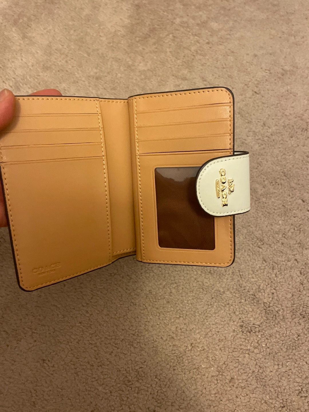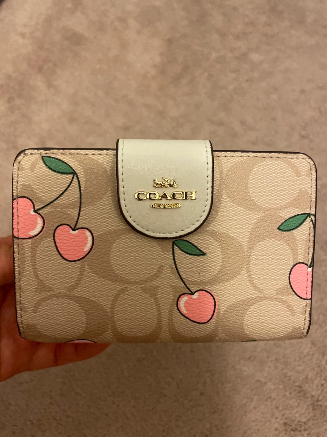 Selling a cute Coach snap wallet with a cherry print! It's in great condition and has lots of room for cards and cash. The wallet features the iconic Coach logo and a stylish design.