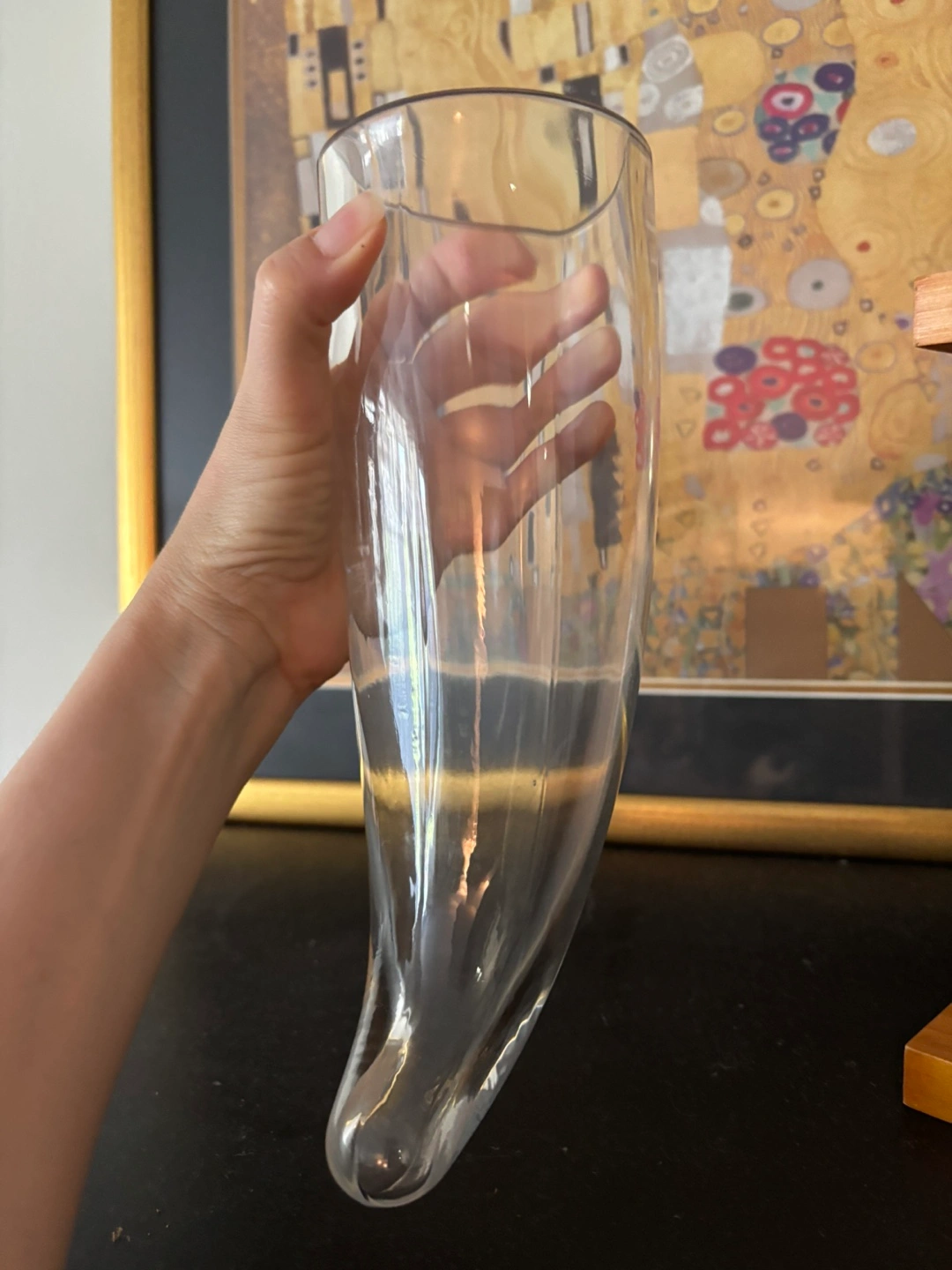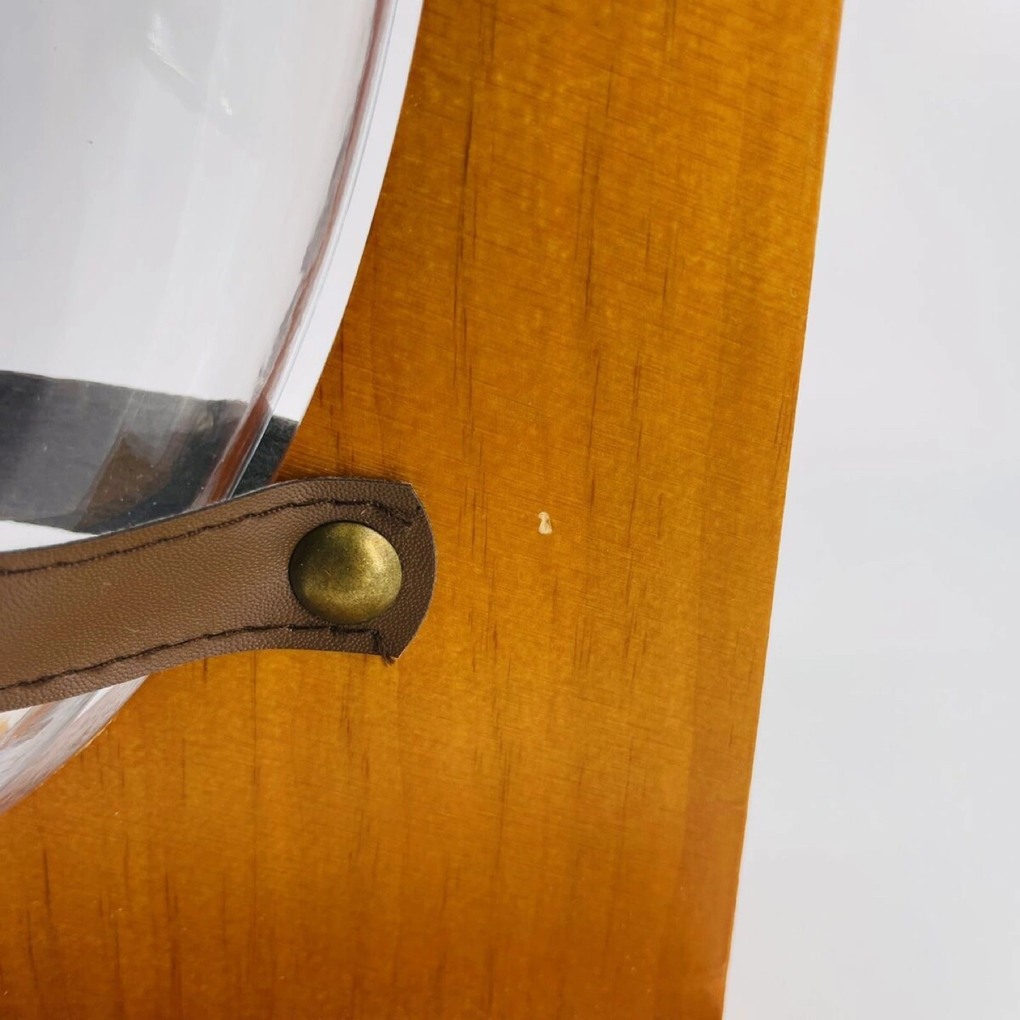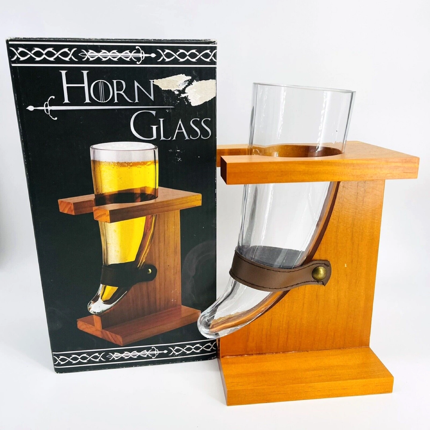 Selling a unique horn-shaped glass with a wooden stand! The glass is clear and features a brown leather-like strap detail.