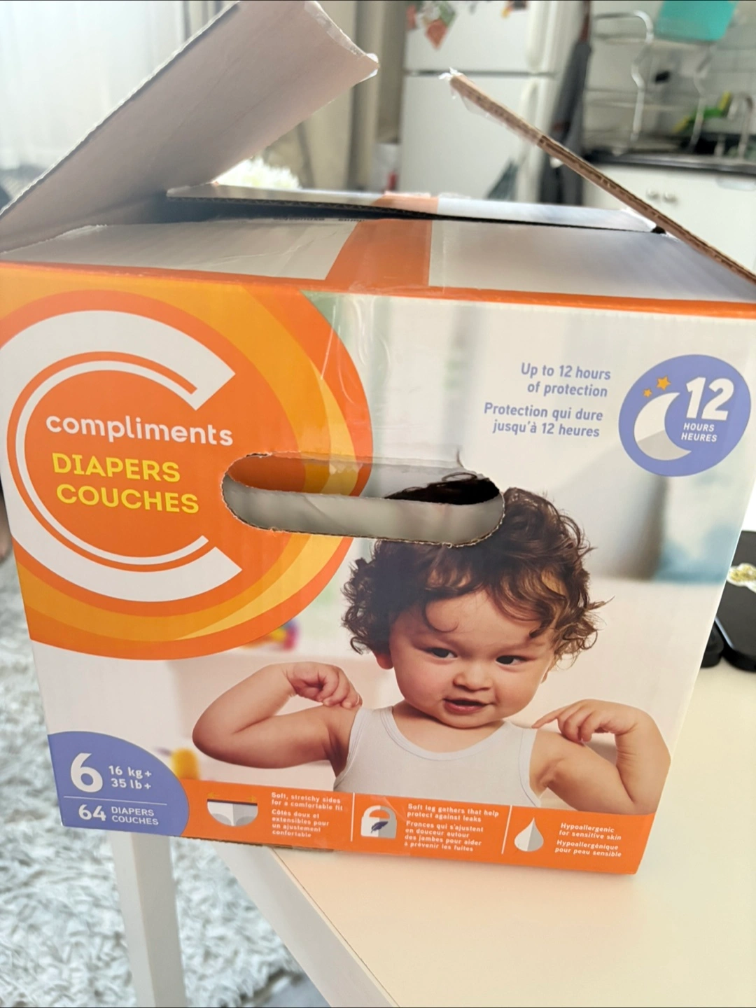 Selling a box of Compliments diapers, size 6. The box contains 61 diapers, offering up to 12 hours of protection. They have soft leg gathers and are hypoallergenic for sensitive skin.