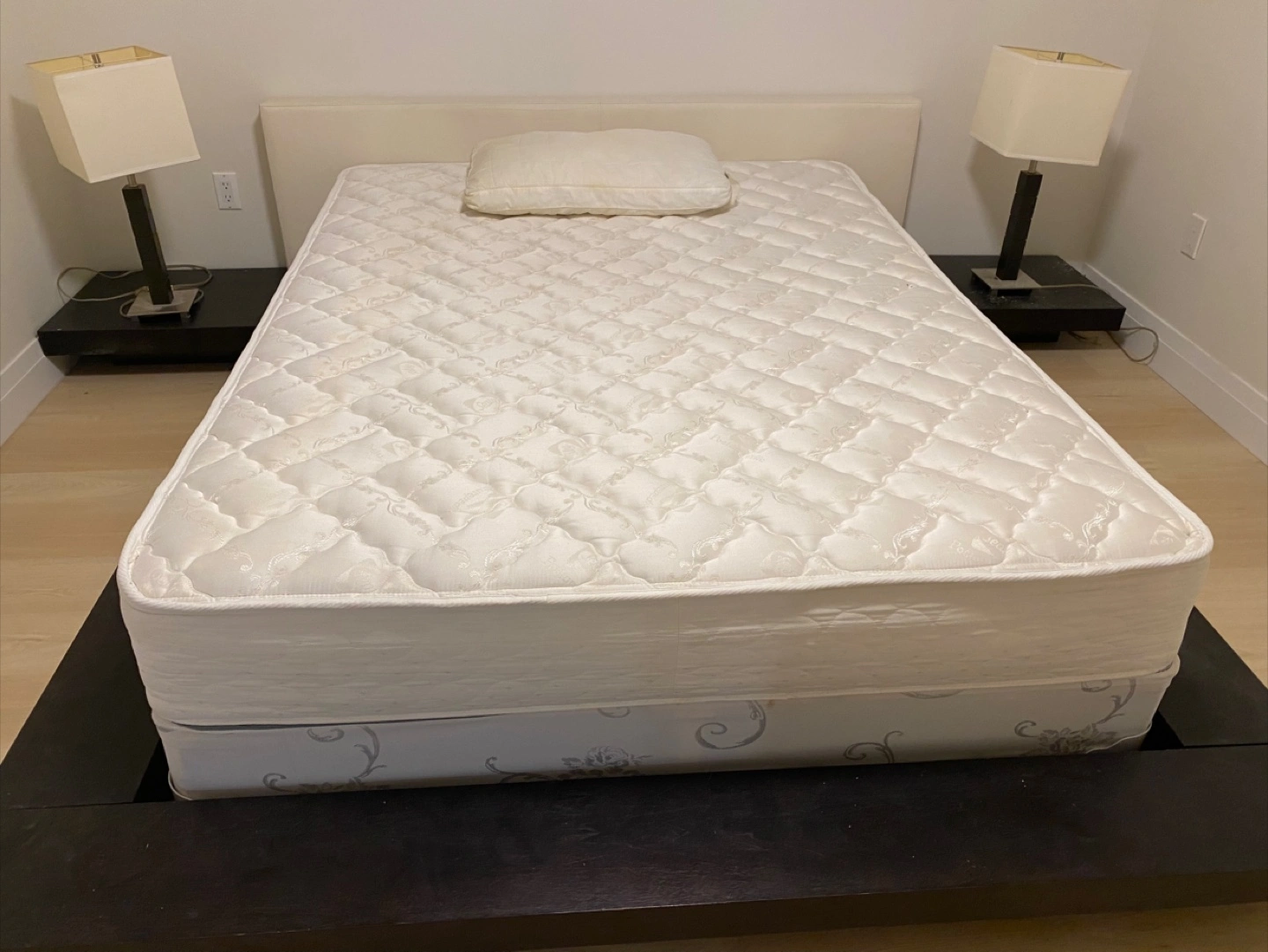 53Solid wood with side stand, Selling a queen size bed frame and mattress. The bed frame is a dark colour a boarder around the frame. The set bought at $3000. Moving sale