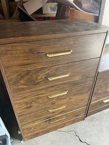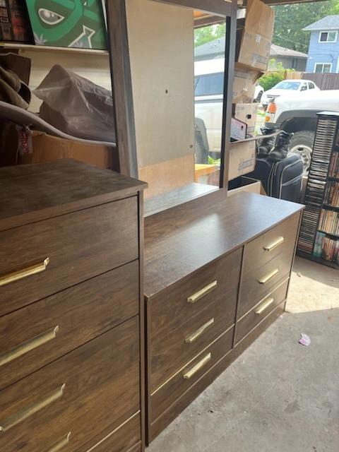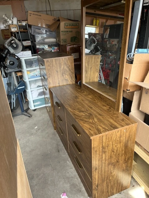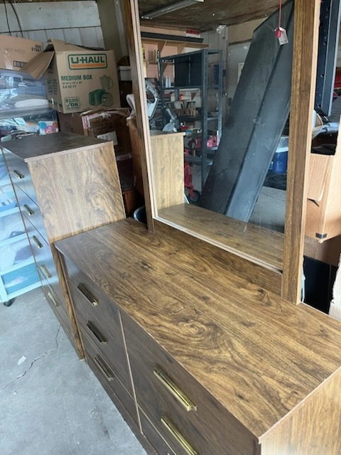 Here's a wood dresser 2 piece set with a mirror included. It's in good condition and has a nice, classic look. It would be perfect for adding some extra storage to your bedroom or dressing area. The dresser has multiple drawers for organizing your clothes and accessories