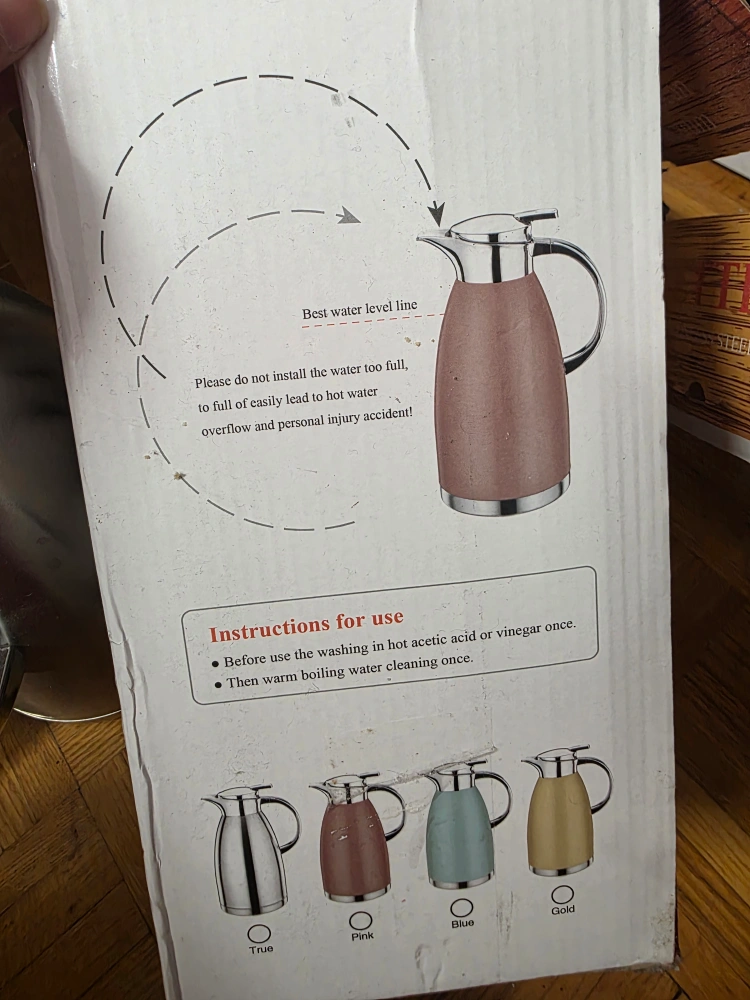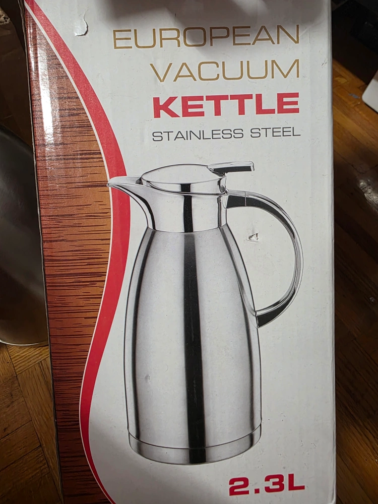 Selling a European Vacuum Kettle made of stainless steel. It's a 2.3L kettle and comes with the original box. The box includes instructions for use, such as washing in hot acetic acid or vinegar once before use and then warm boiling water cleaning once