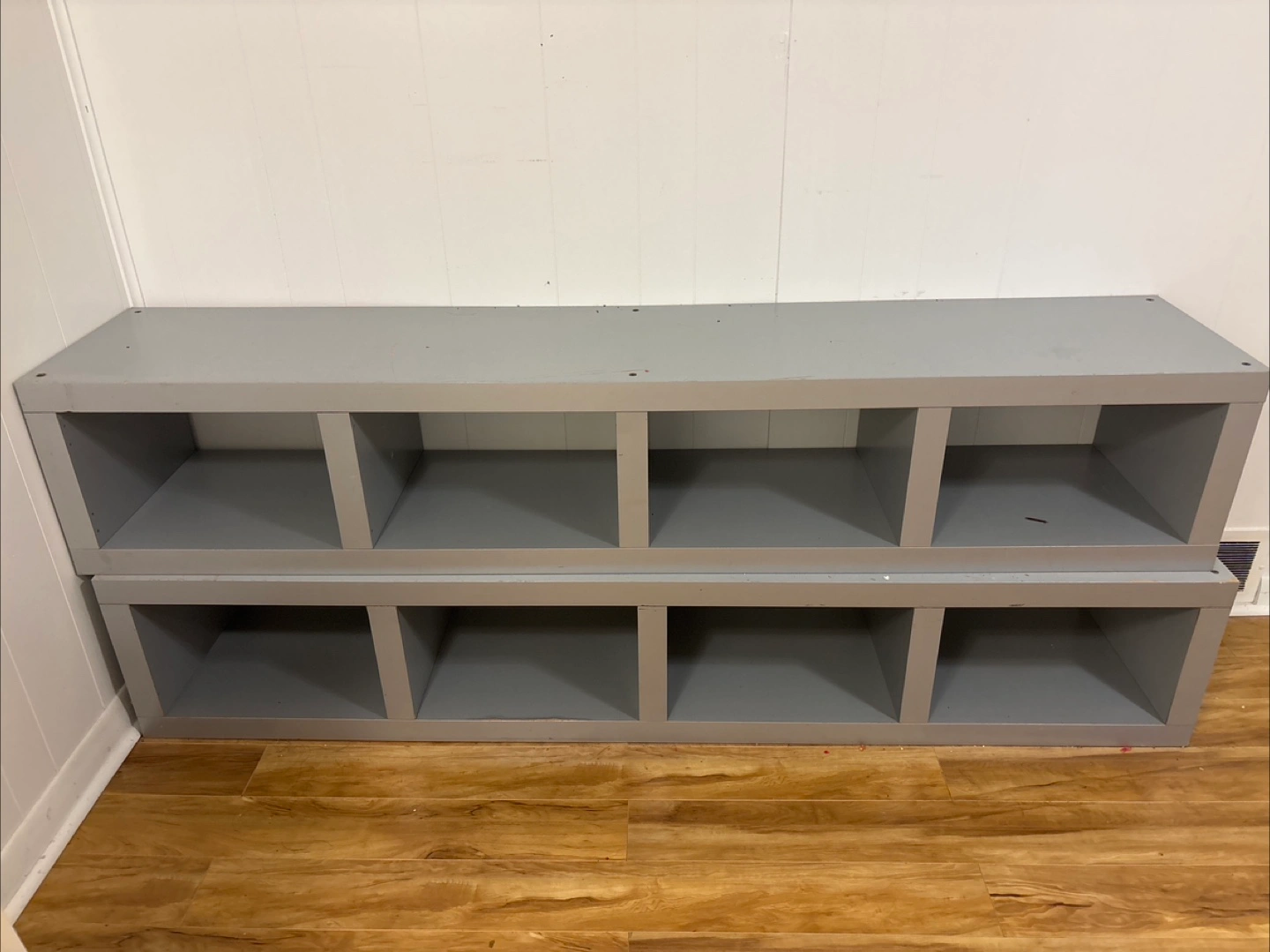 Selling a grey storage bench with cubbies! It's in good condition and perfect for organizing shoes, toys, or other items. It's a great addition to any entryway, mudroom, or playroom. $15 each